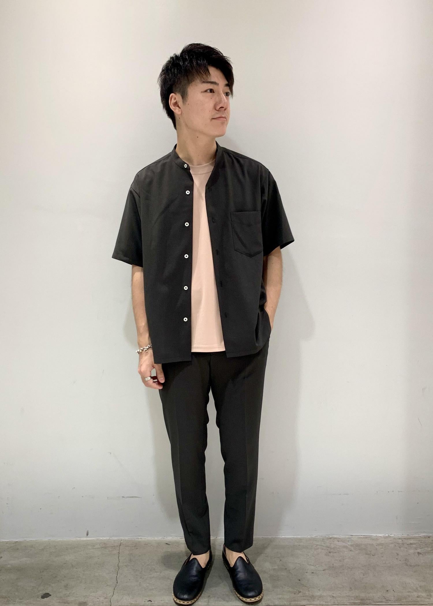 同素材のバンドカラー半袖シャツとのコーディネートもおすすめです!