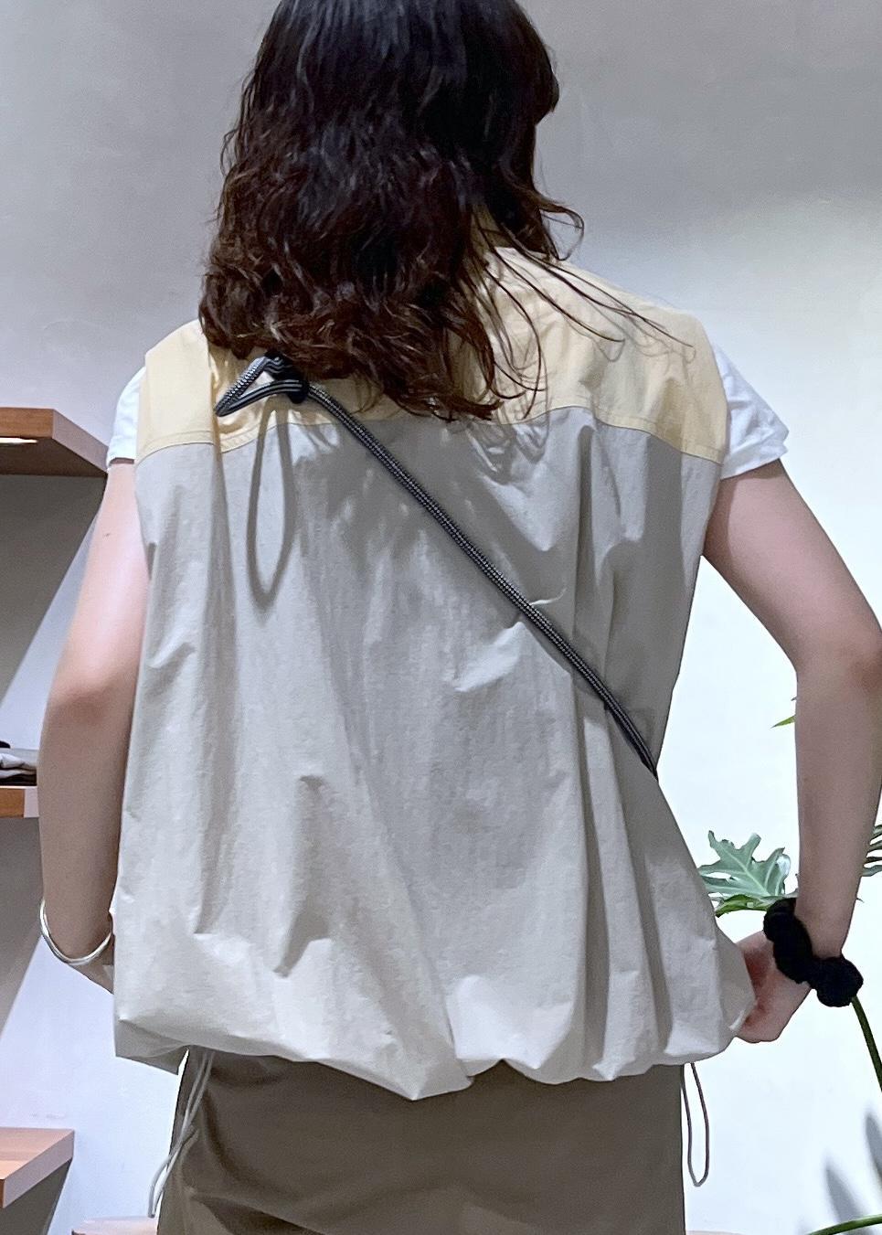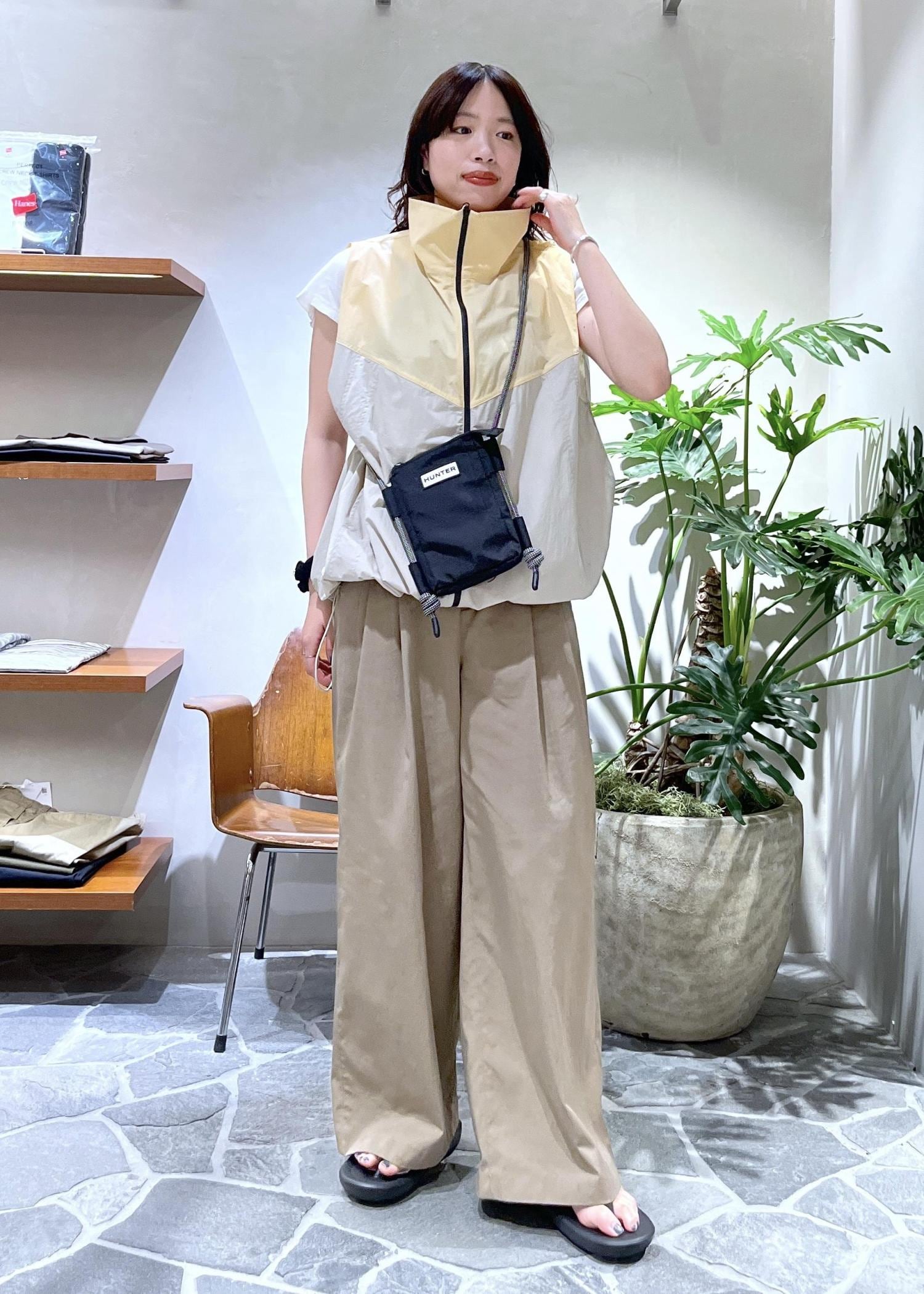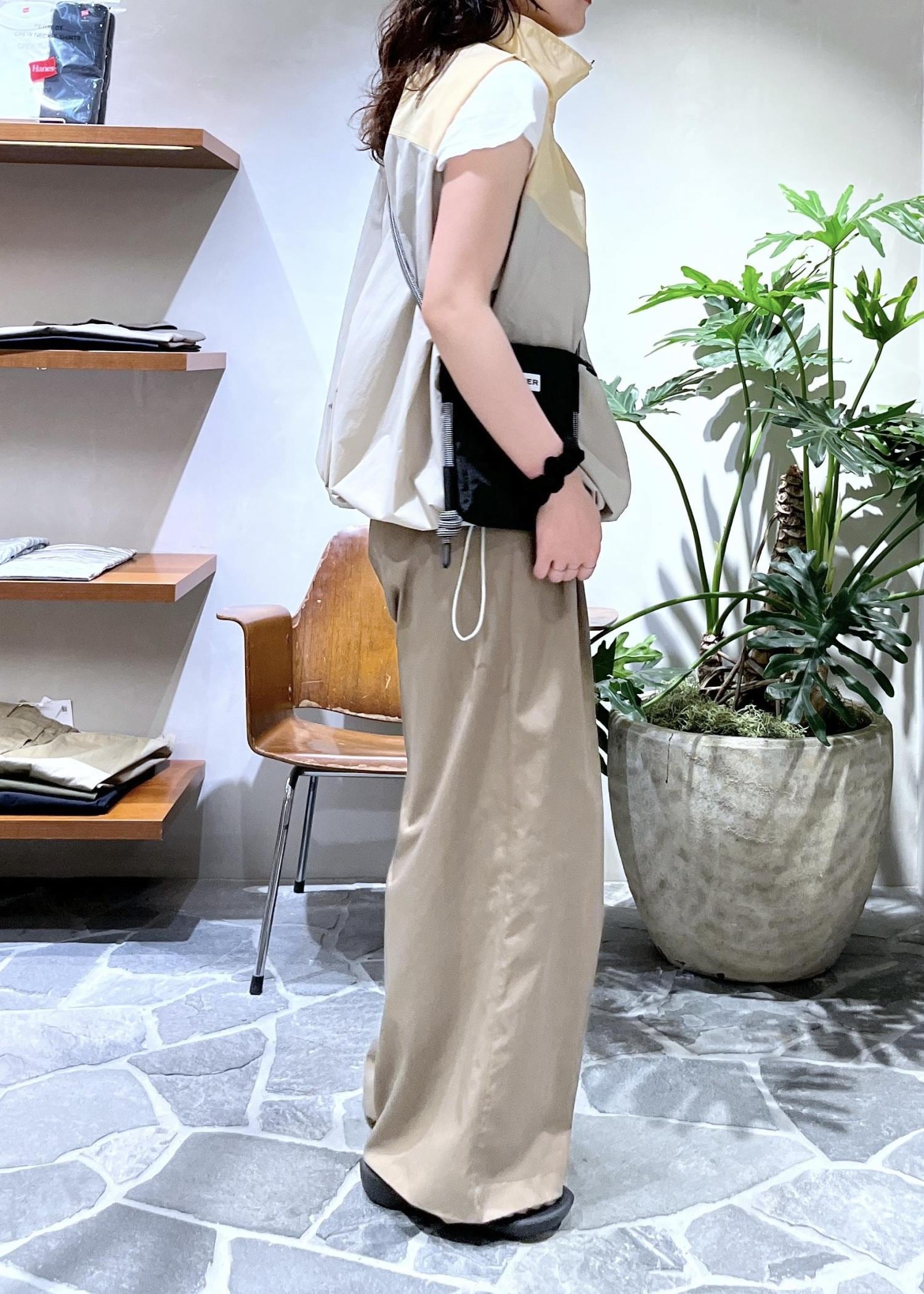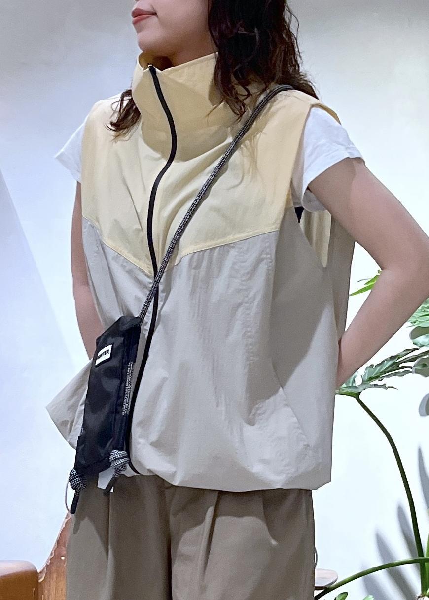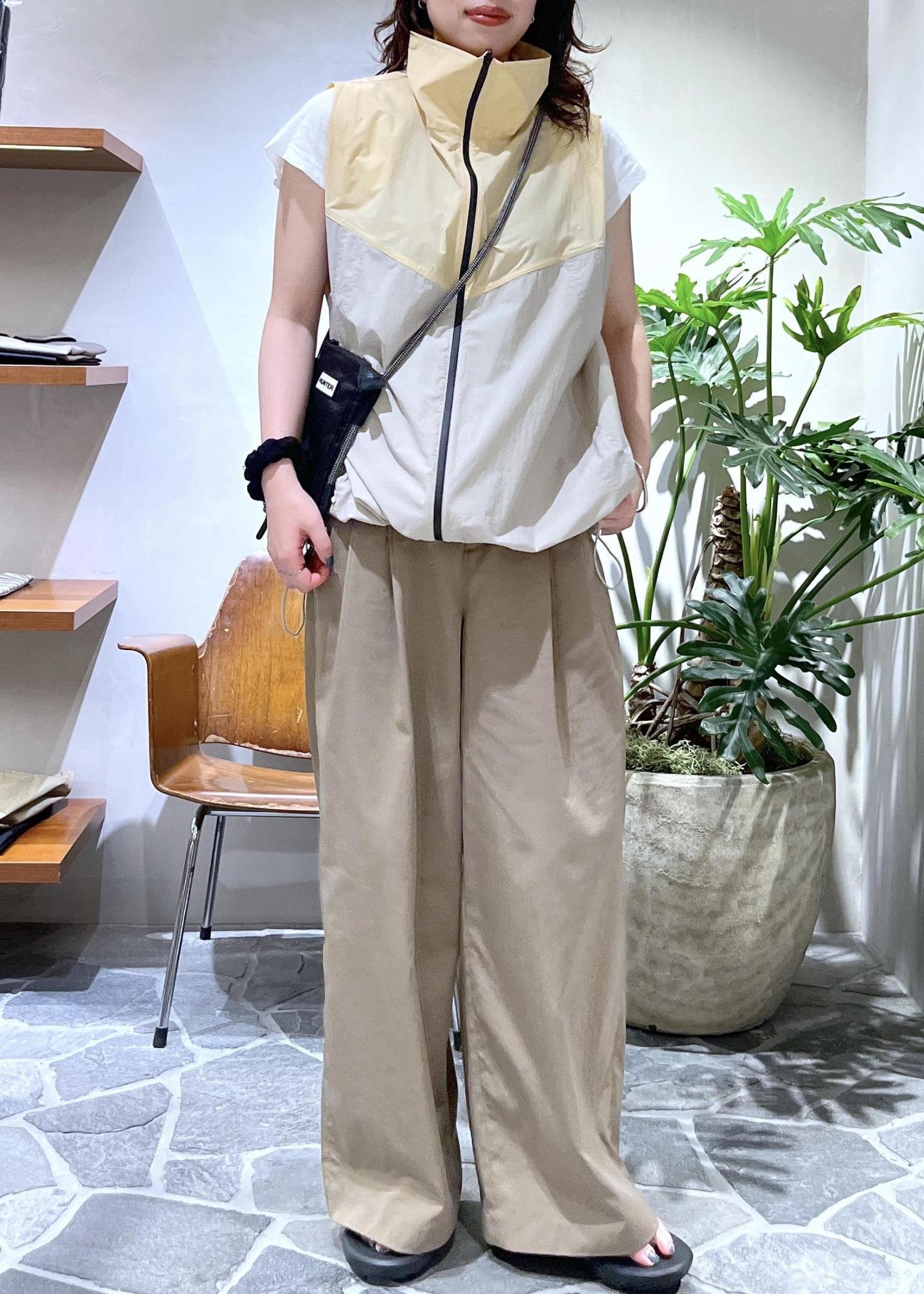 胸元のバイカラーデザインがアクセントのイエローのベストに、ベージュパンツを合わせワントーンにまとめました!