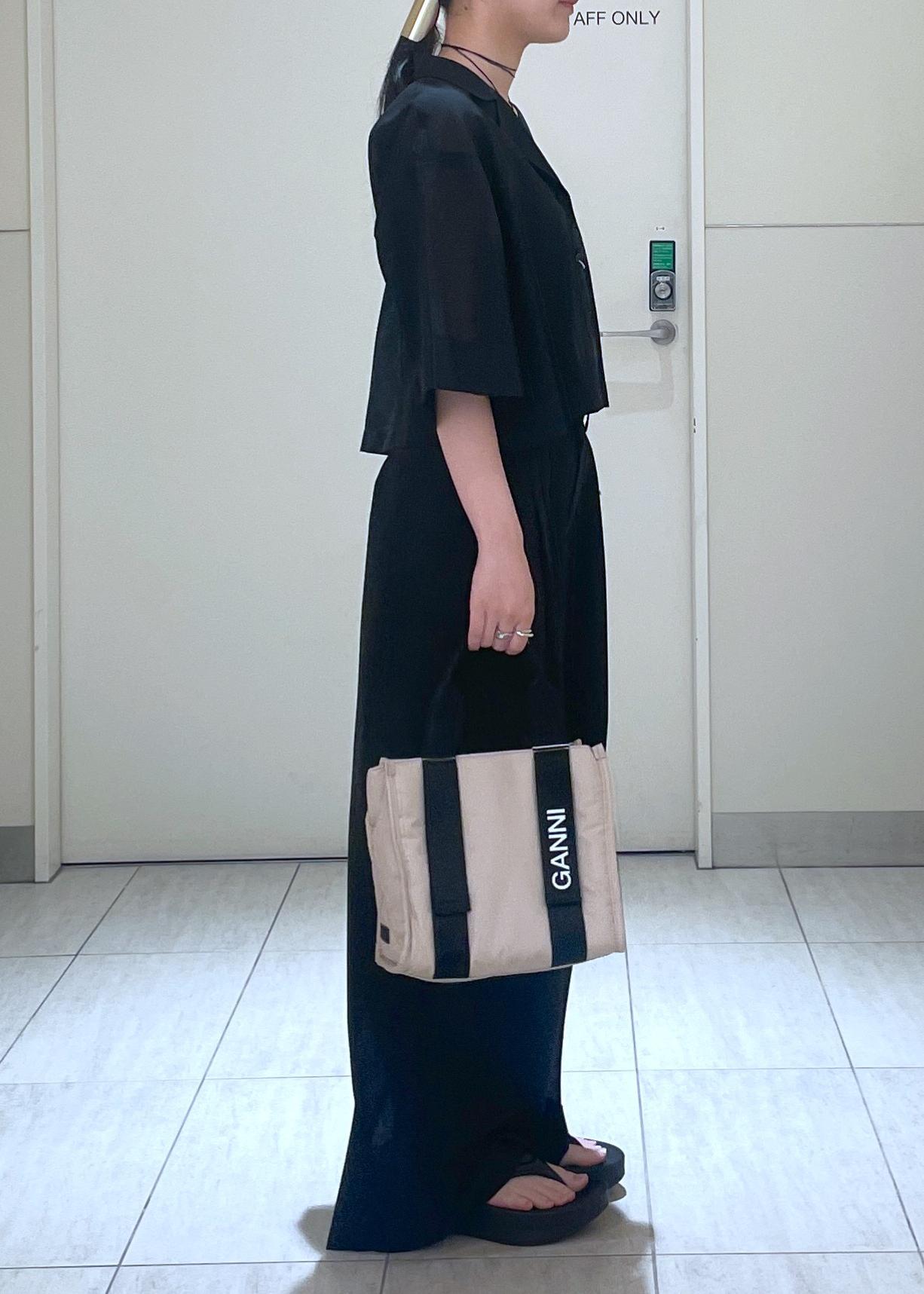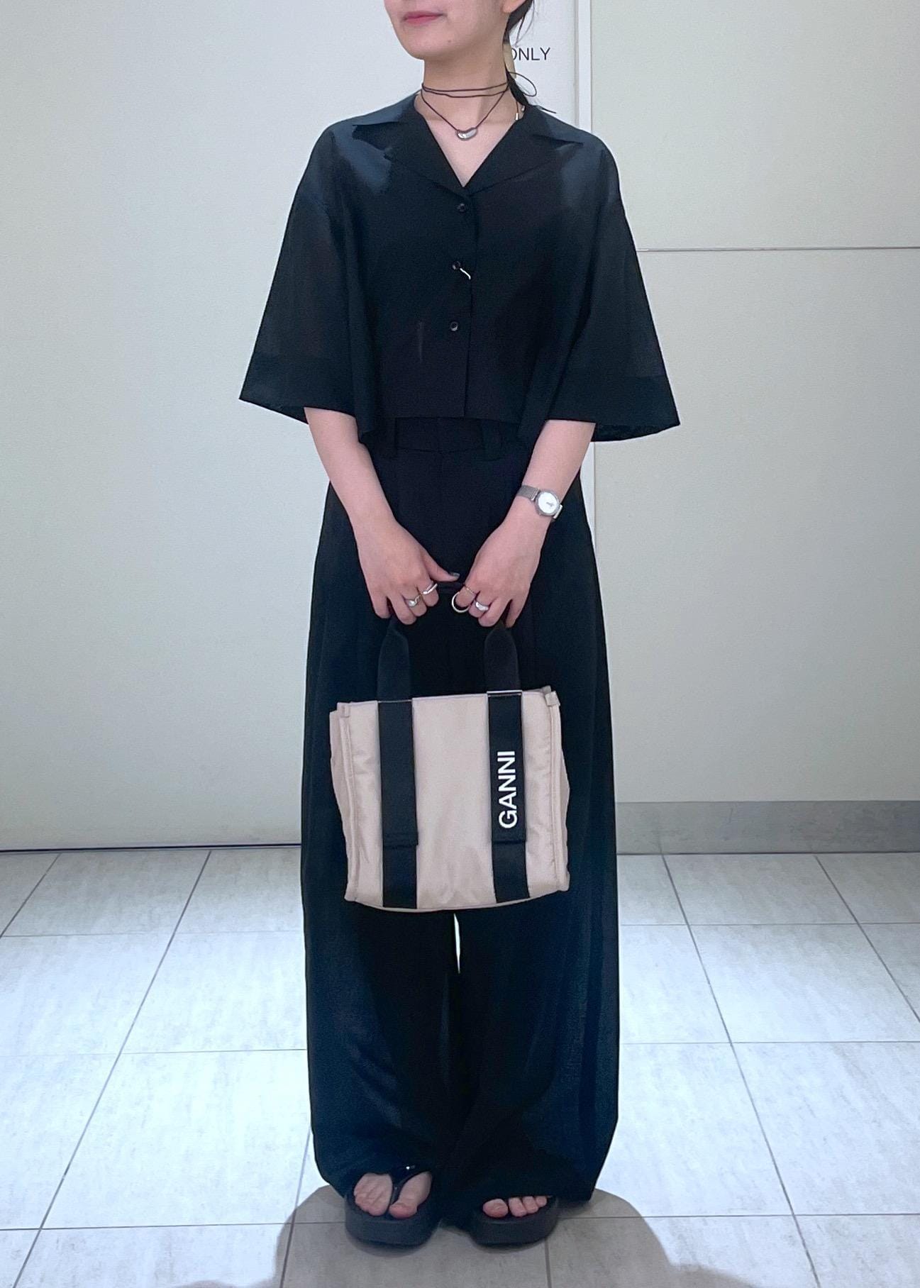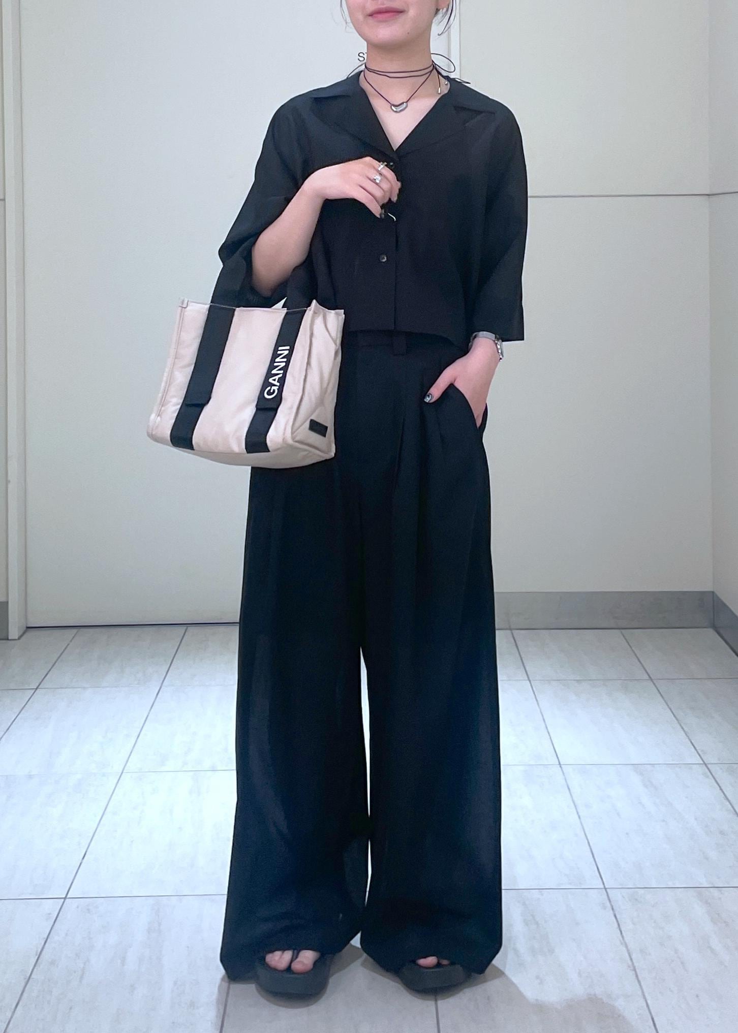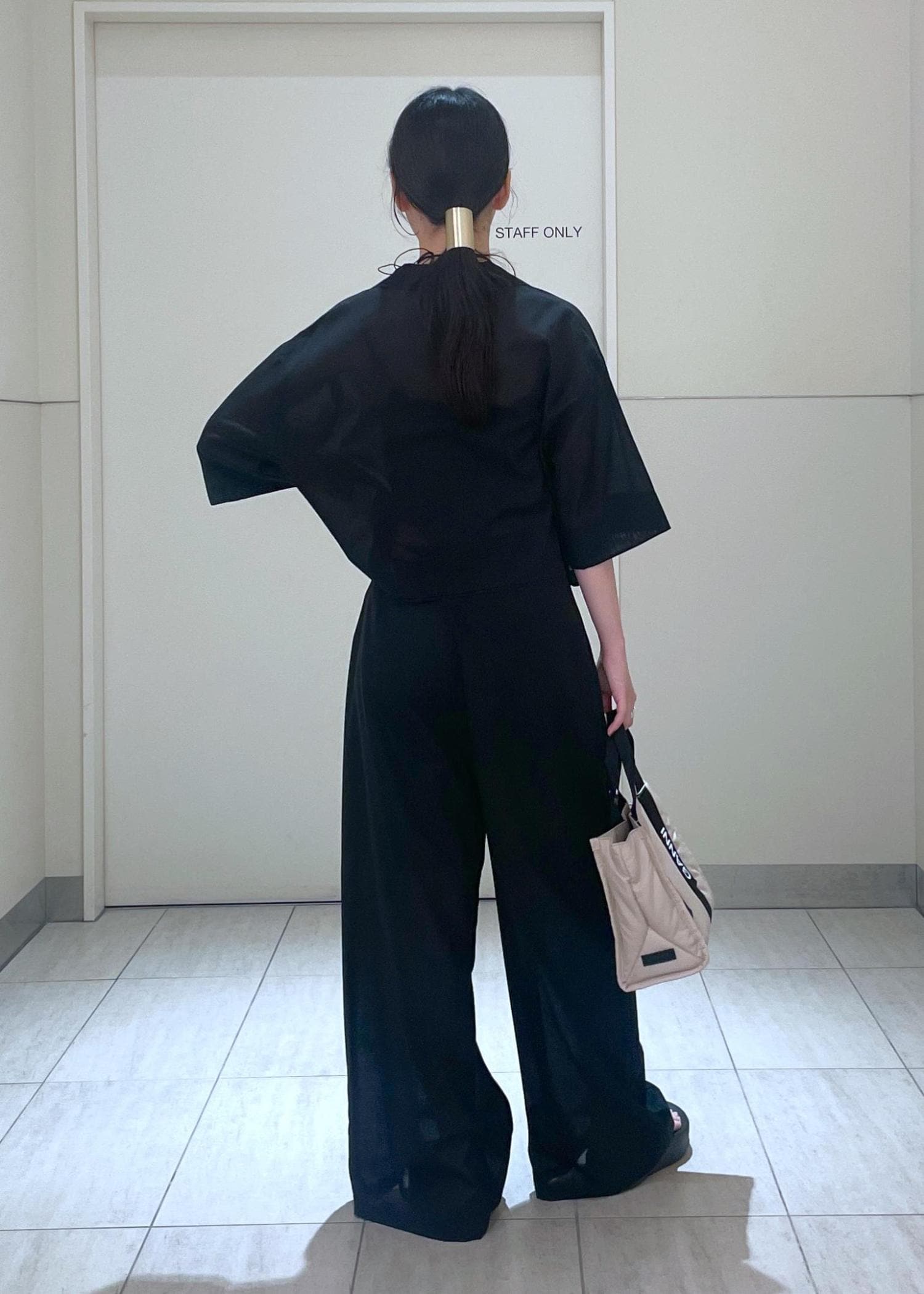セットアップ対応のシャツジャケットとタックパンツは透け感があるものになるので、ブラックでも重たくなりすぎずに夏でもサラッと着ていただけます!