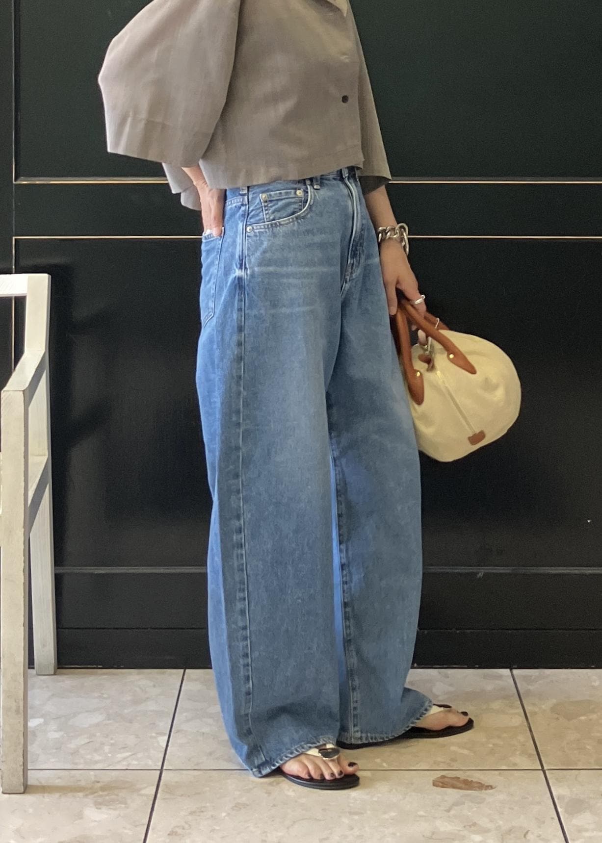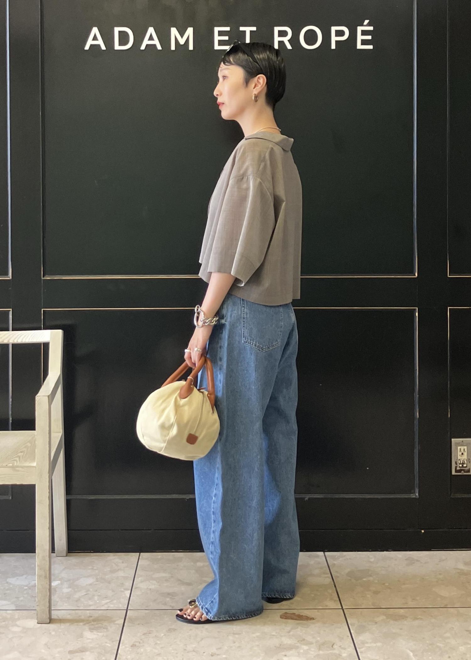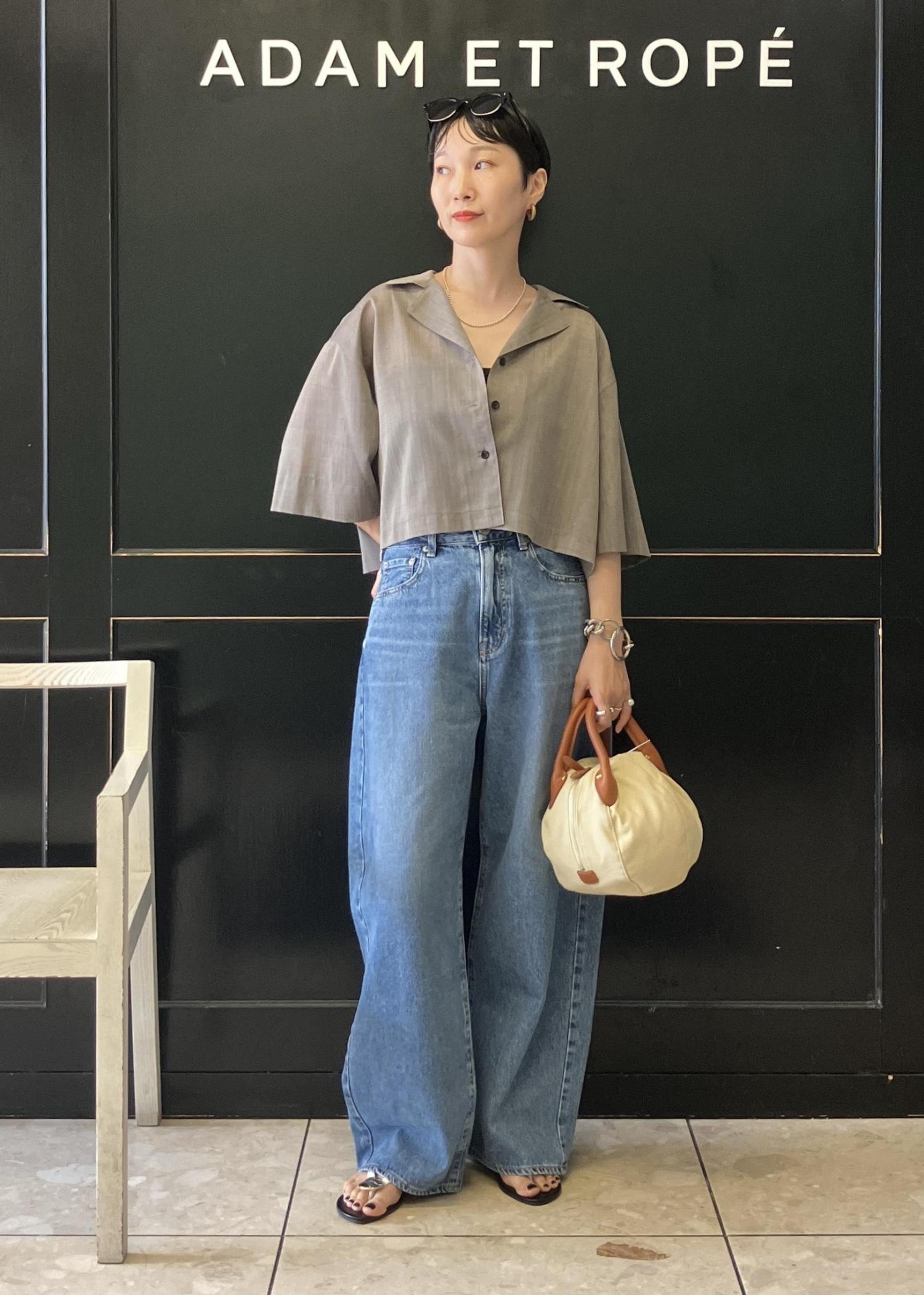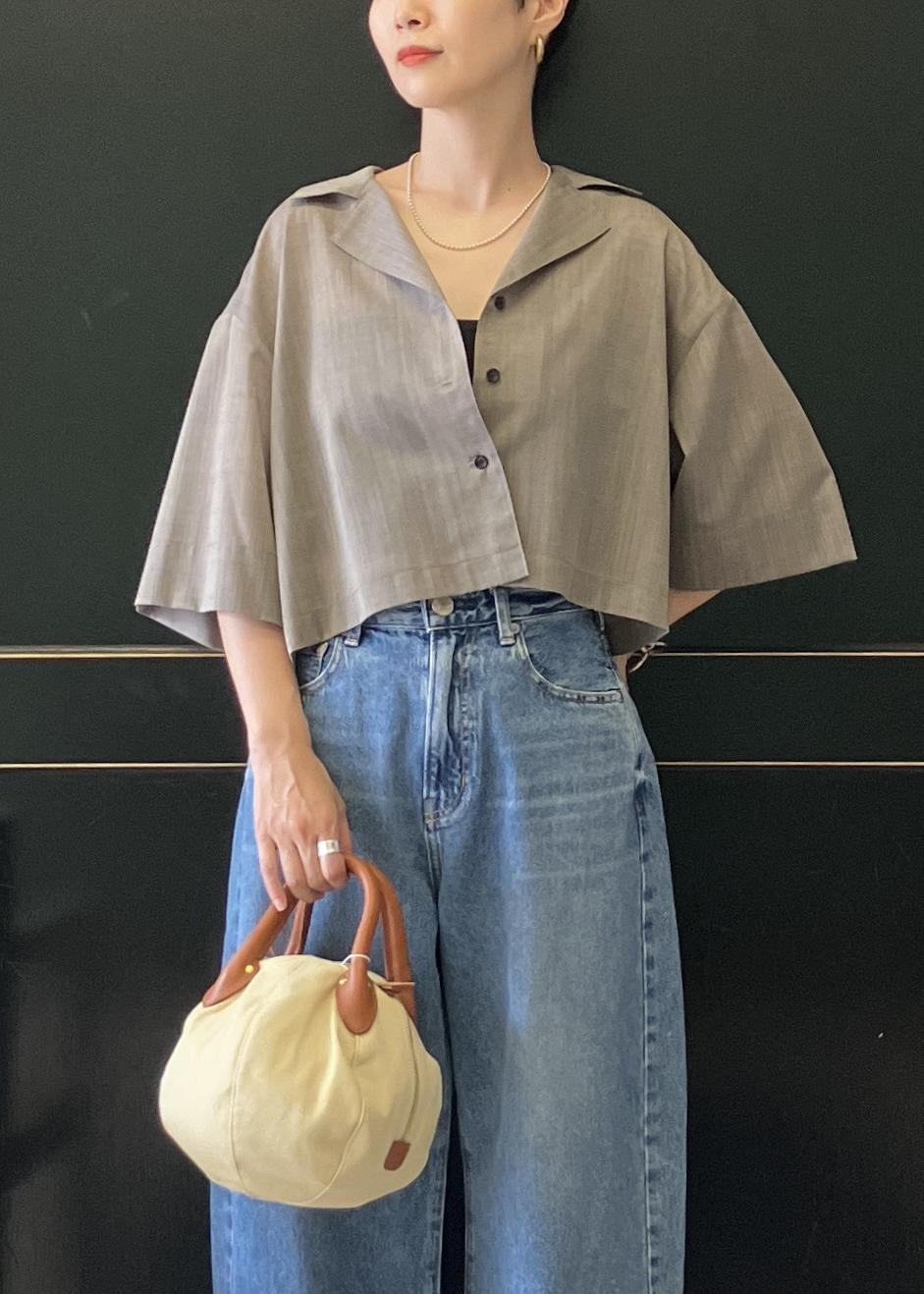 1番下のボタンだけ留めて、大人の肌見せコーデも◎