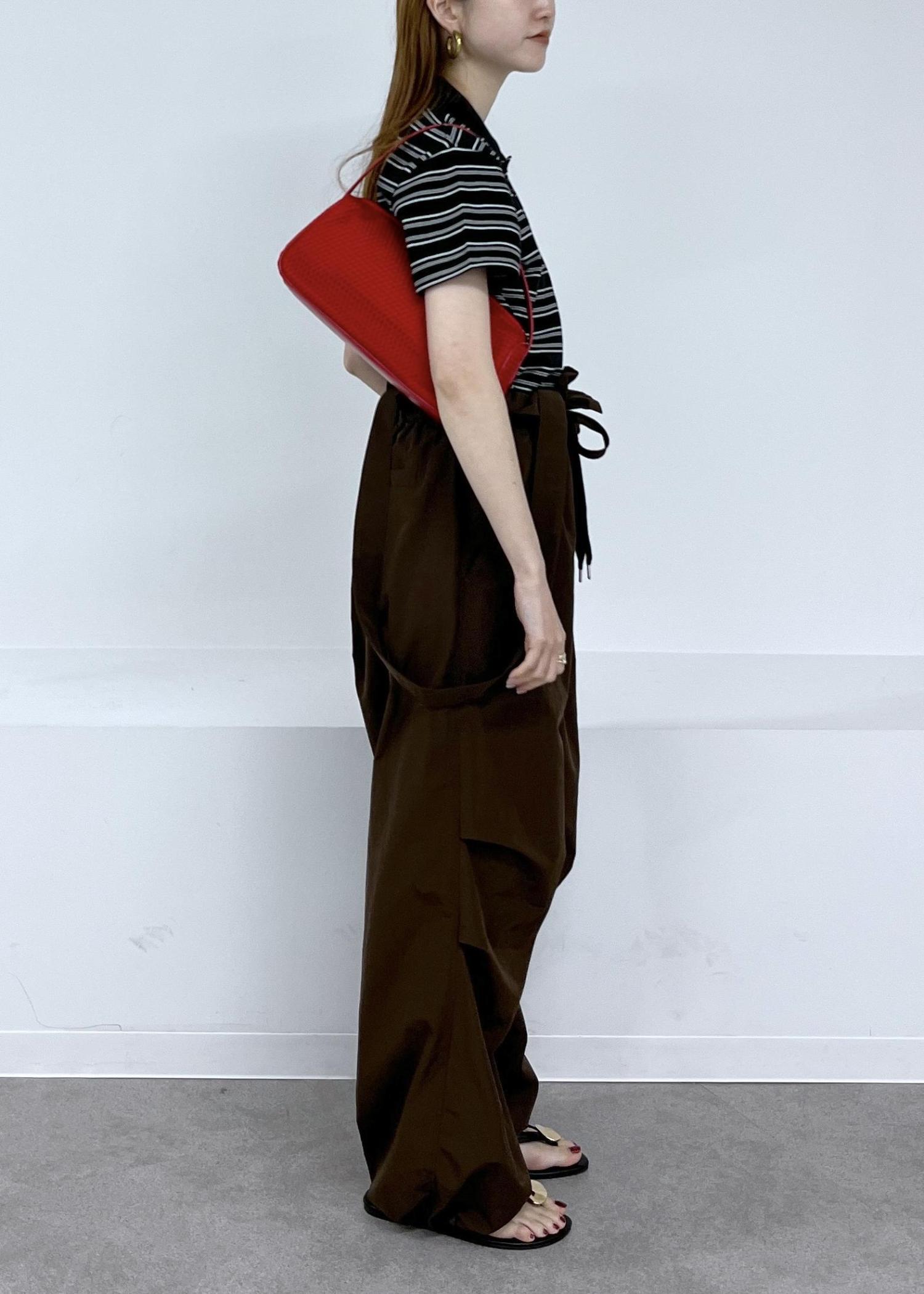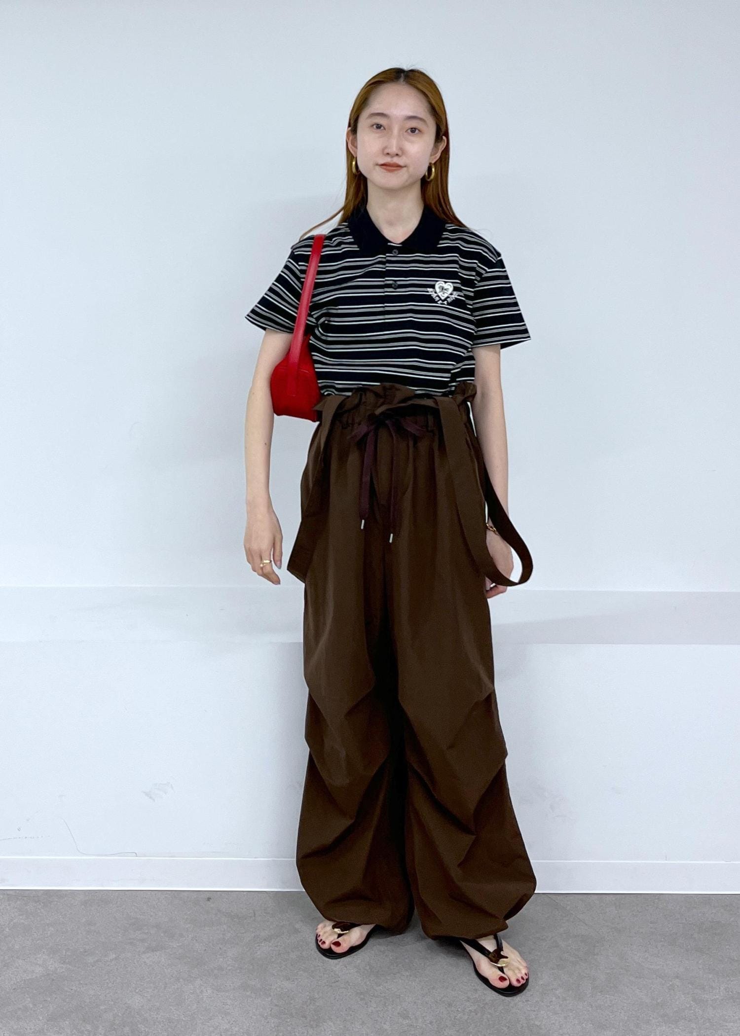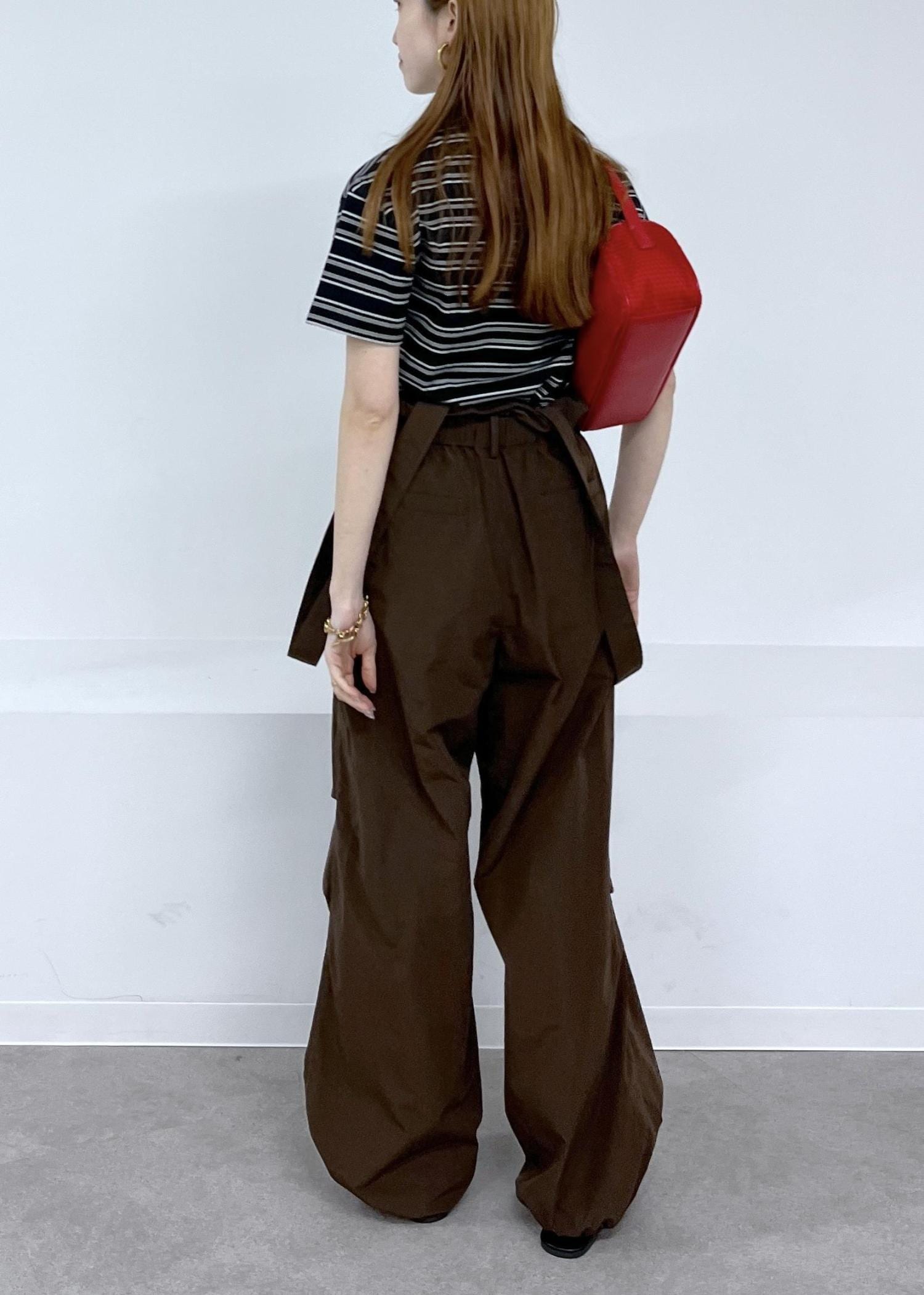 ややマットな質感でラフになりすぎない印象です。ウエストは紐でぎゅっと絞れるので簡単にサイズ調整可能です。38サイズですと裾もたっぷり余るくらいの着丈。裾も絞ったり、そのままにしたりで変化を楽しめます◎