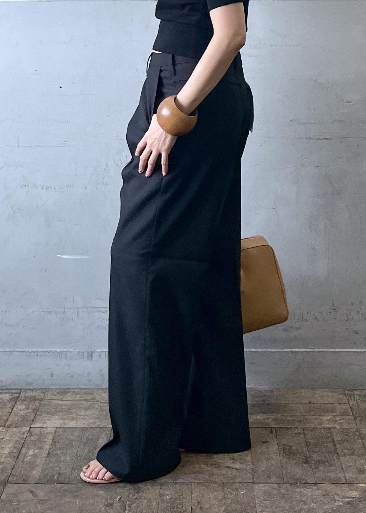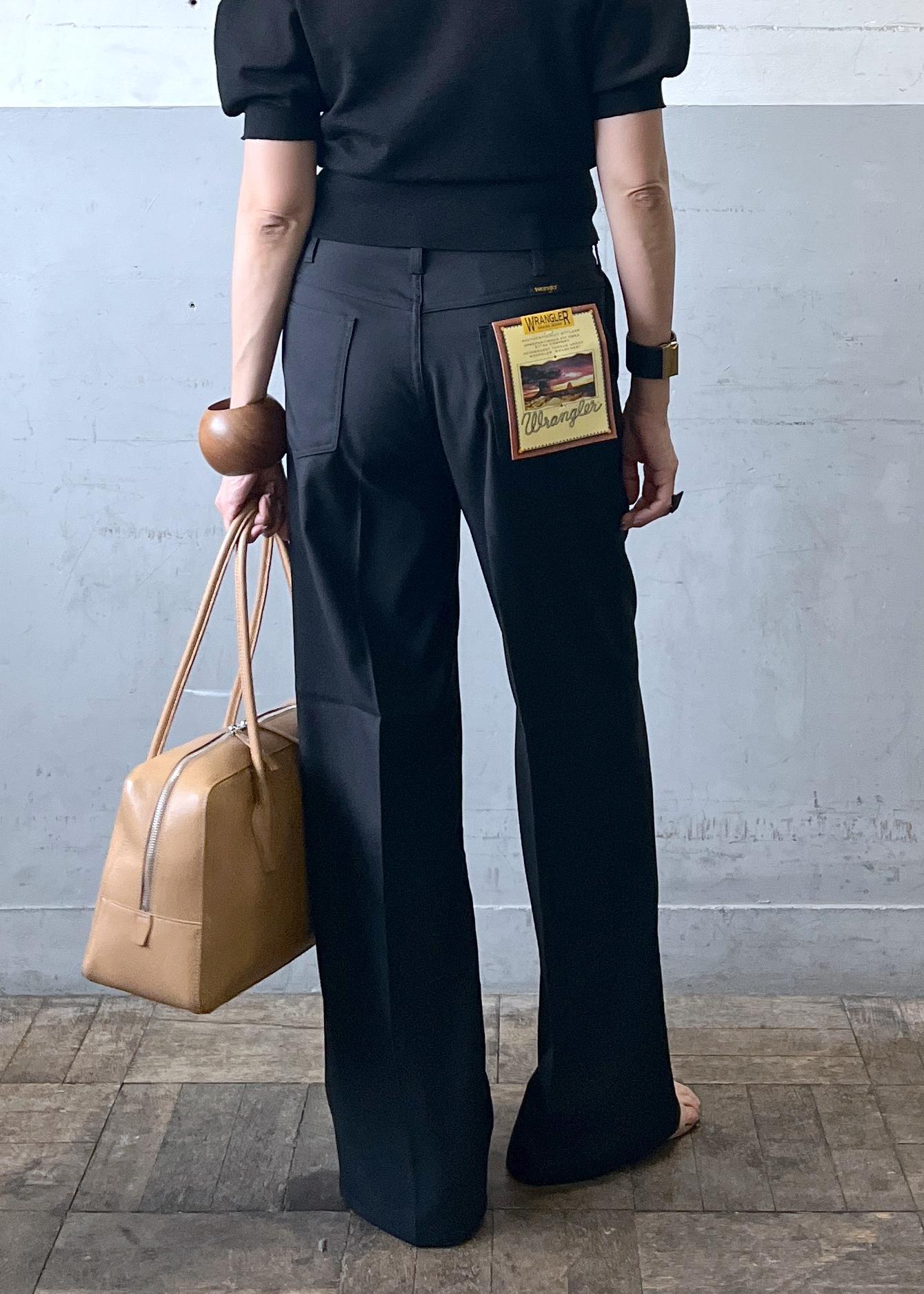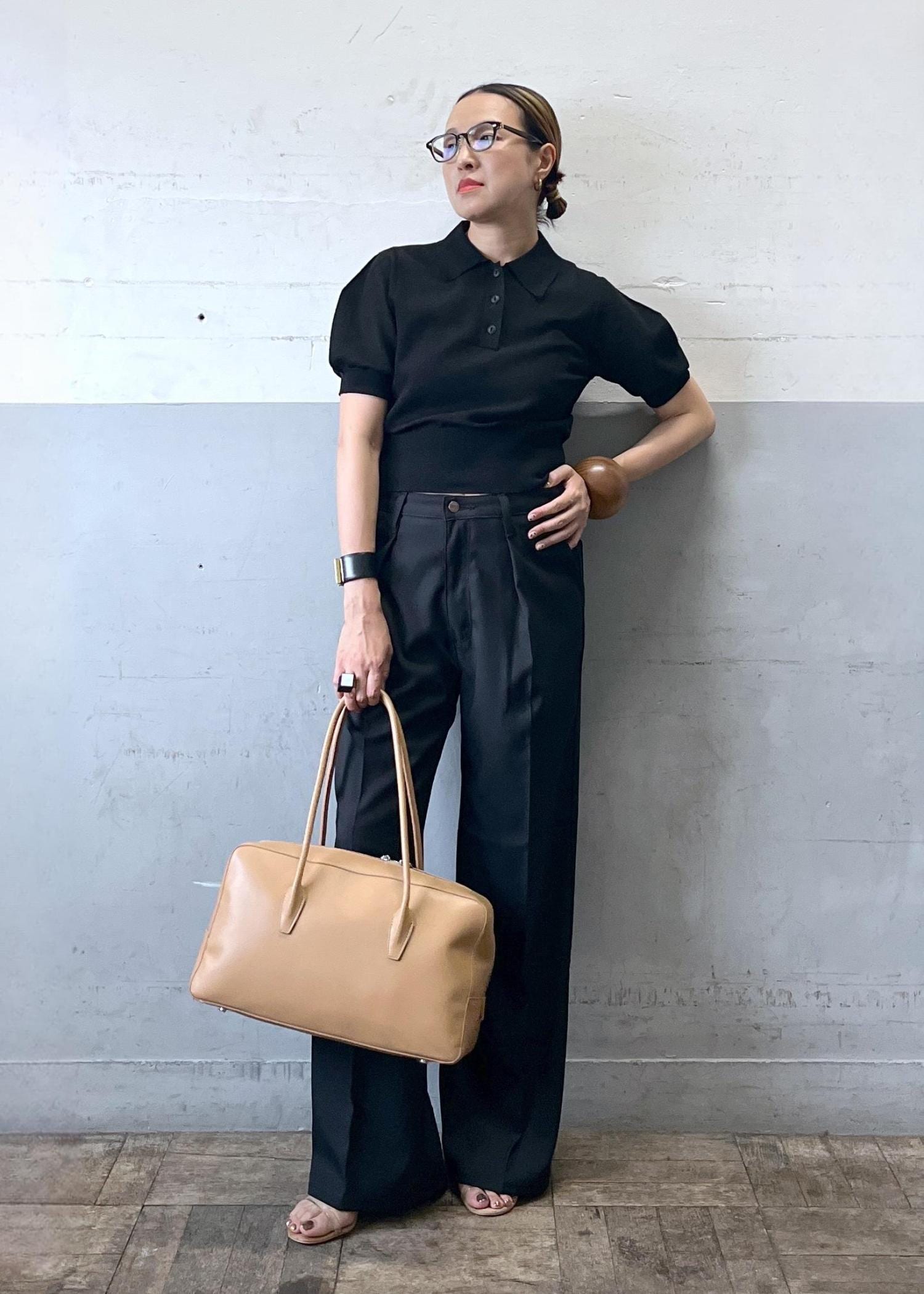 HOMMEでとてもラインが綺麗でカッコいいパンツを見つけました!ラングラーなのにスラックス。ポリアステルで素材はやや薄手。伸縮性もあって履き心地抜群!そんなかっこいいパンツに合わせたのはパフスリーブが可愛いシアー素材のポロニット。ウエスト部分が自然にキュッと上がってクロップド丈になります。パンツがややローウエストなので少しチラッと肌が見えますが、抜け感も出て重くならずスッキリ。