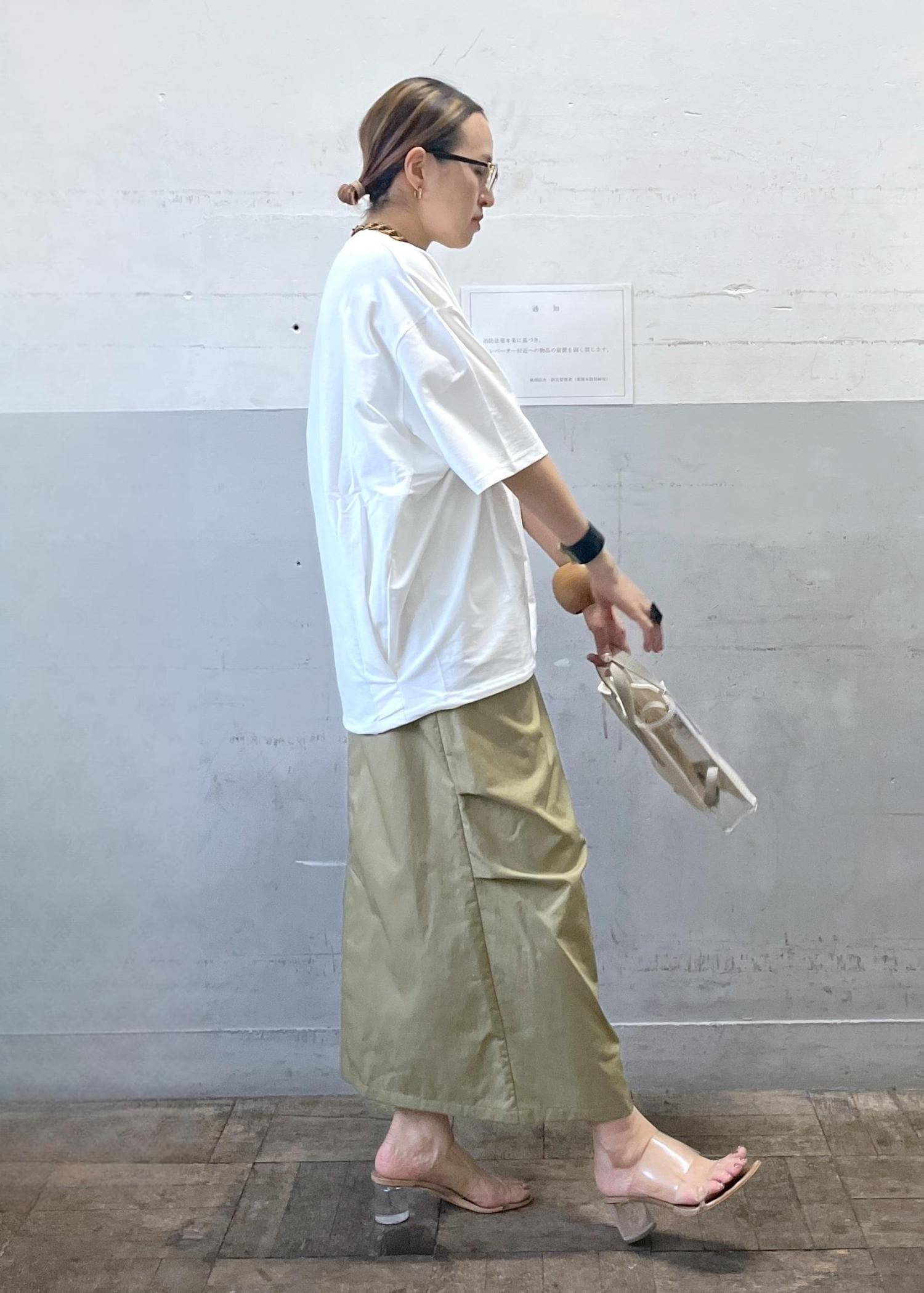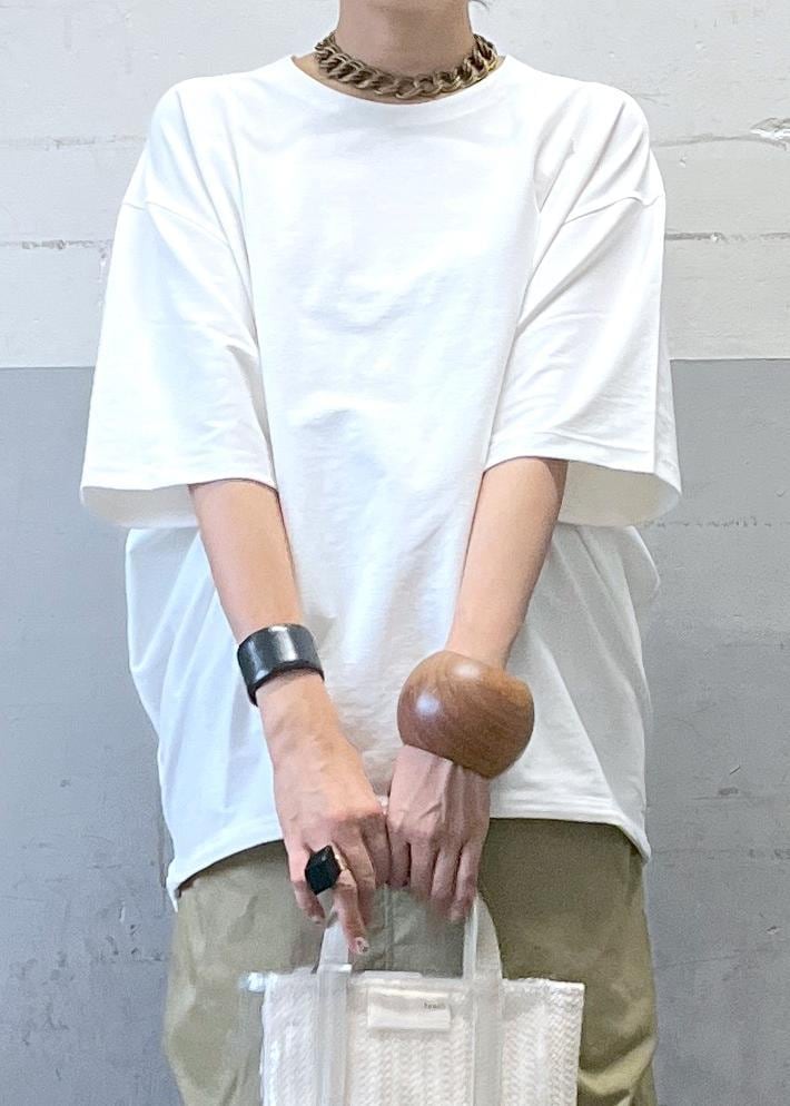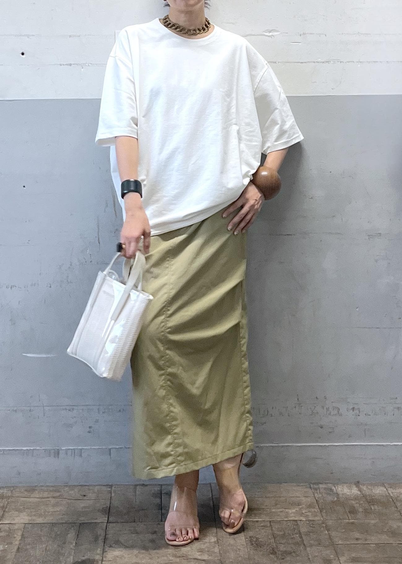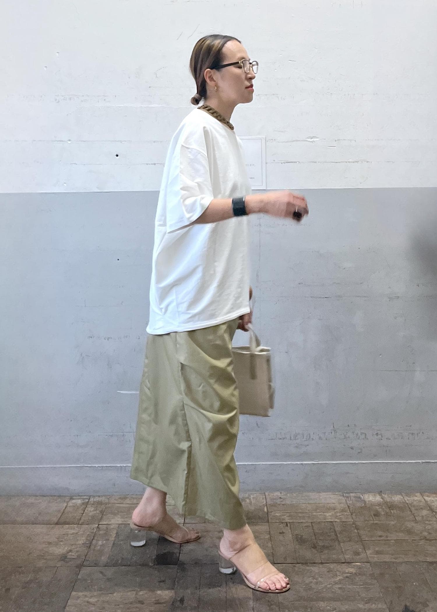 触っただけでもヒンヤリ感じる気持ちよさと、ヒップまで隠れる前後差のあるオーバーサイズTシャツは色違いで欲しくなるほど秀逸。裾のサイドにタックを入れることでコクーンシルエットを再現しており、ただのビックTeeではないこだわりのある1枚に◎