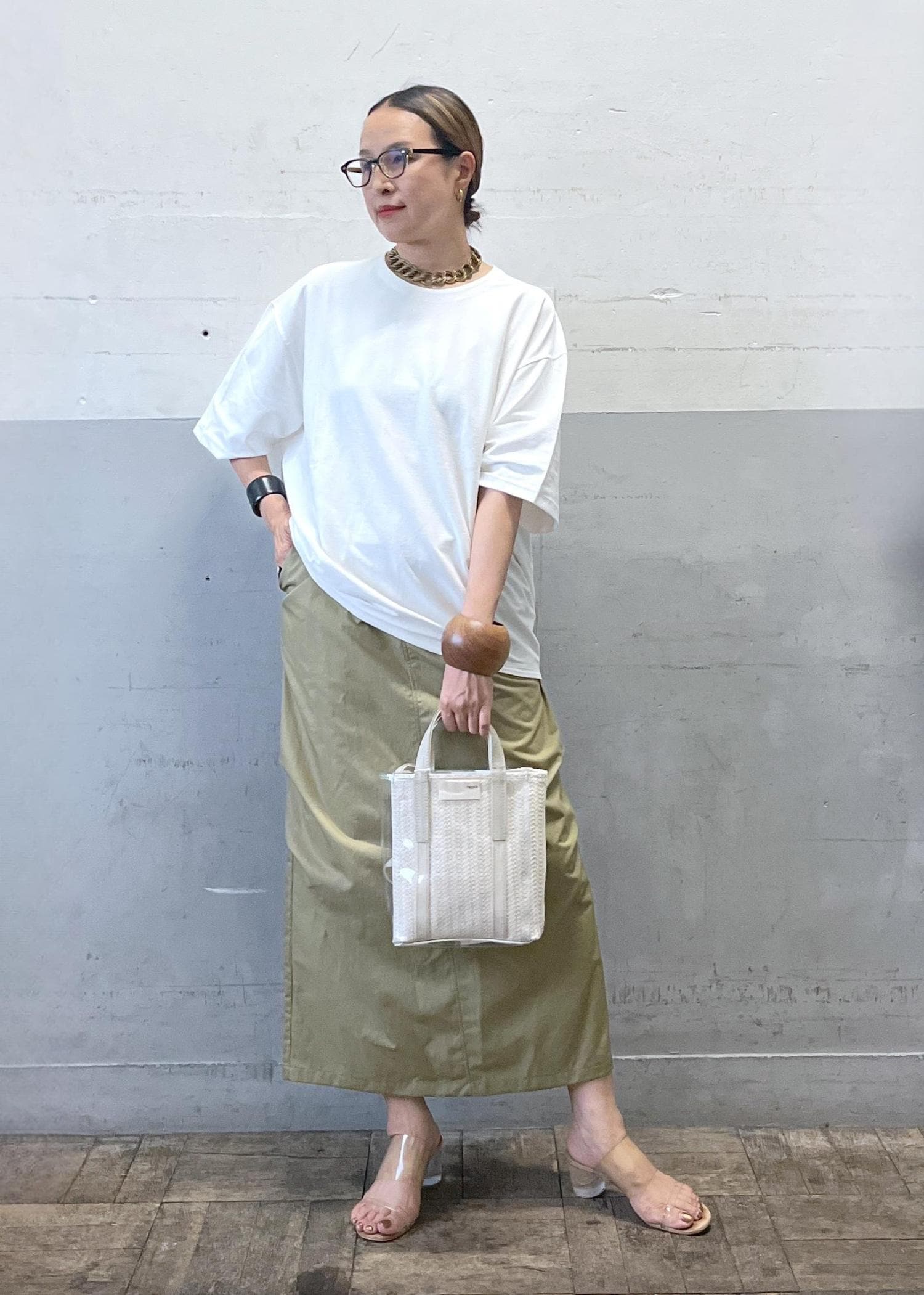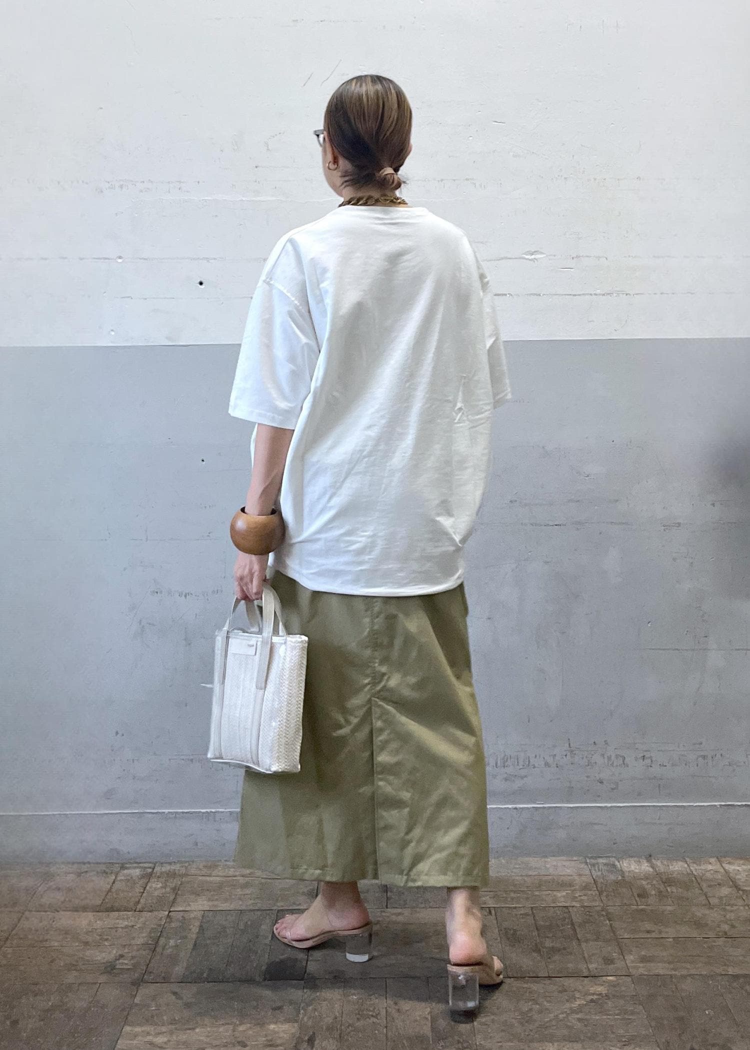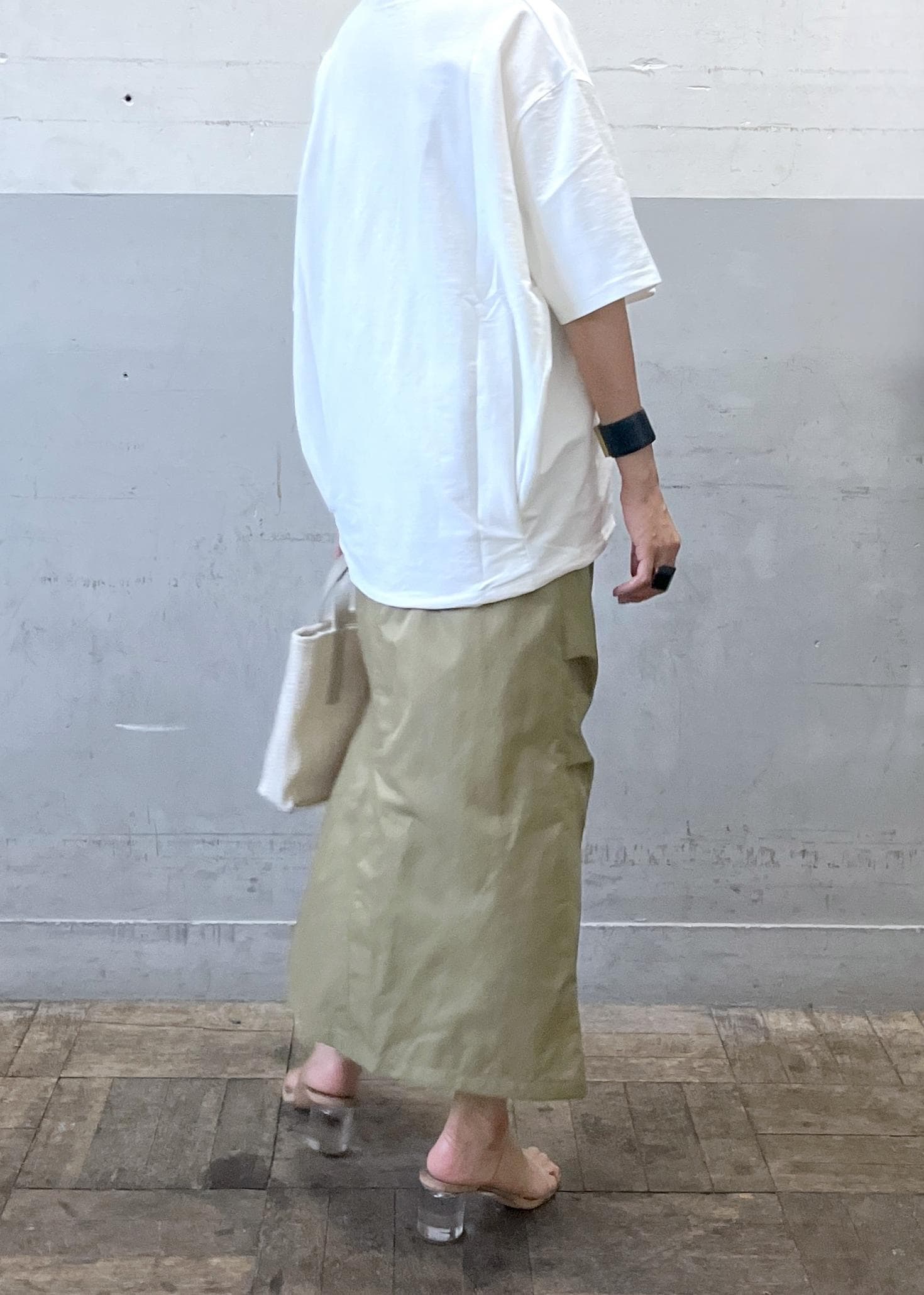 触っただけでもヒンヤリ感じる気持ちよさと、ヒップまで隠れる前後差のあるオーバーサイズTシャツは色違いで欲しくなるほど秀逸。裾のサイドにタックを入れることでコクーンシルエットを再現しており、ただのビックTeeではないこだわりのある1枚に◎