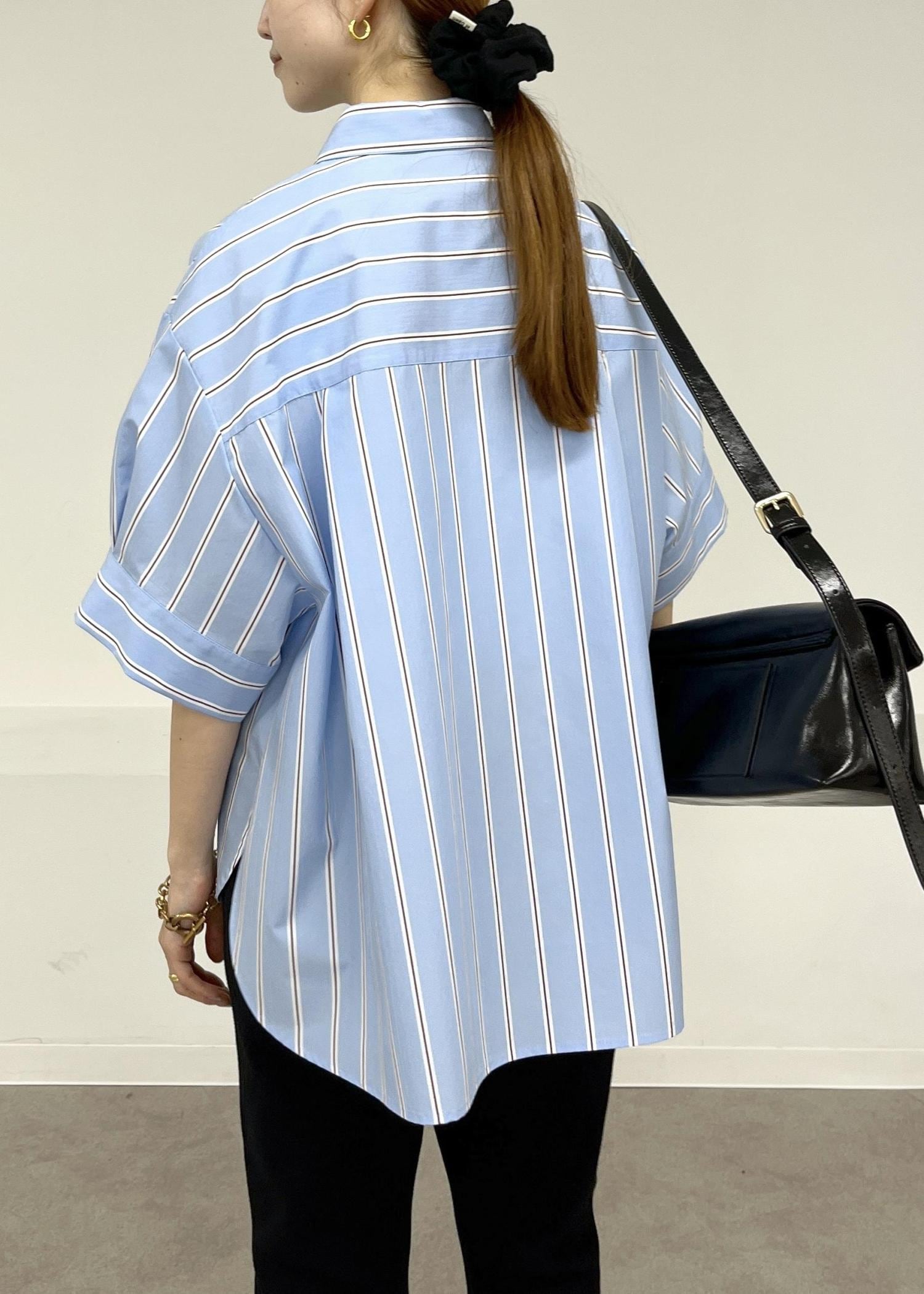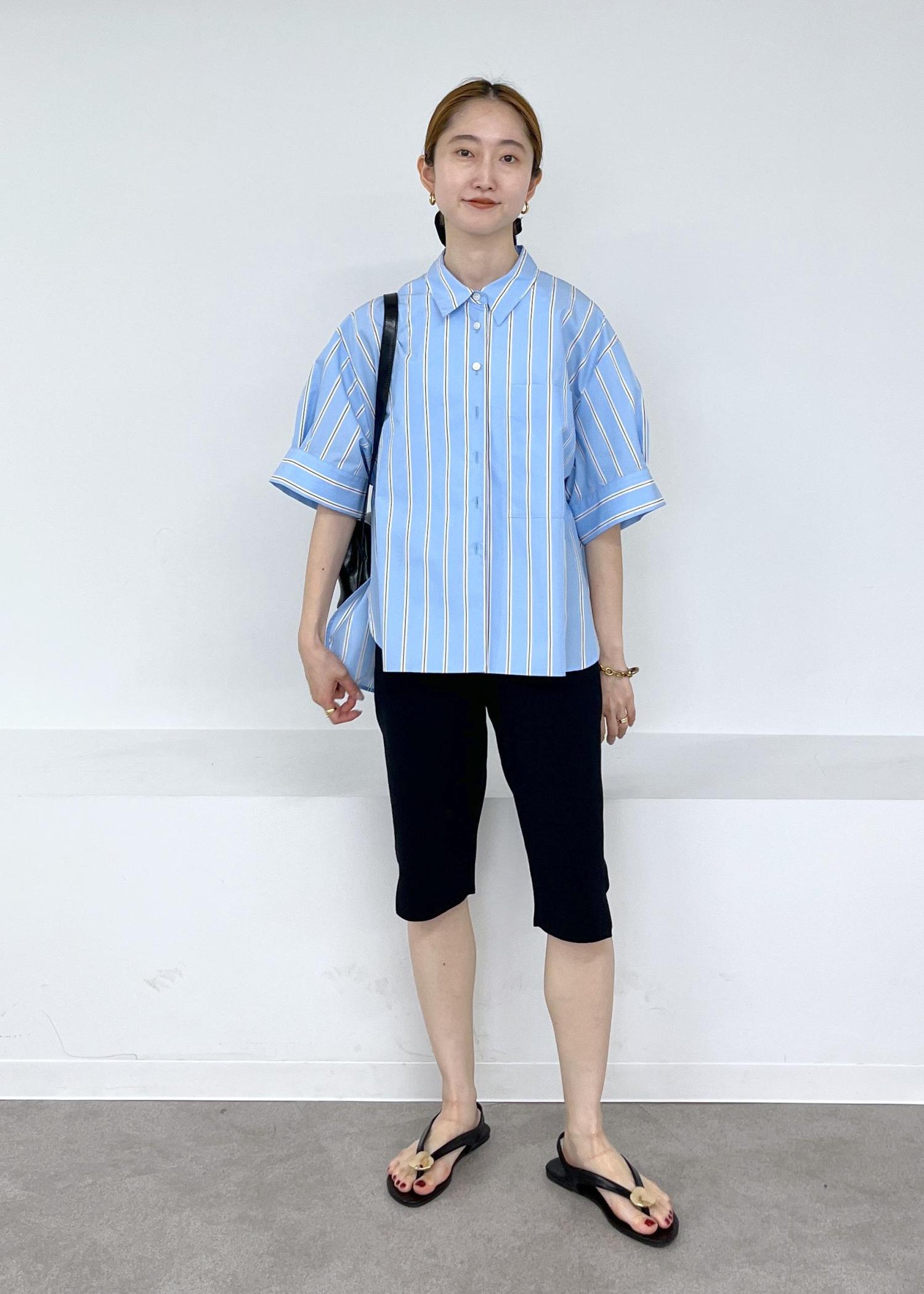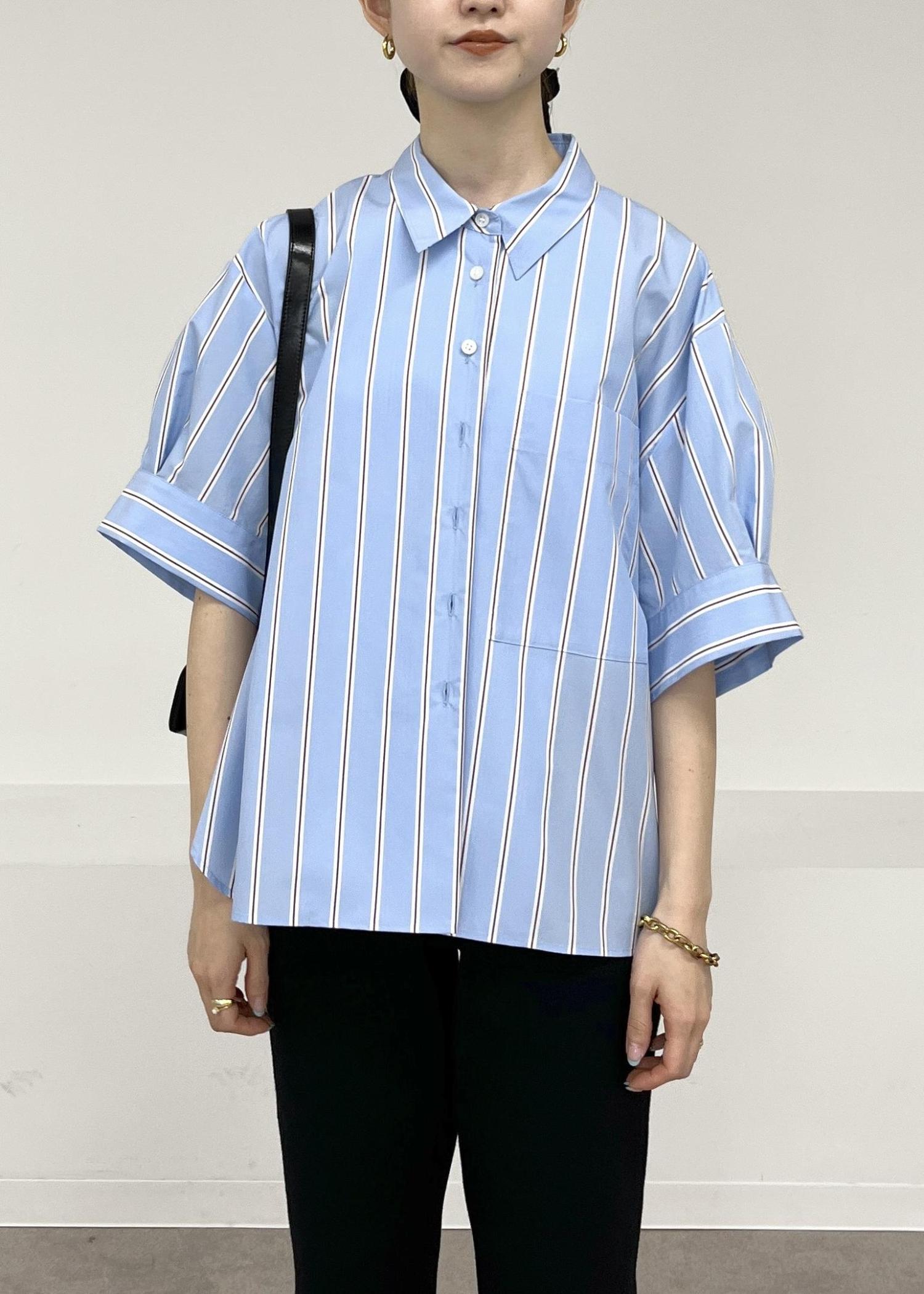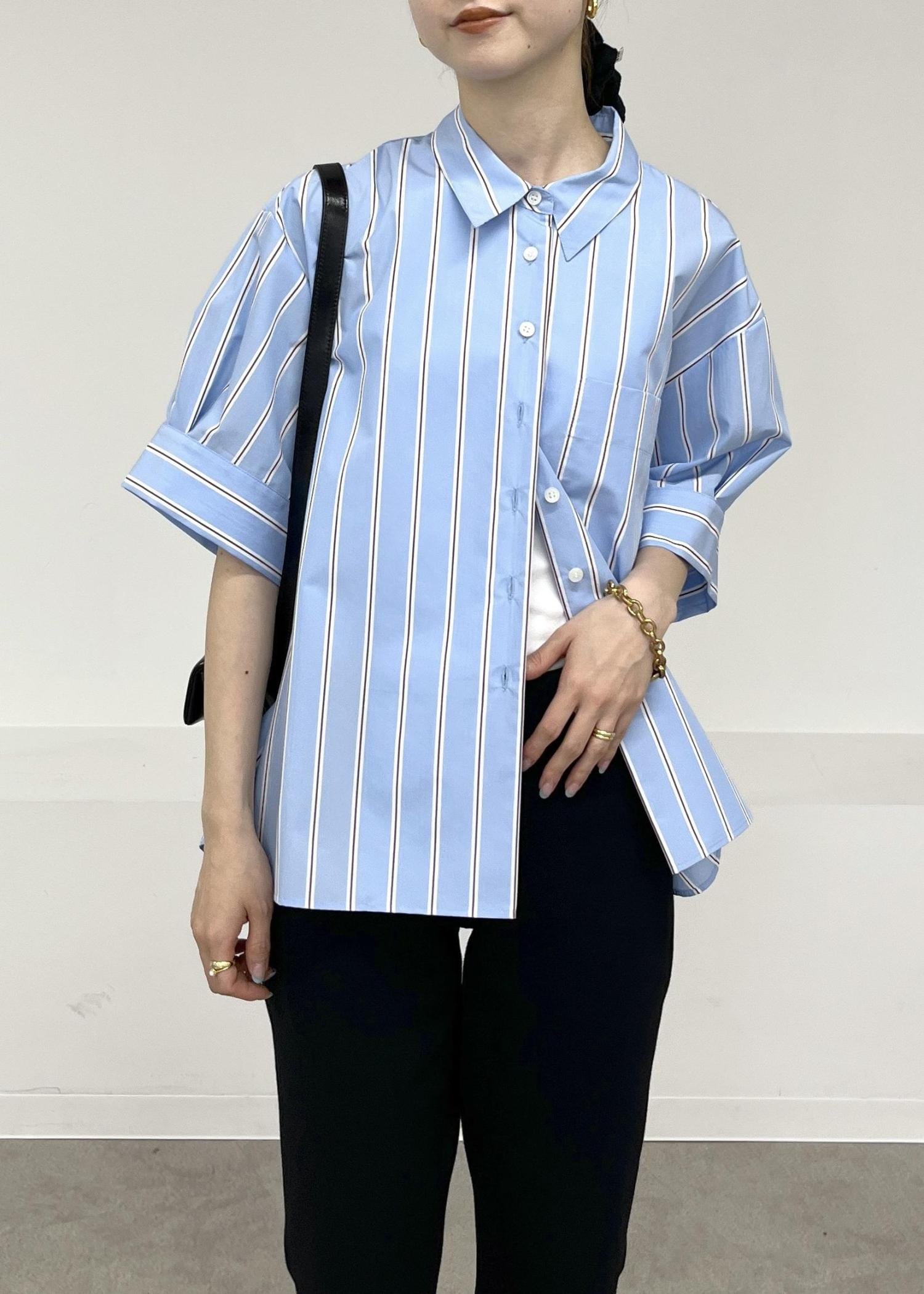 アウトレットADAM ET ROPÉ FEMME【サステナブル】バウンスカフステントラインシャツブルー系 / F¥7,568レビューややハリのある素材感でシワになりにくいです。サラッとしており、ゆったりとしているので肌離れも抜群◎ヒップが隠れるくらいの長さです。