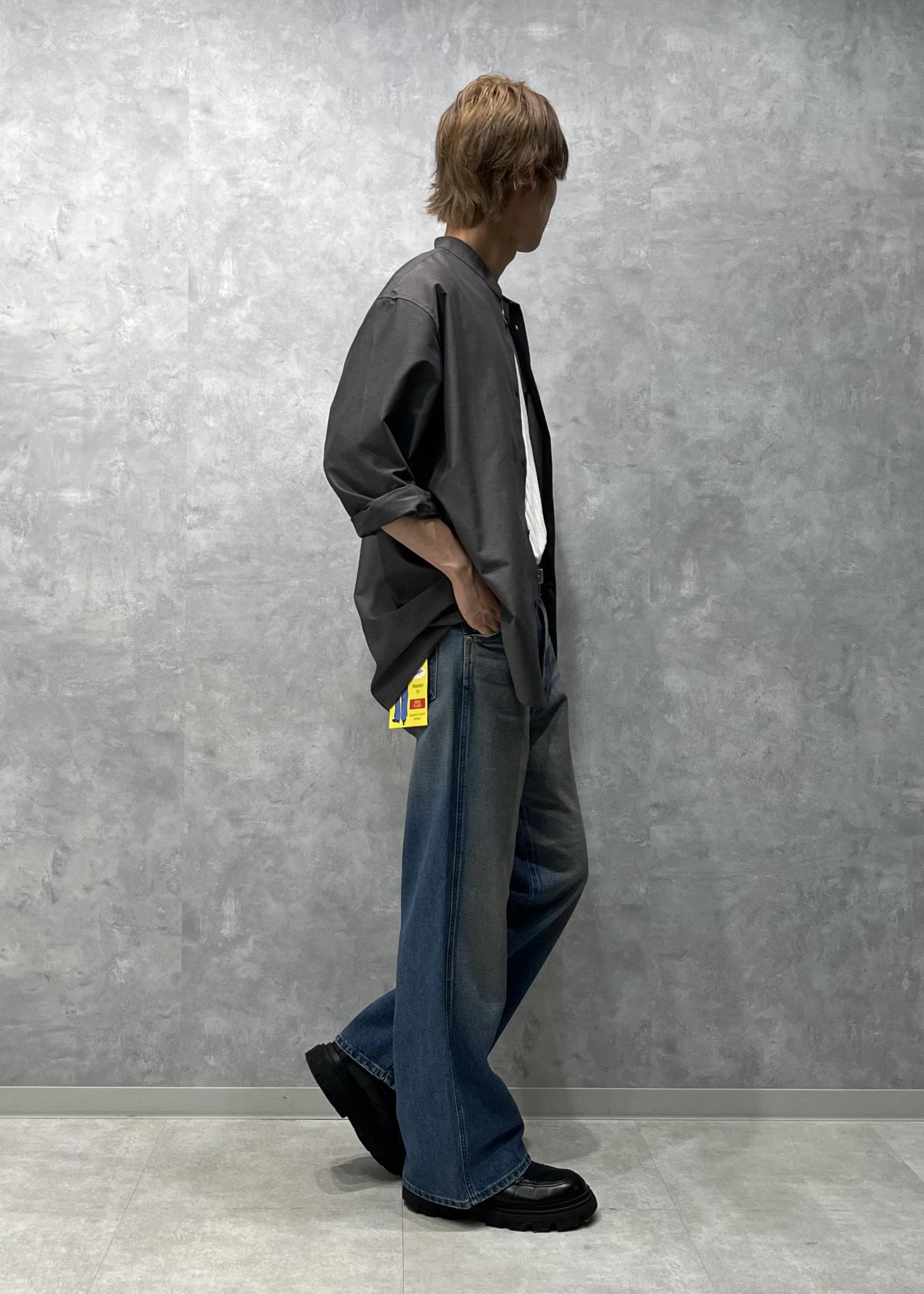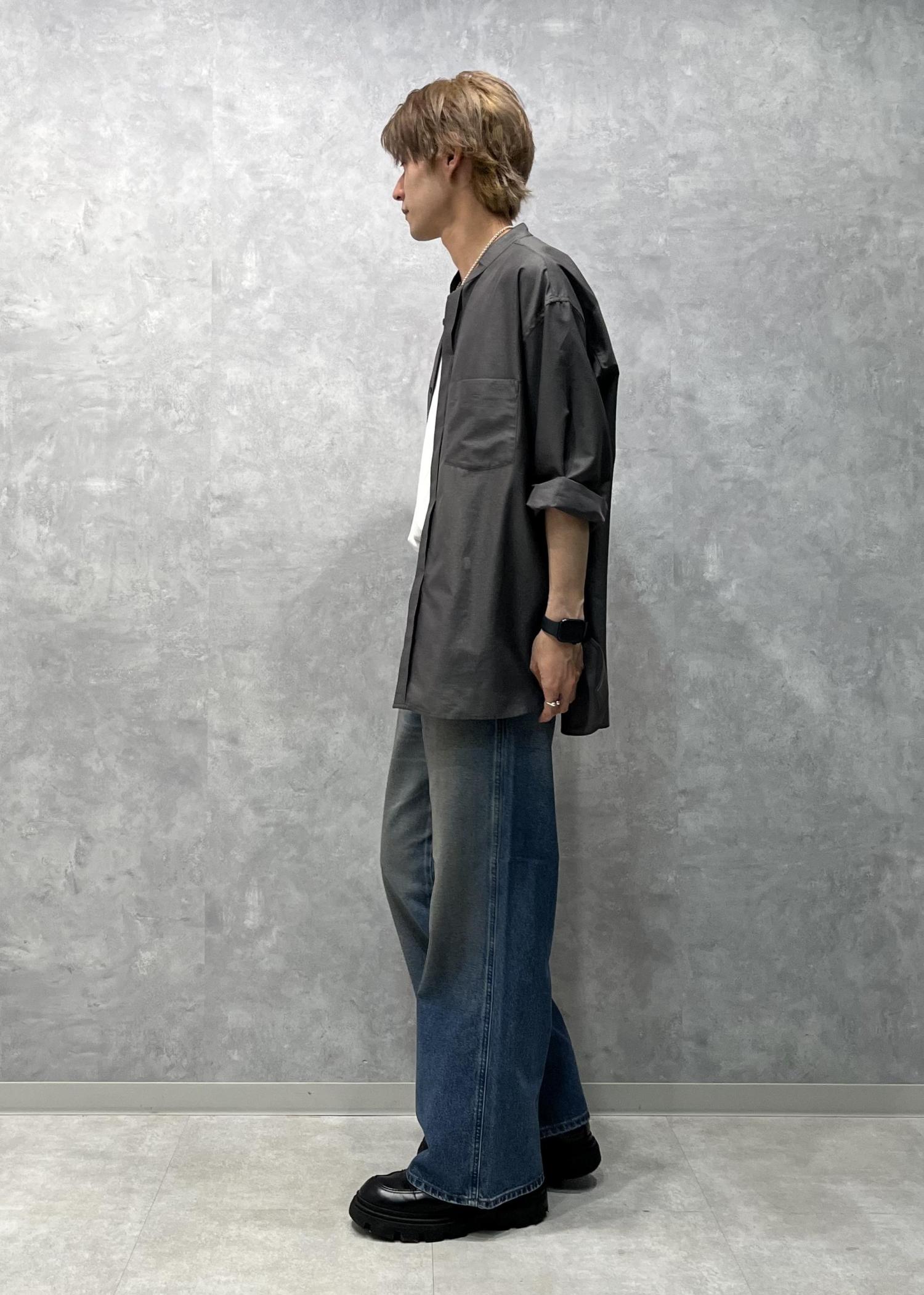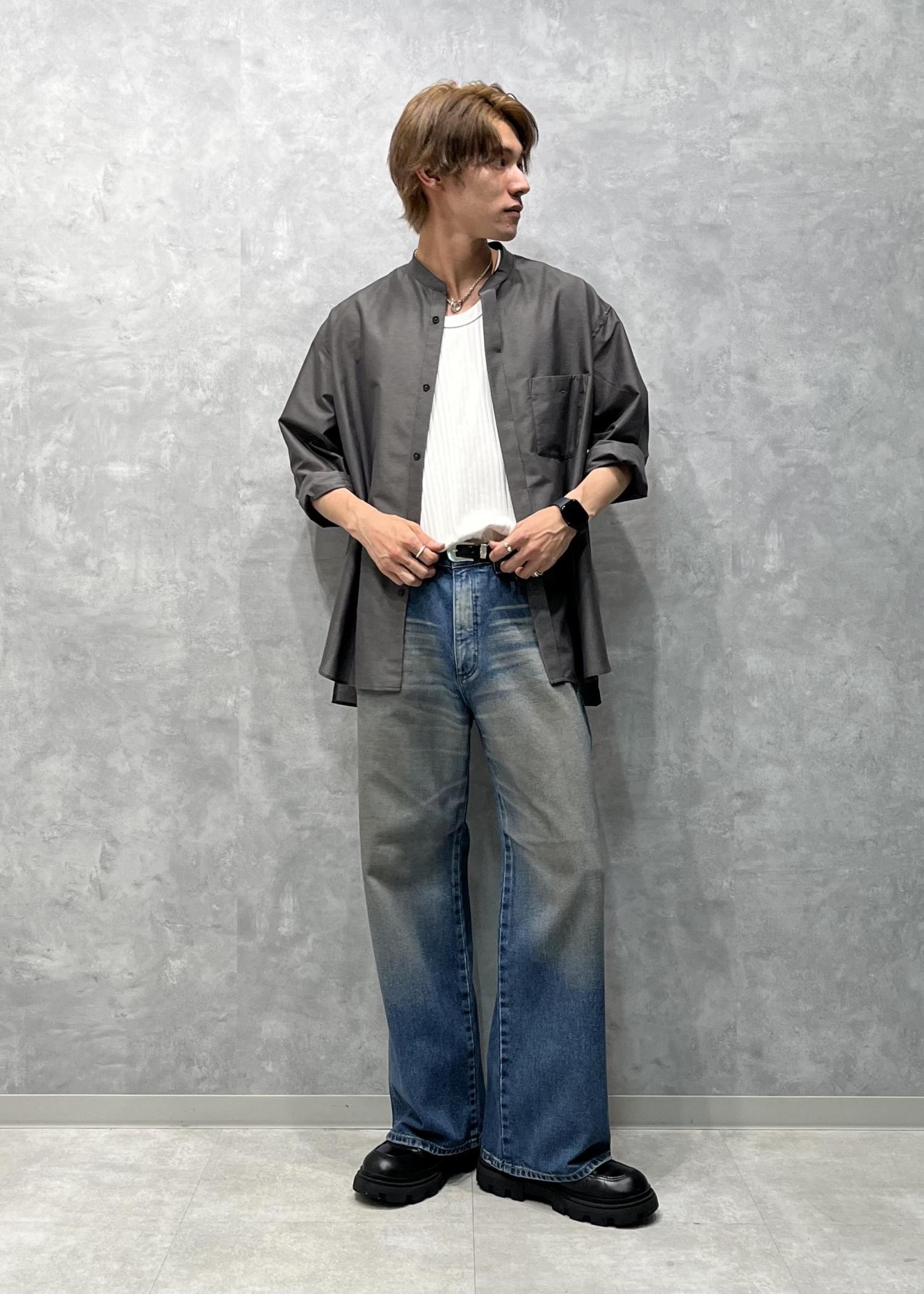 タックインしてすっきりとパンツのシルエットを際立たせて軽いシャツを羽織りキレイめにスタイリングしました。