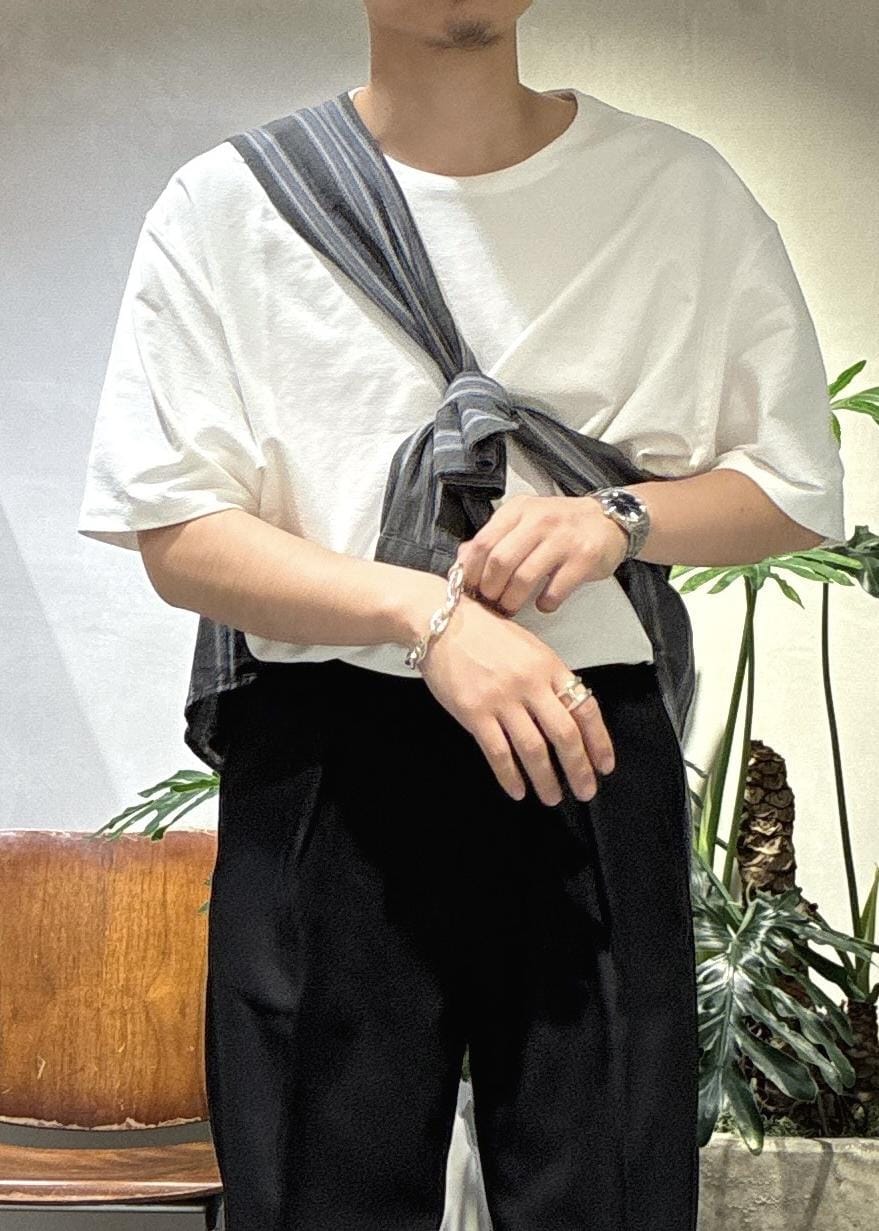 シャツを肩掛けしてみたり、ガツンと感のあるブレスレットをつけたりして味付けするのがおすすめです!