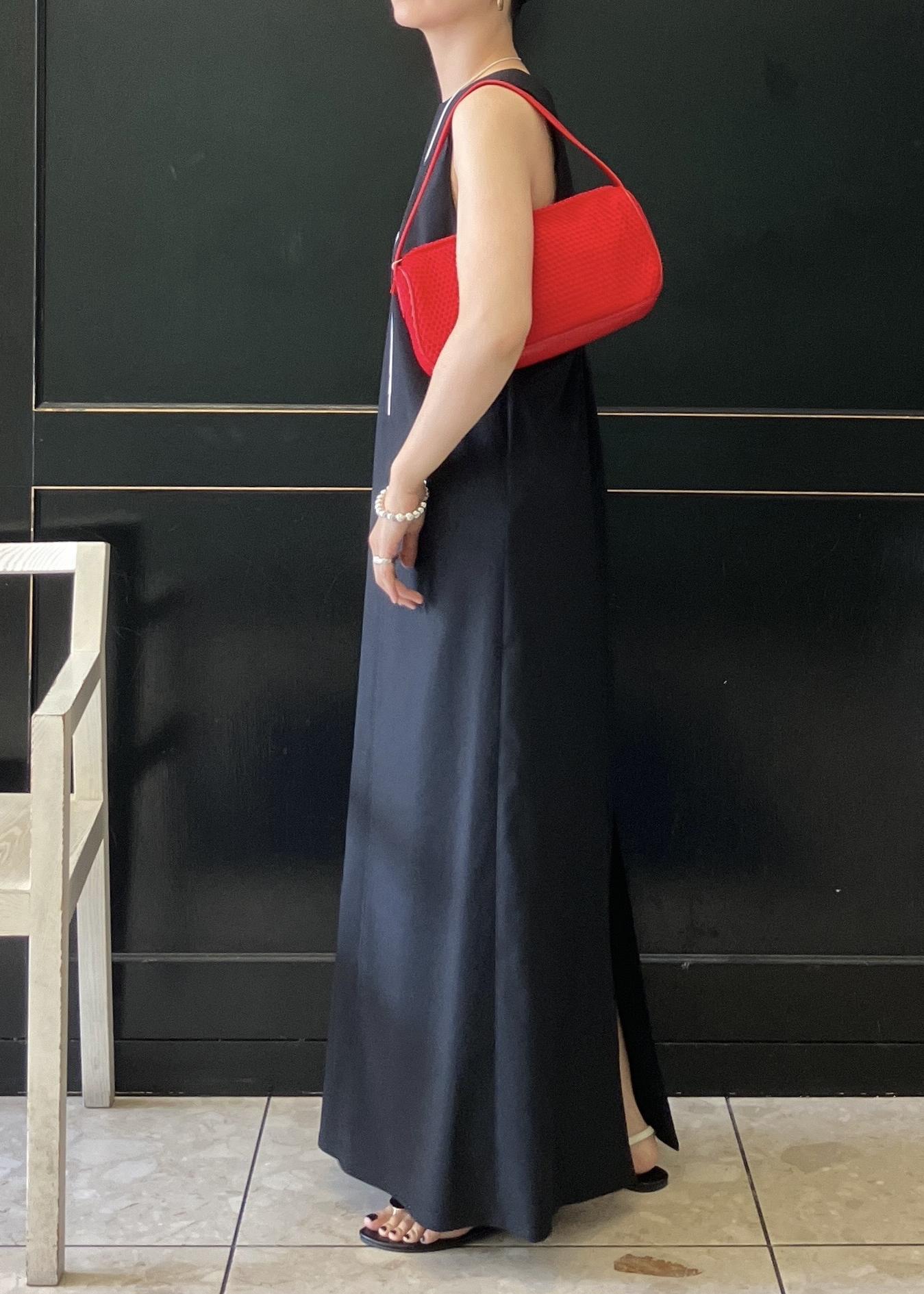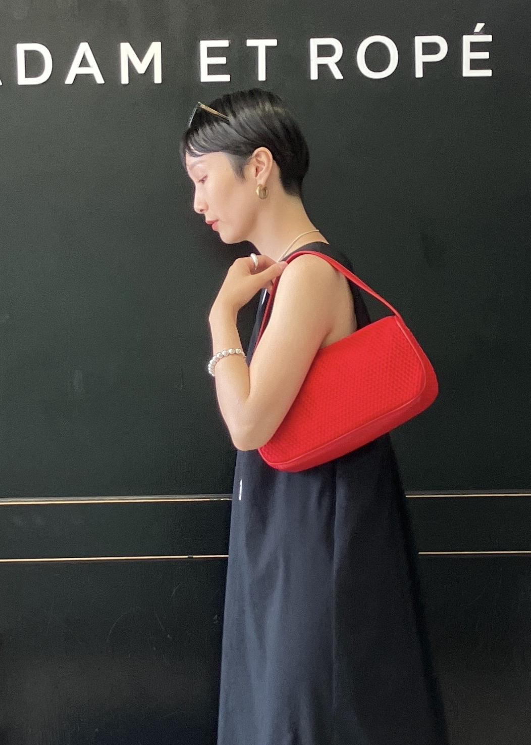 スタイリングのポイントにもなる、メッシュの赤のバッグ♡
