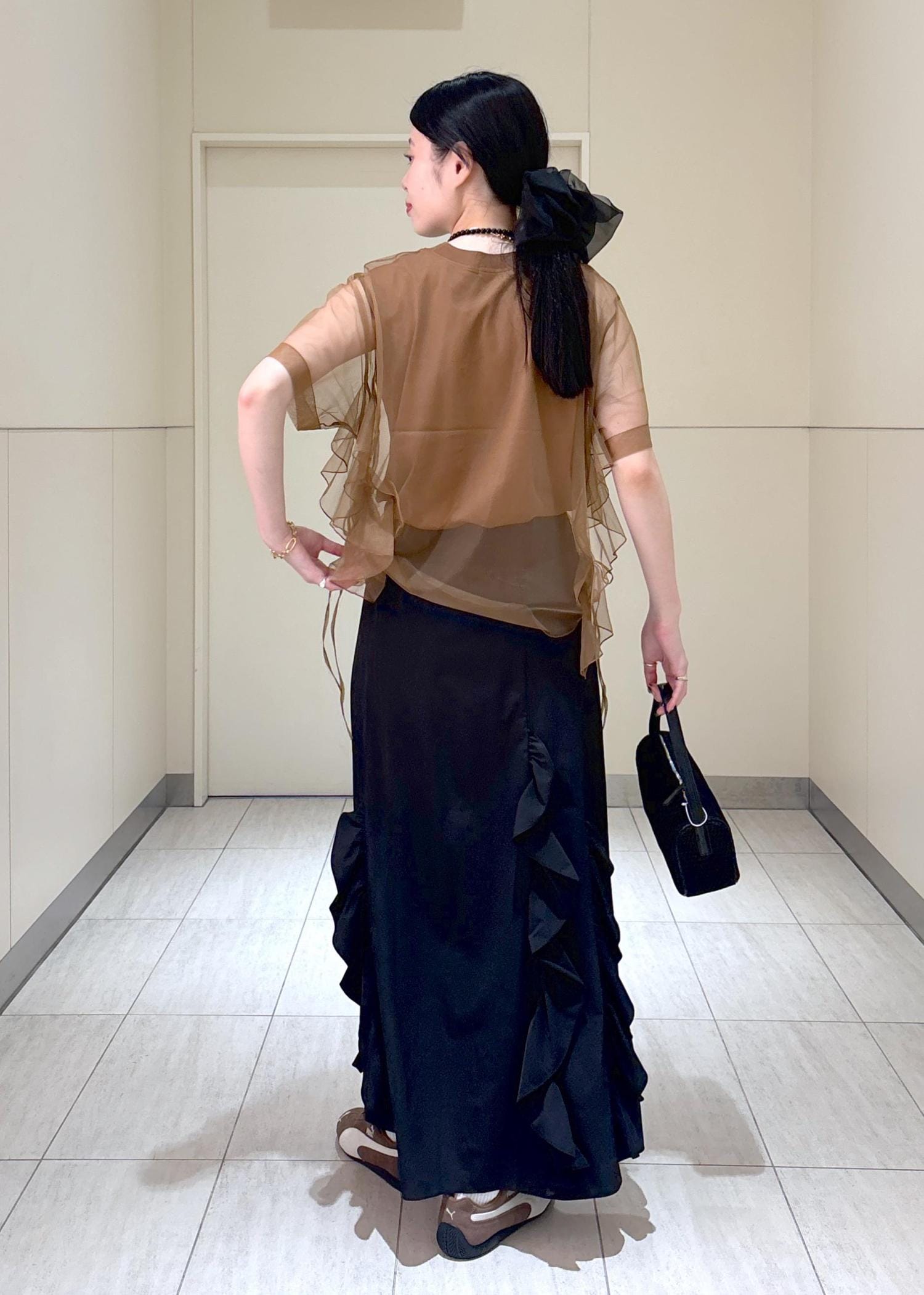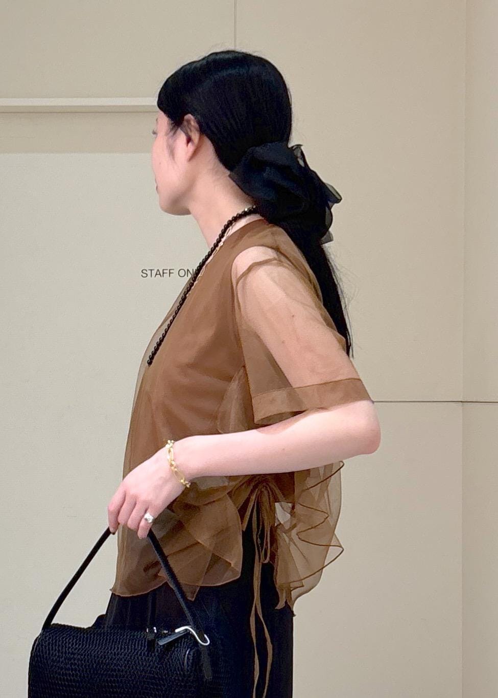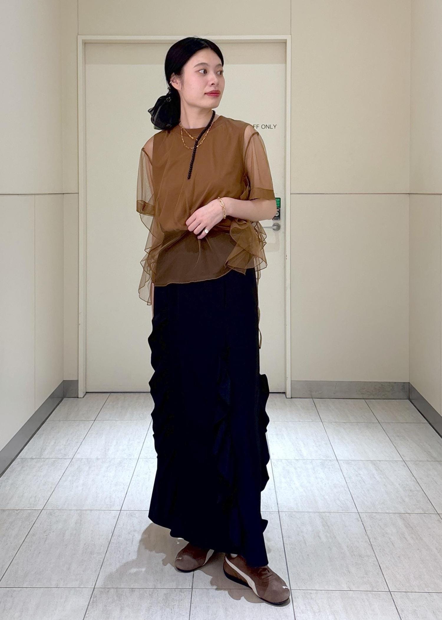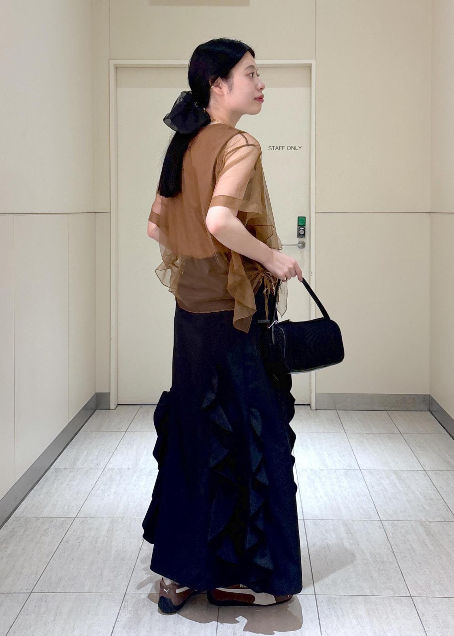 チュール素材の透け感が涼しげな印象でかれるのでオススメです!ブラウンは黒と合わせても柔らかい印象で着れますのでおすすめですよ♪