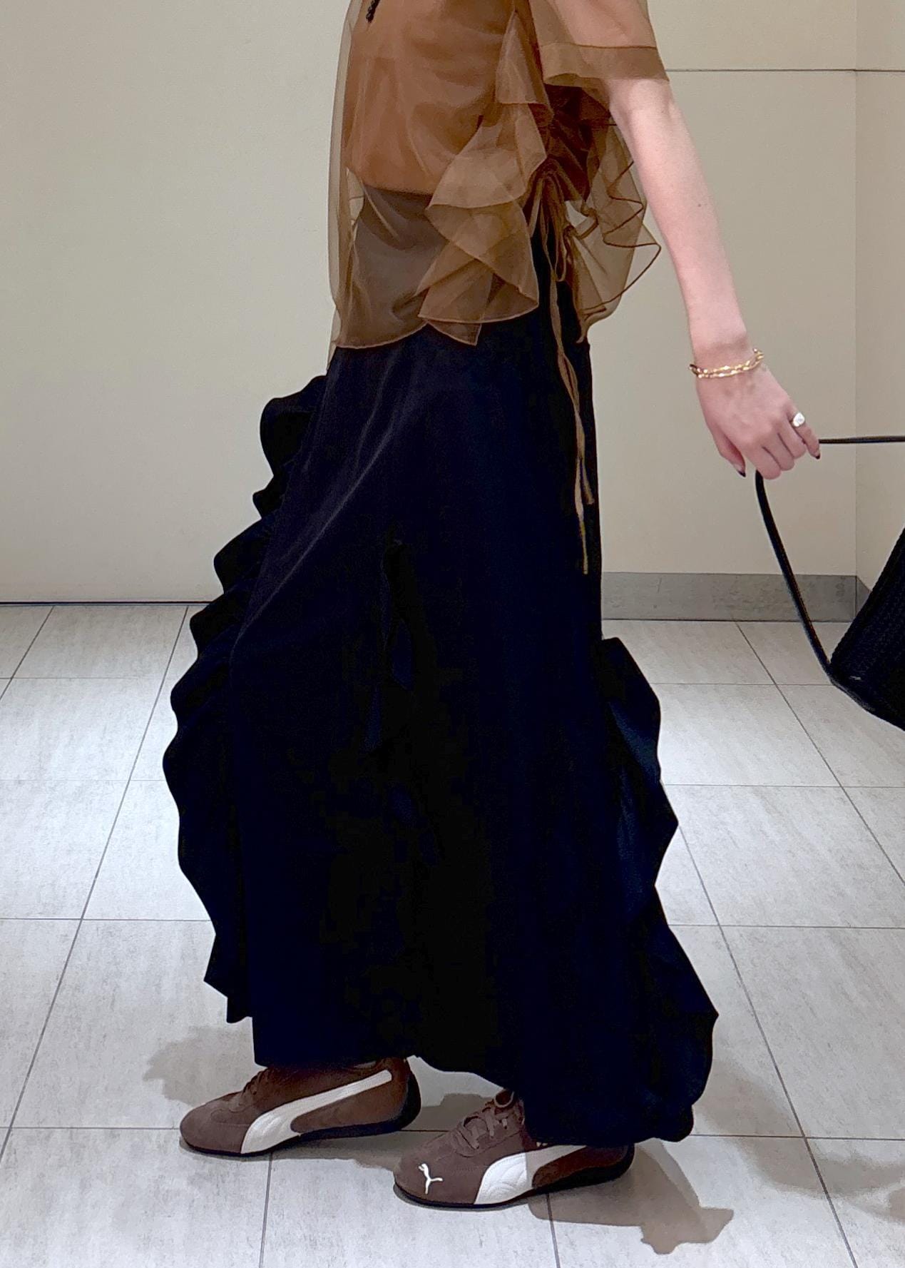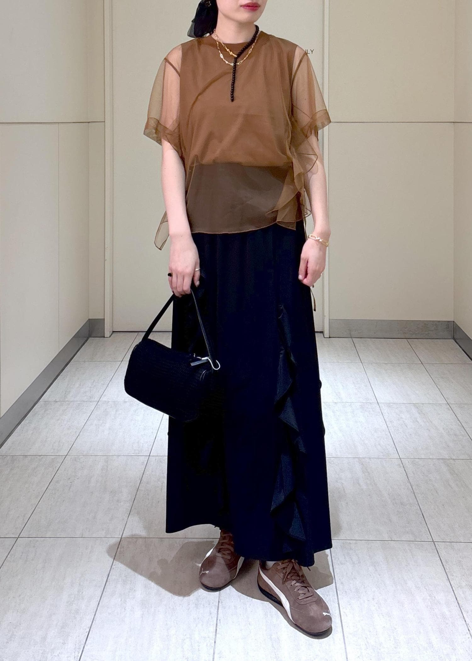 私は今季新色のブラウンを、黒のスカートと足元はスニーカーで合わせて大人カジュアルなスタイリングにしてみました。