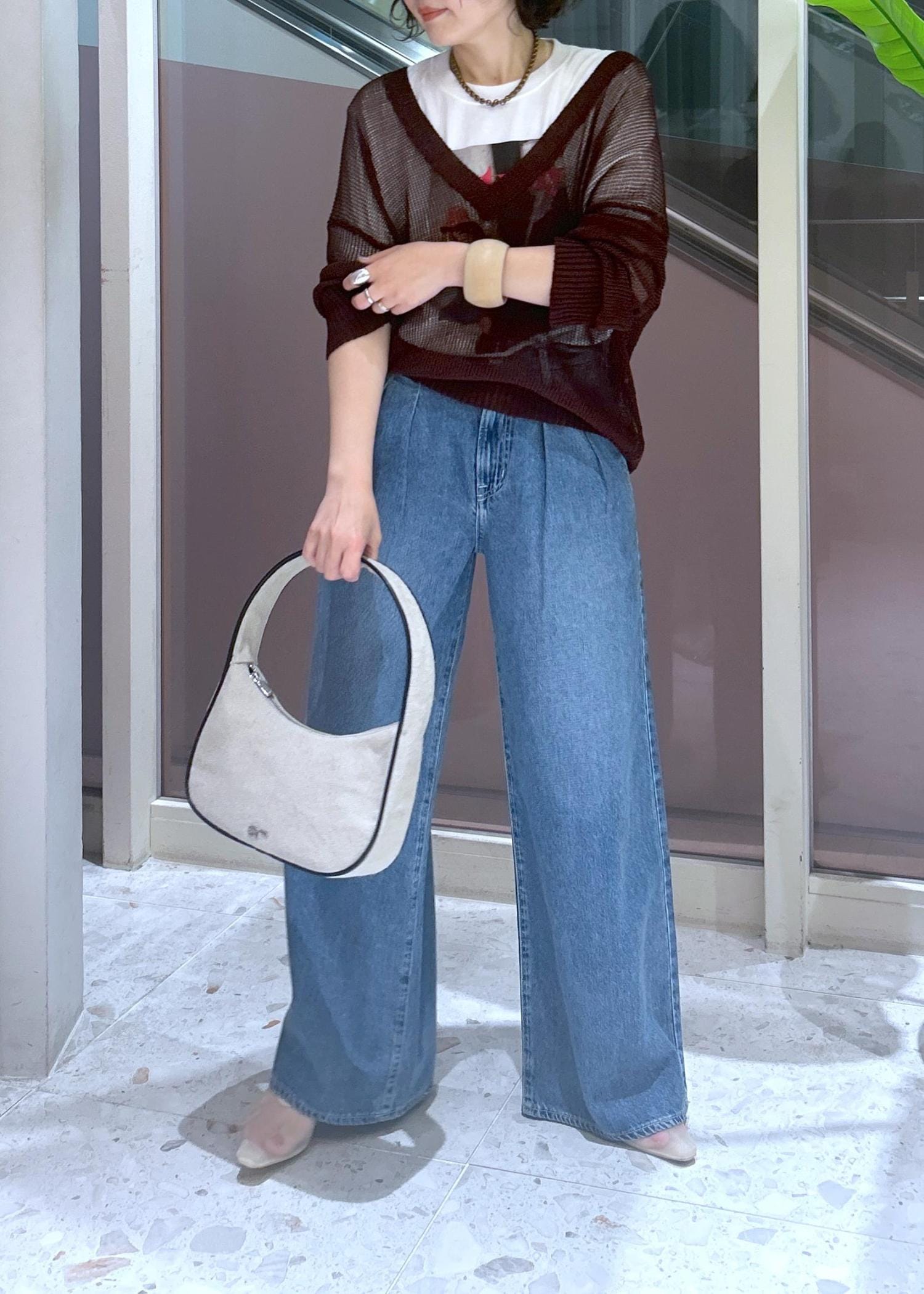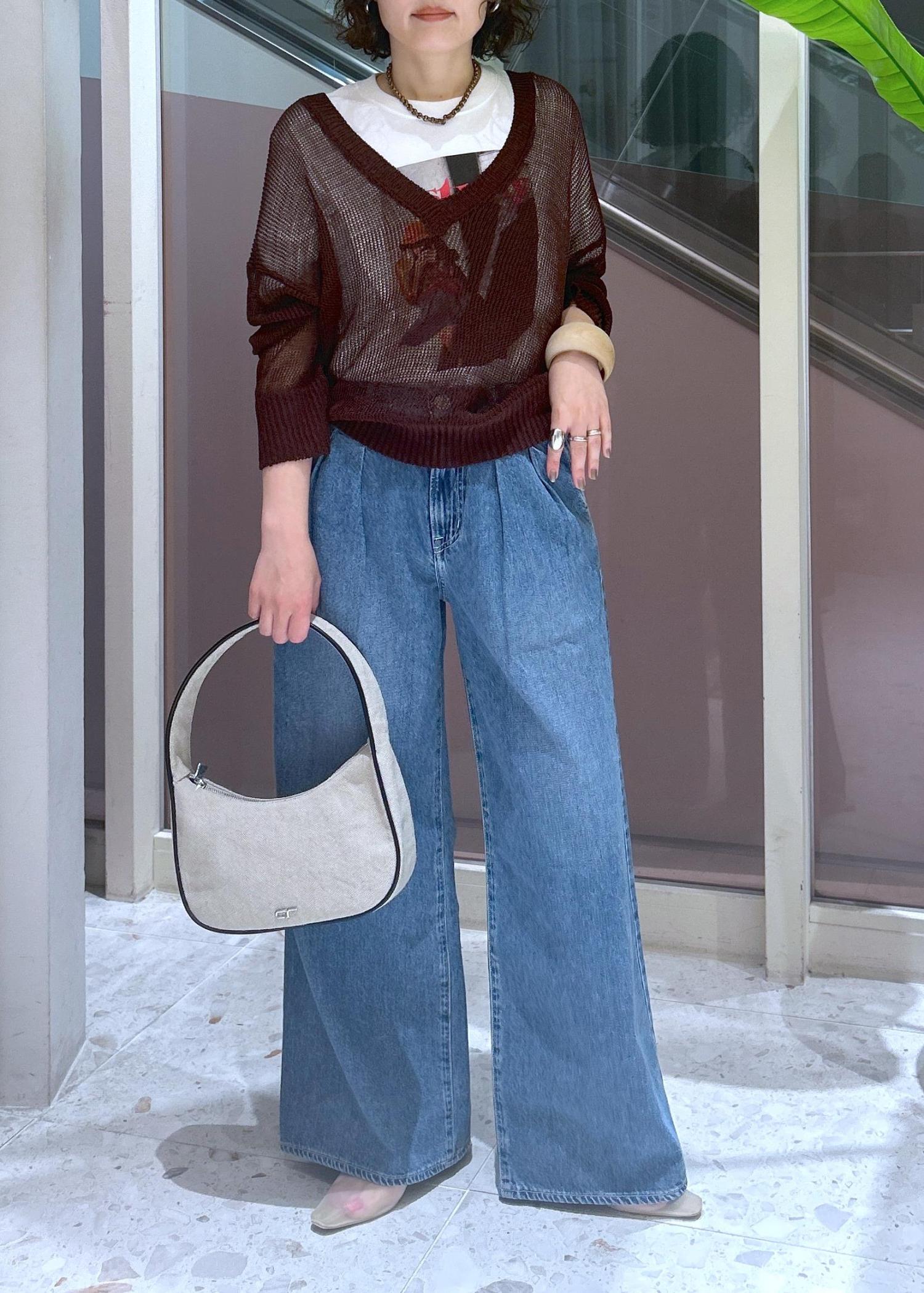 深めのVネックが抜け感を出してくれ、リラックス感ある見え方に。インナーはキャミソールやタンクトップでゆるっとヘルシーに着ても可愛いですが、プリントTシャツを着るのも印象が変わって素敵です。重ね着も楽しめるので、幅広いスタイリングに活躍しそうな予感です!