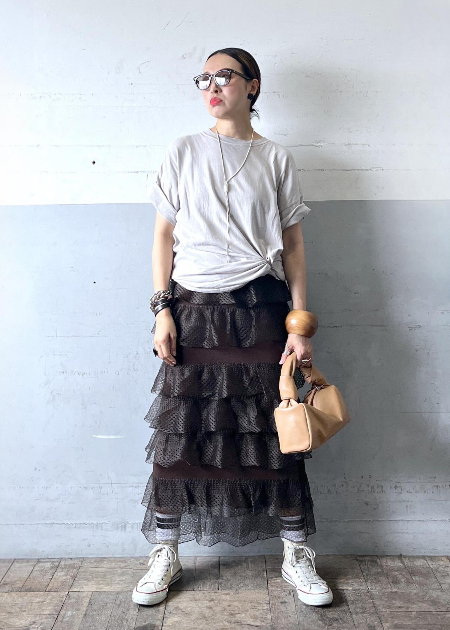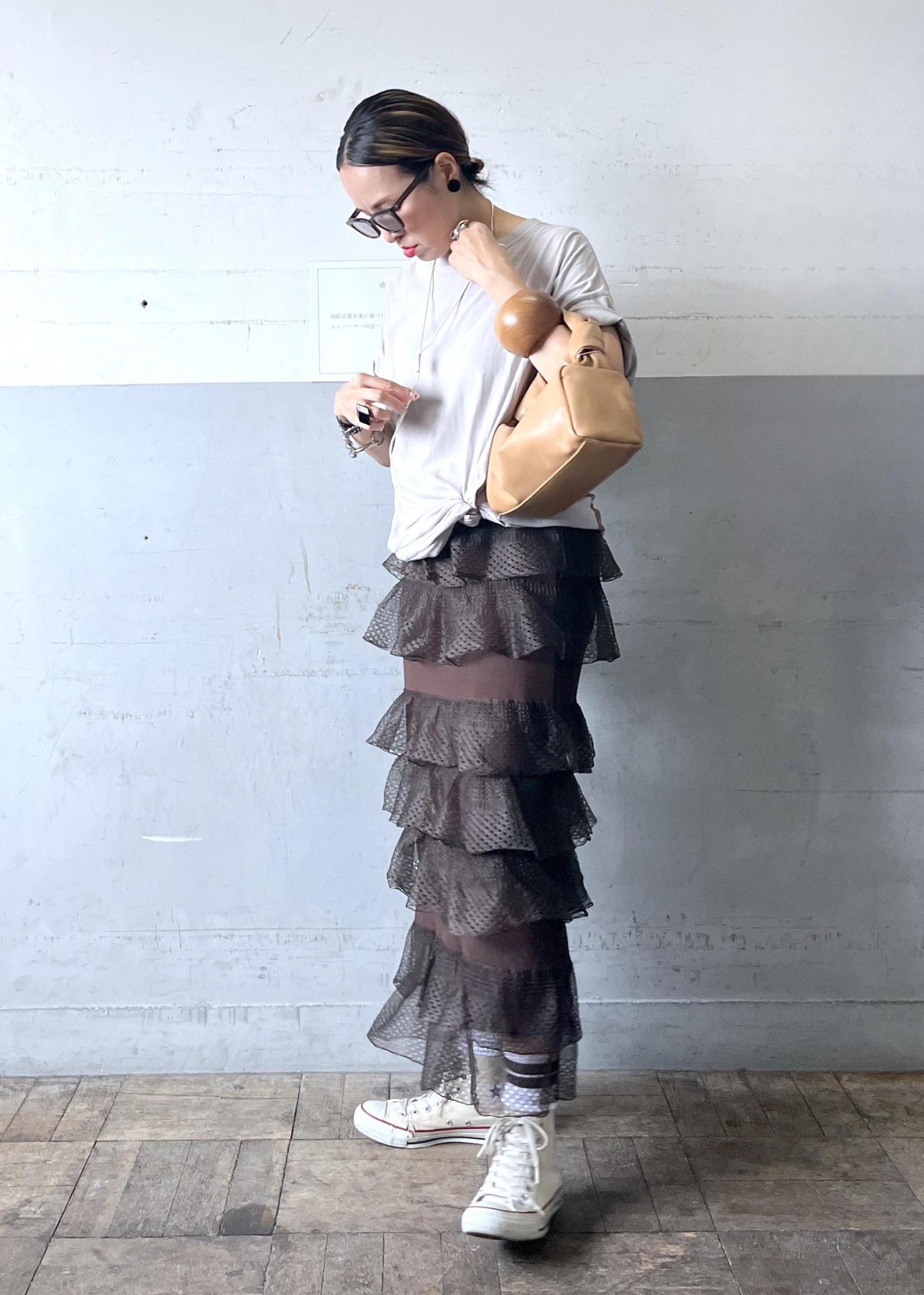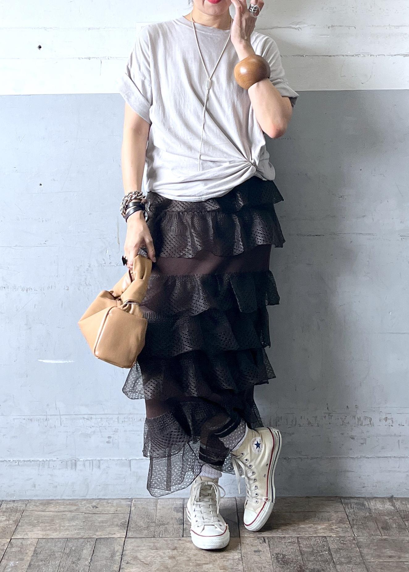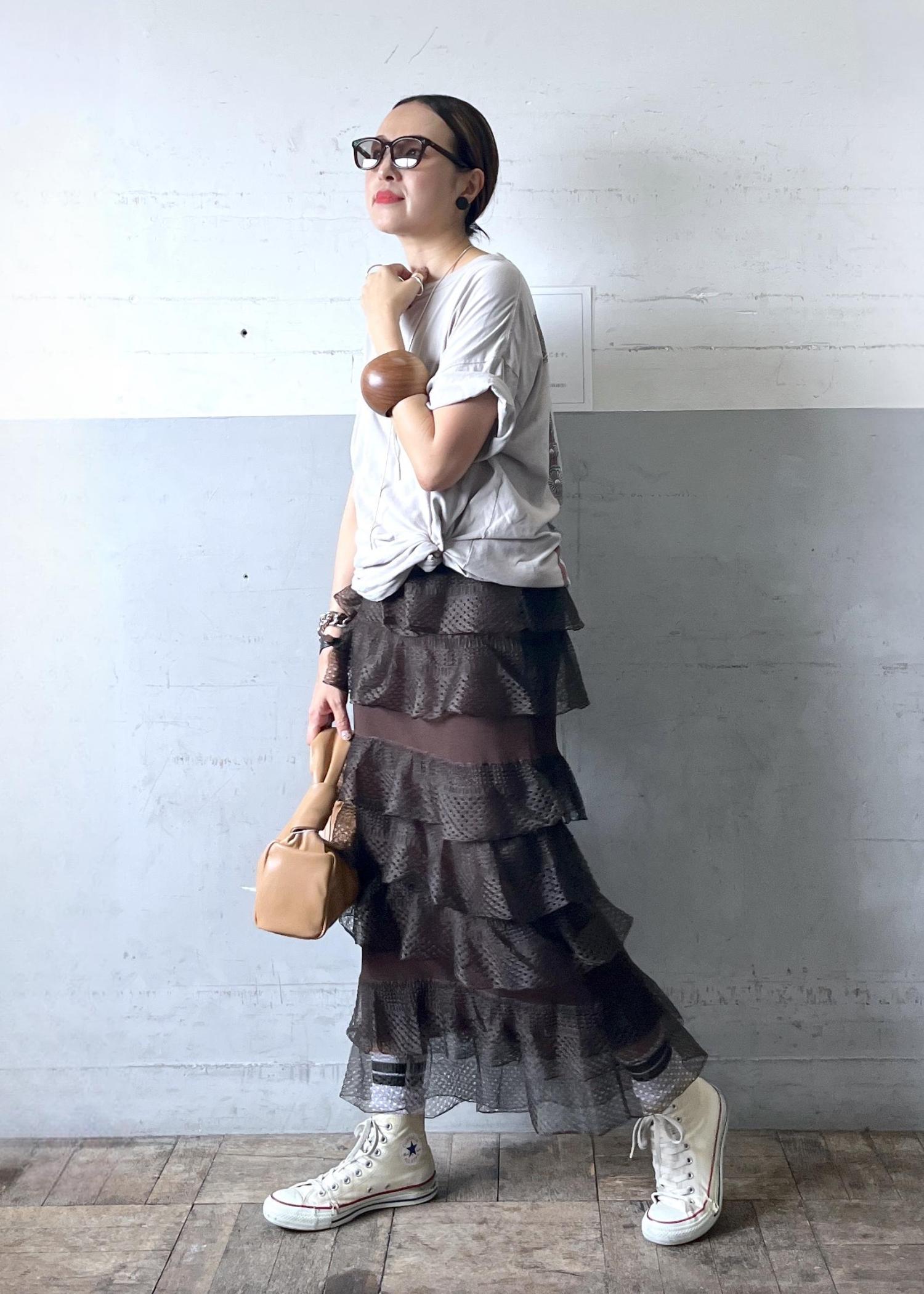 ADAM ET ROPÉ FEMMEシアーフリルスカートダークブラウン / F¥19,800レビュー伸縮性のある素材で着丈もやや長めです。ウエストゴムがとても楽ちん♫ Tシャツでカジュアルに合わせてもブラウスで綺麗にまとめても◎ 1枚あると便利なアイテムです。