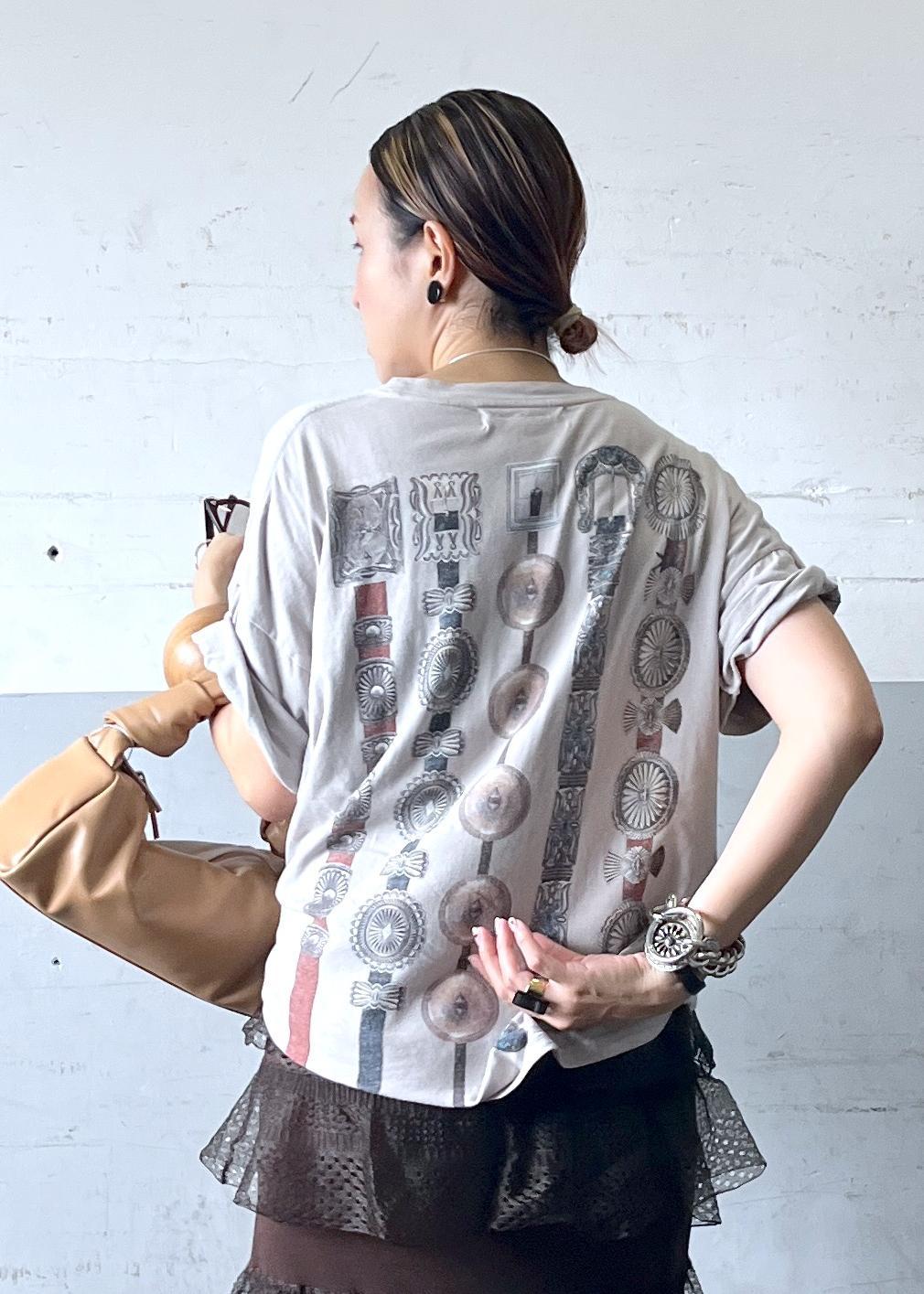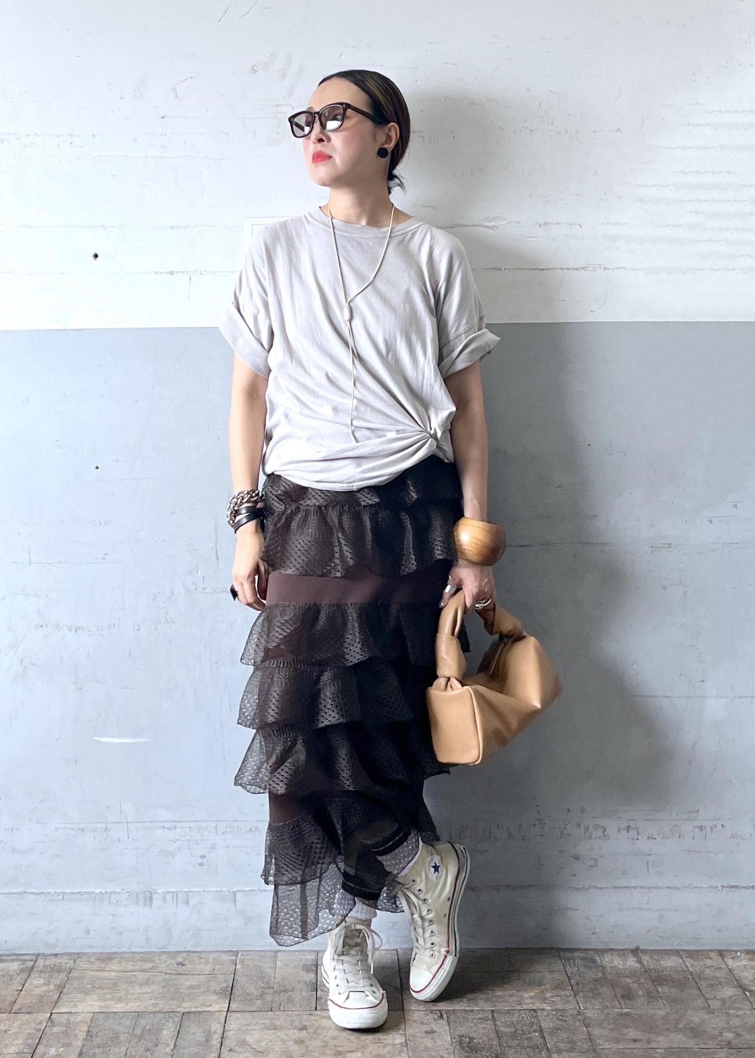 『河端さん細いやん』とか言われますがほんまに細くないんですよ!現に、このスカート履いててもウエスト周りは隠してますもん。見せられない!そんな私でも細見えするからめっちゃ不思議。バックプリントが気に入って買ったレミレリーフのベルトTシャツ、やっと!ここにきて相棒を見つけた!そんな嬉しさMAXのスタイリング♡