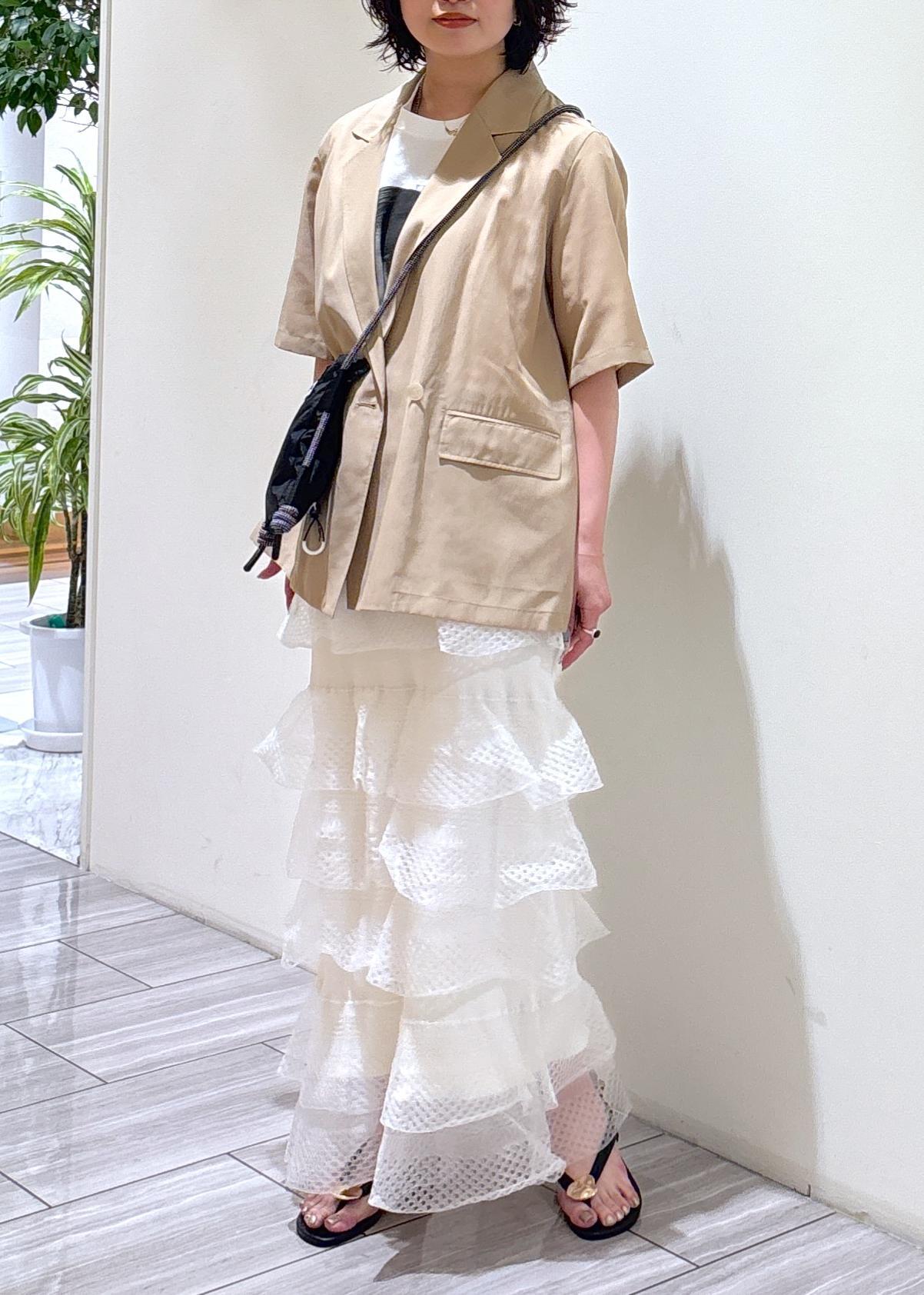 Tシャツやジャケットで合わせると甘くなりすぎずに着られます☺︎