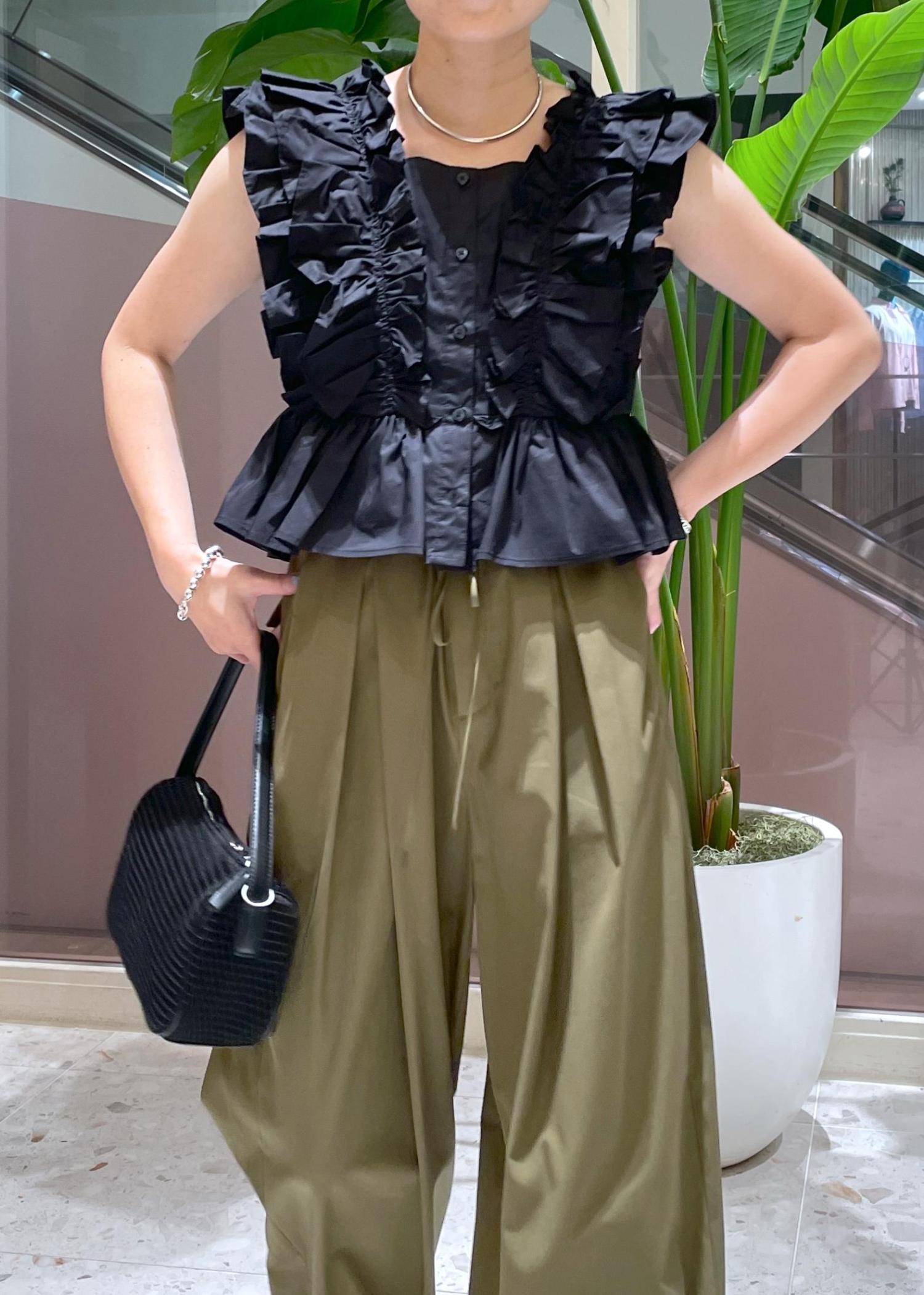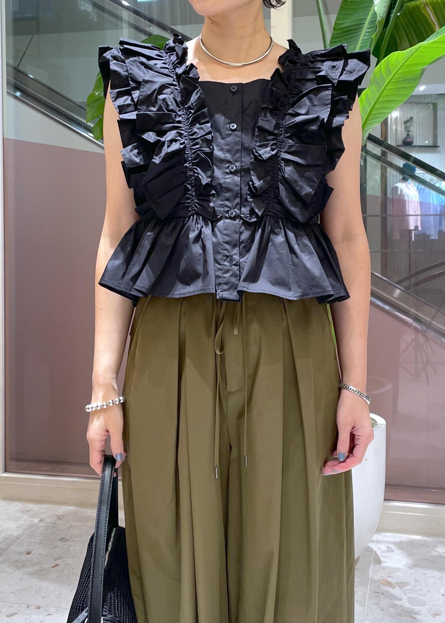 ボリューム感のあるフリルデザインと短丈のバランスがとても可愛いく、一枚で主役になるブラウス。