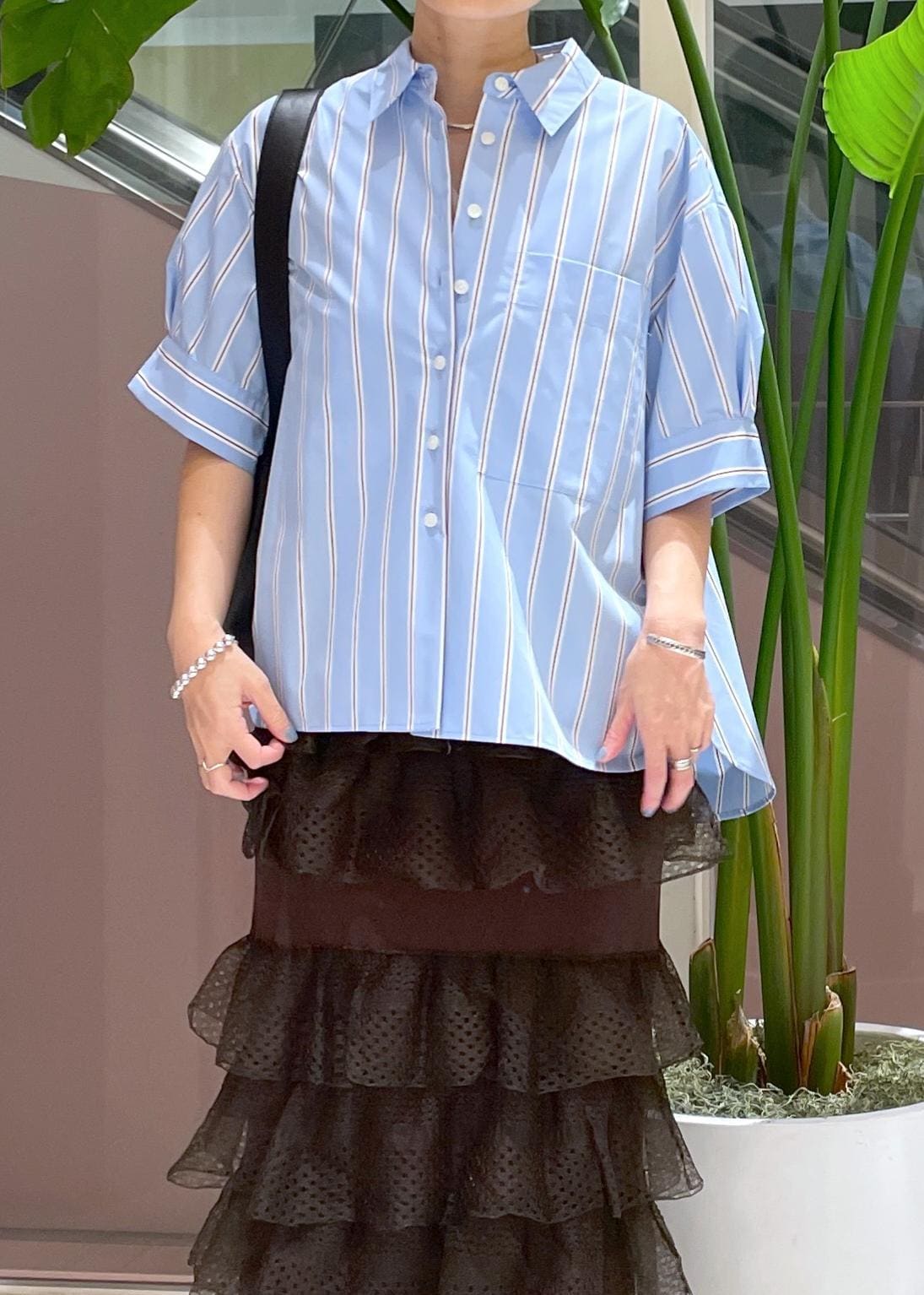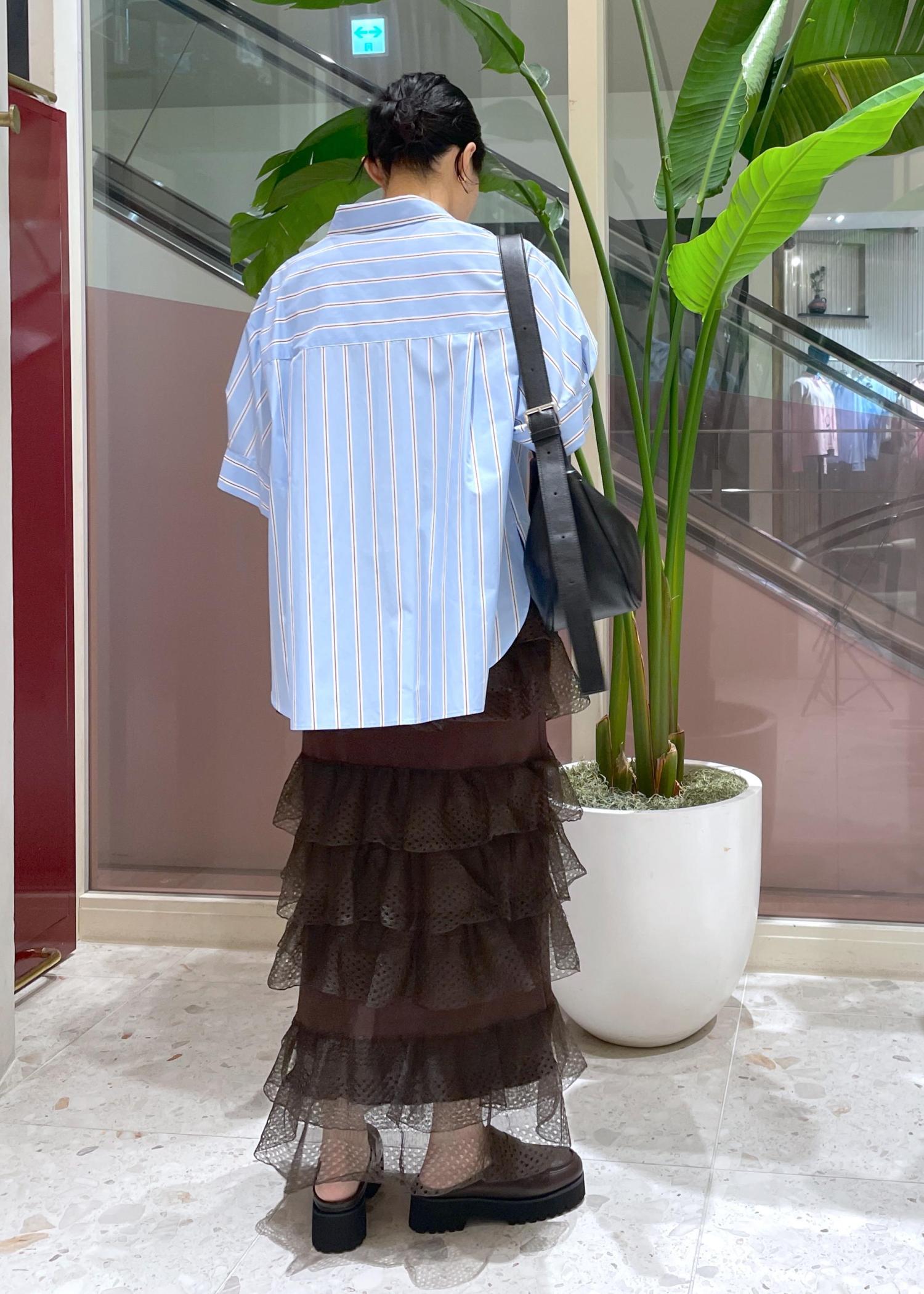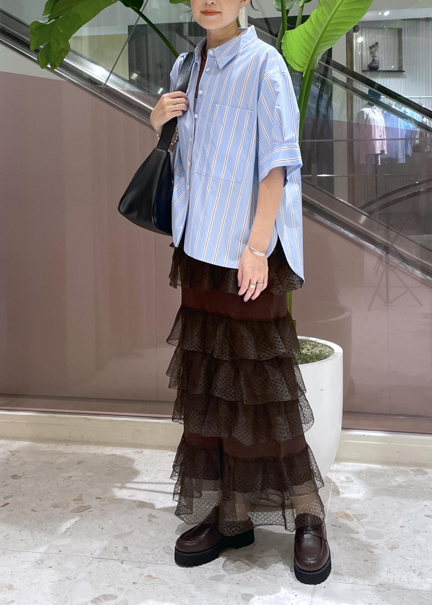 シンプルなTシャツに合わせるだけで可愛いのですが、今回は半袖シャツを合わせたスタイルに。