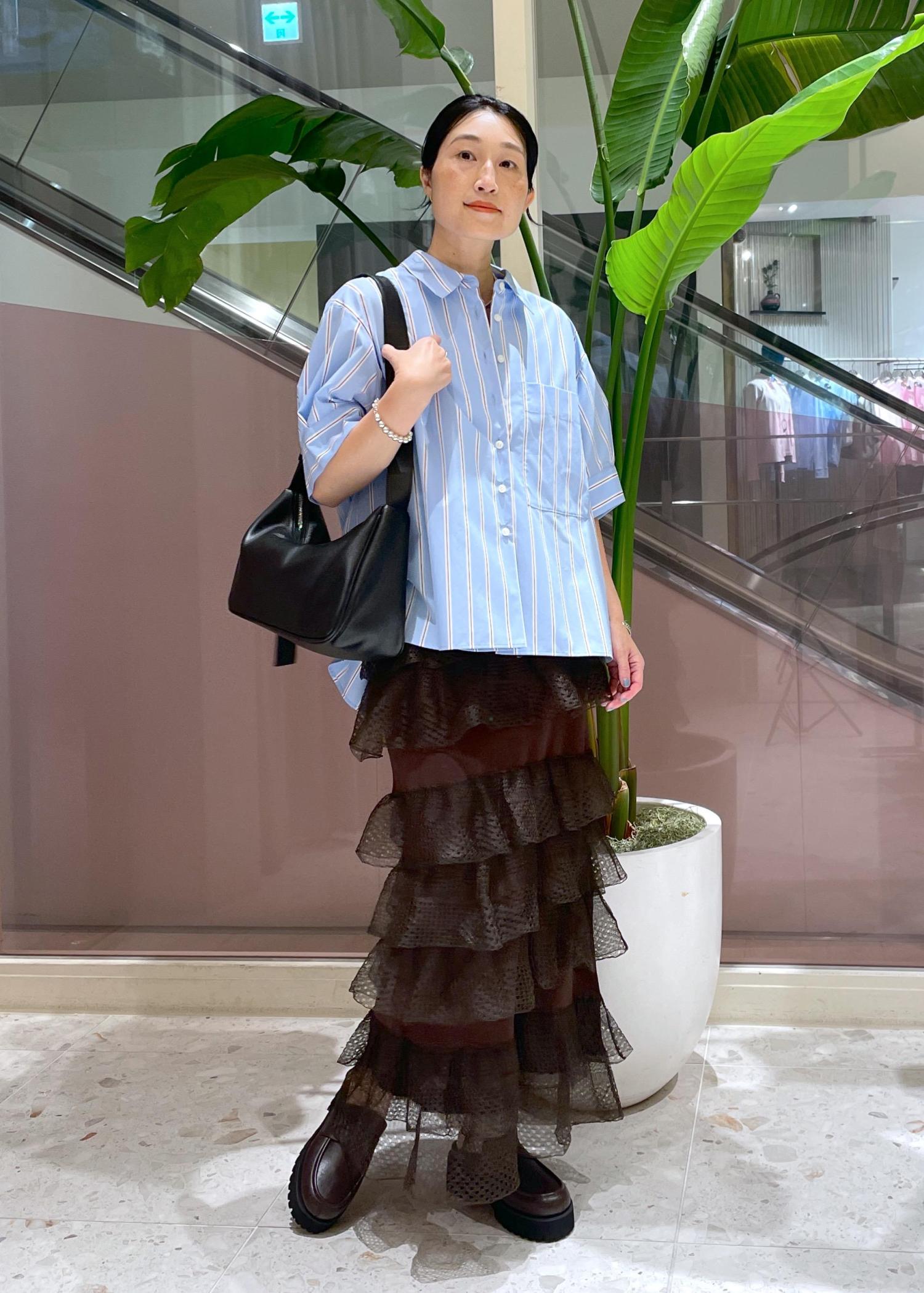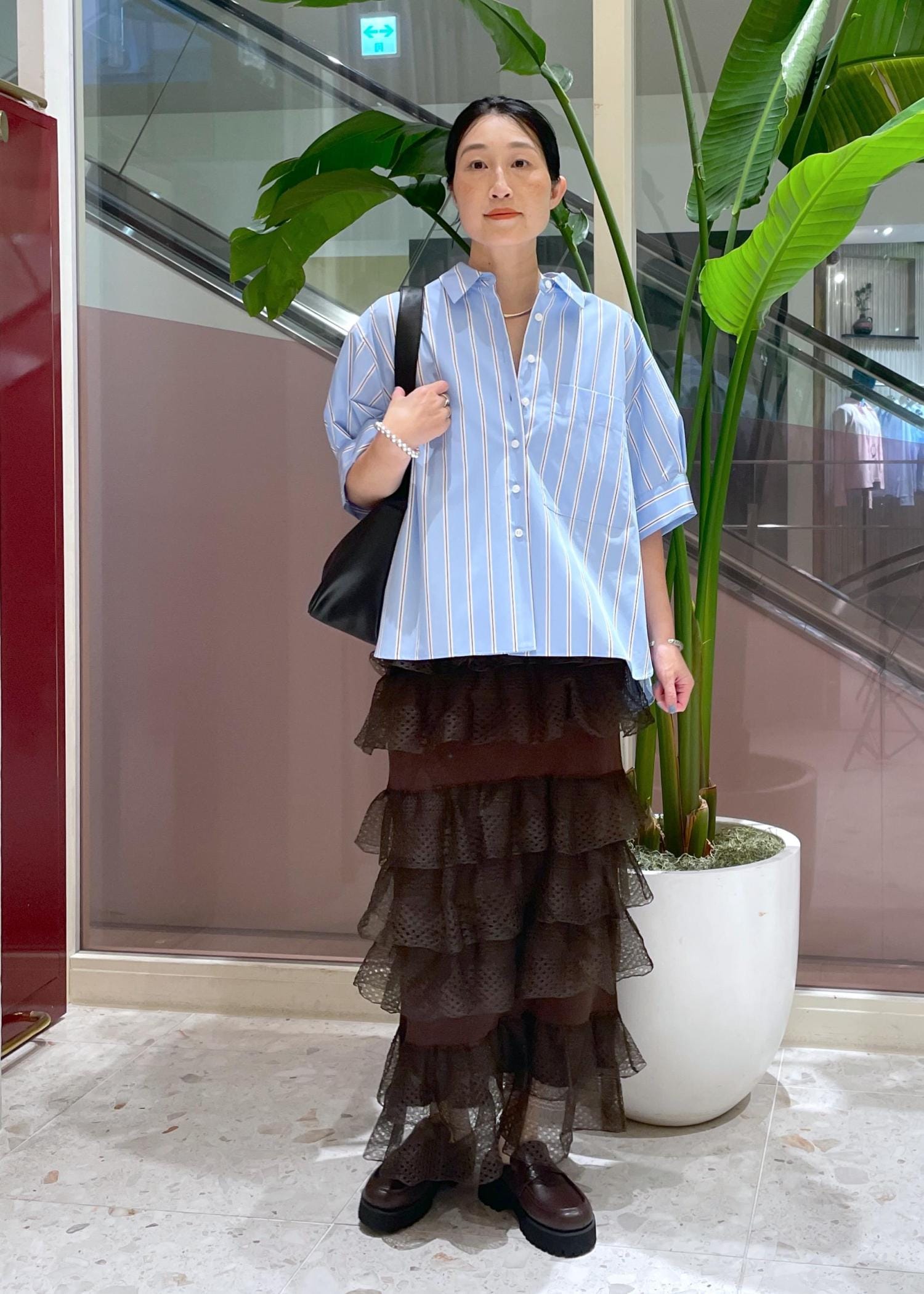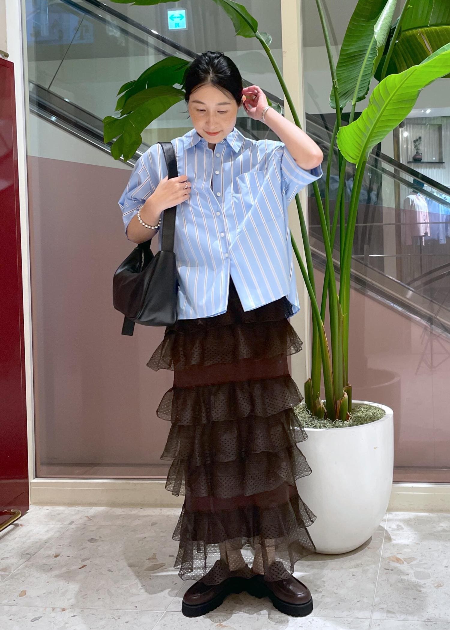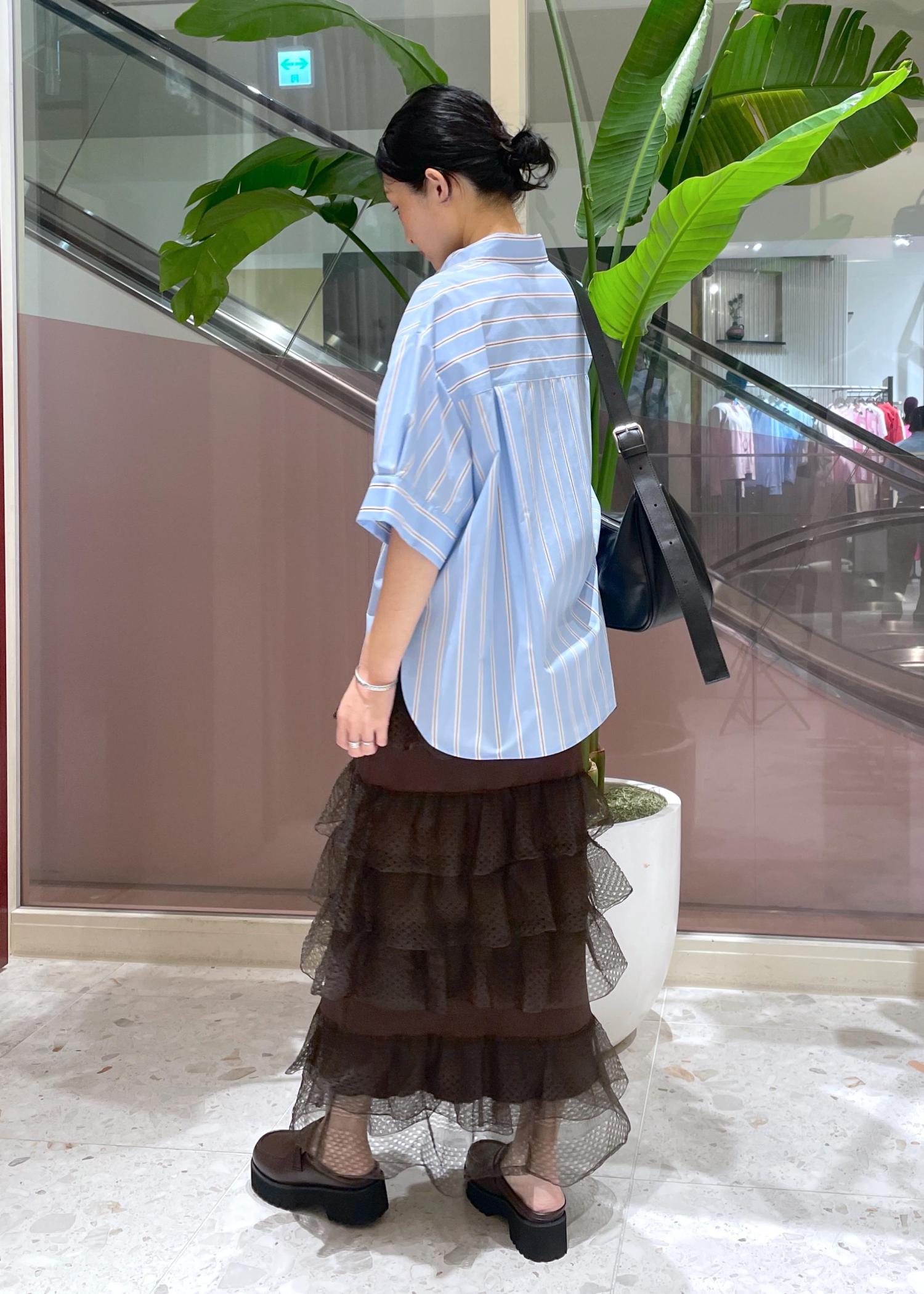 シンプルなTシャツに合わせるだけで可愛いのですが、今回は半袖シャツを合わせたスタイルに。