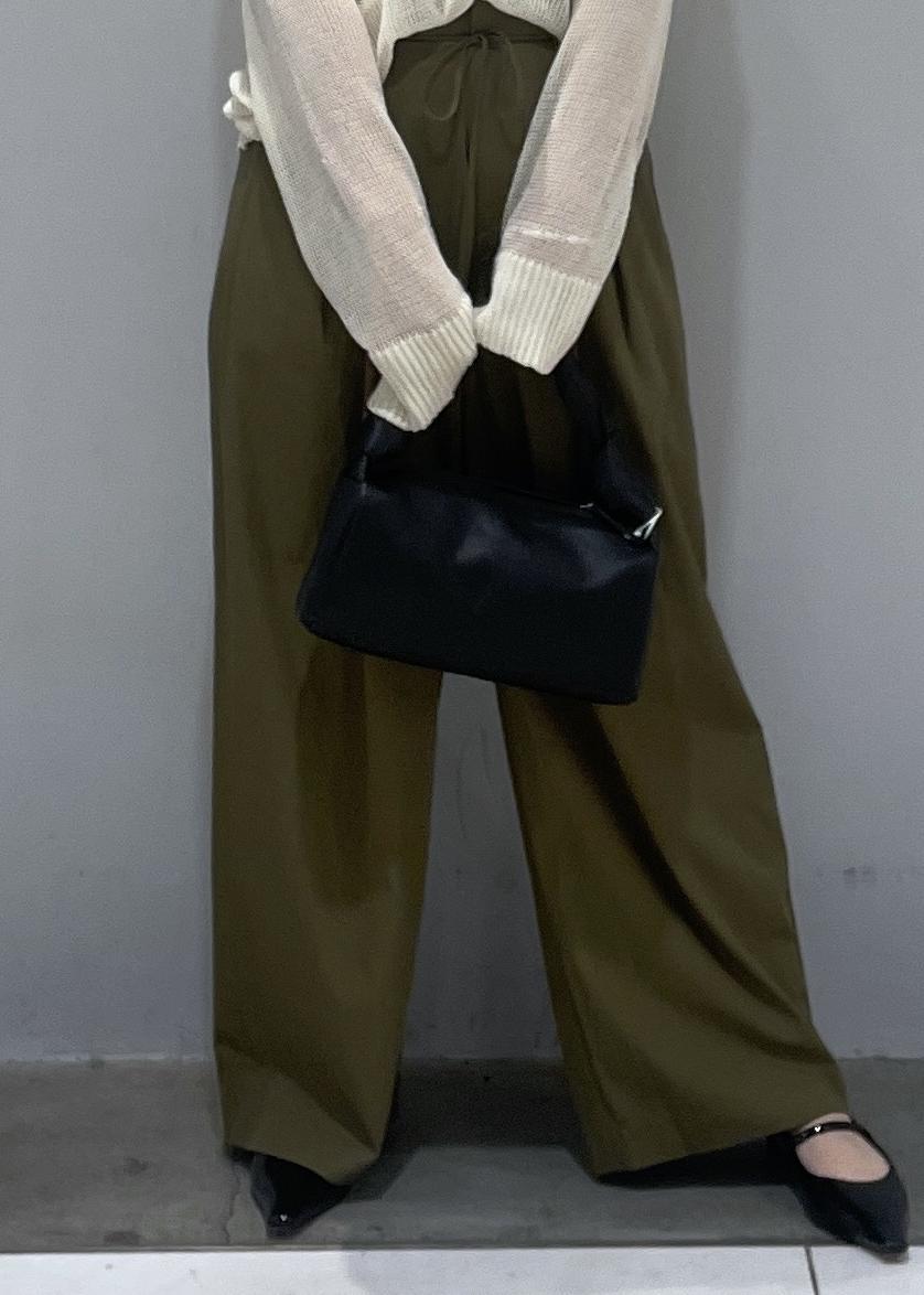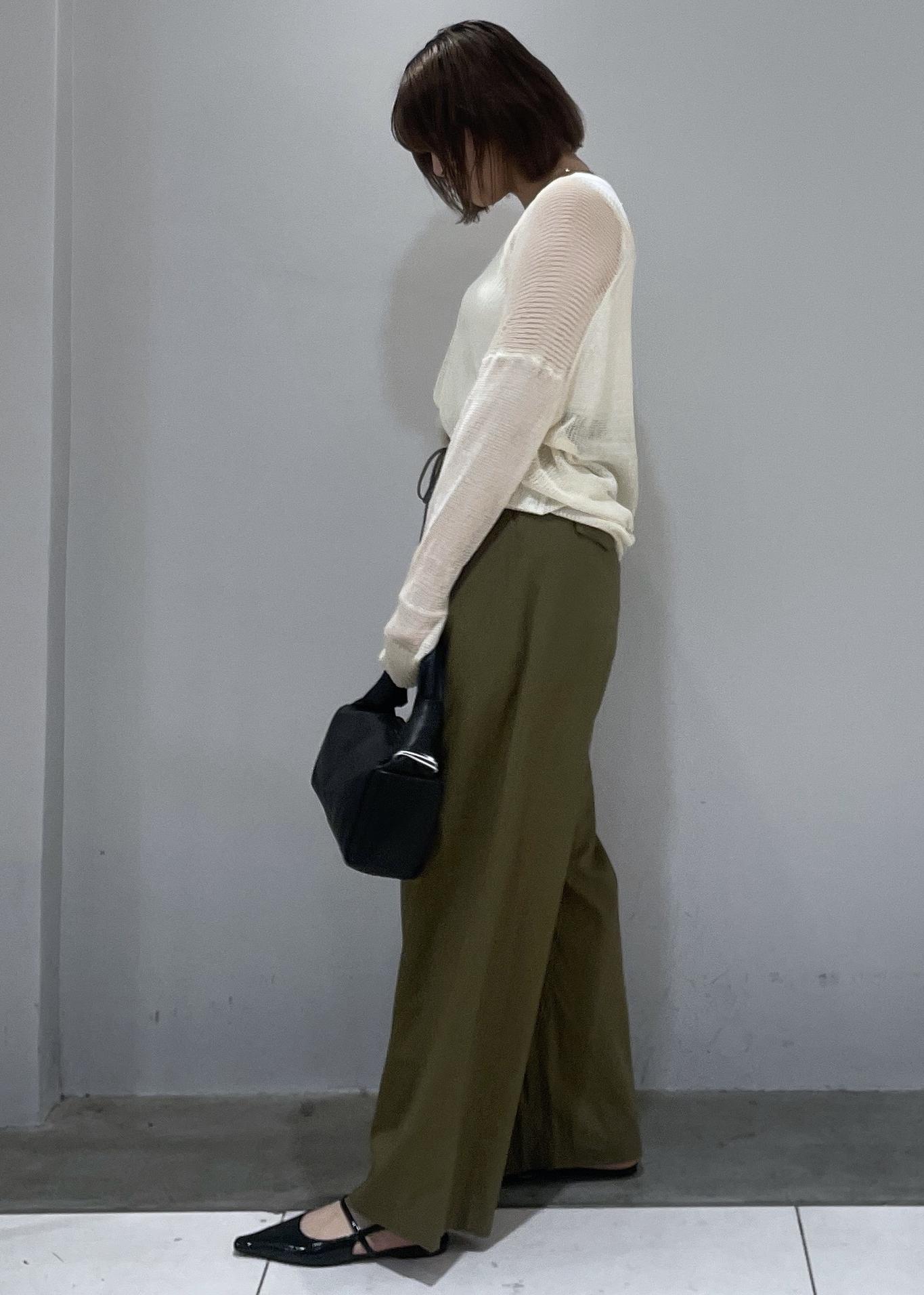 くすみ感の少ない、鮮やかなカーキボトムスが落ち着いた印象の中に華やかさをプラスしてくれます。