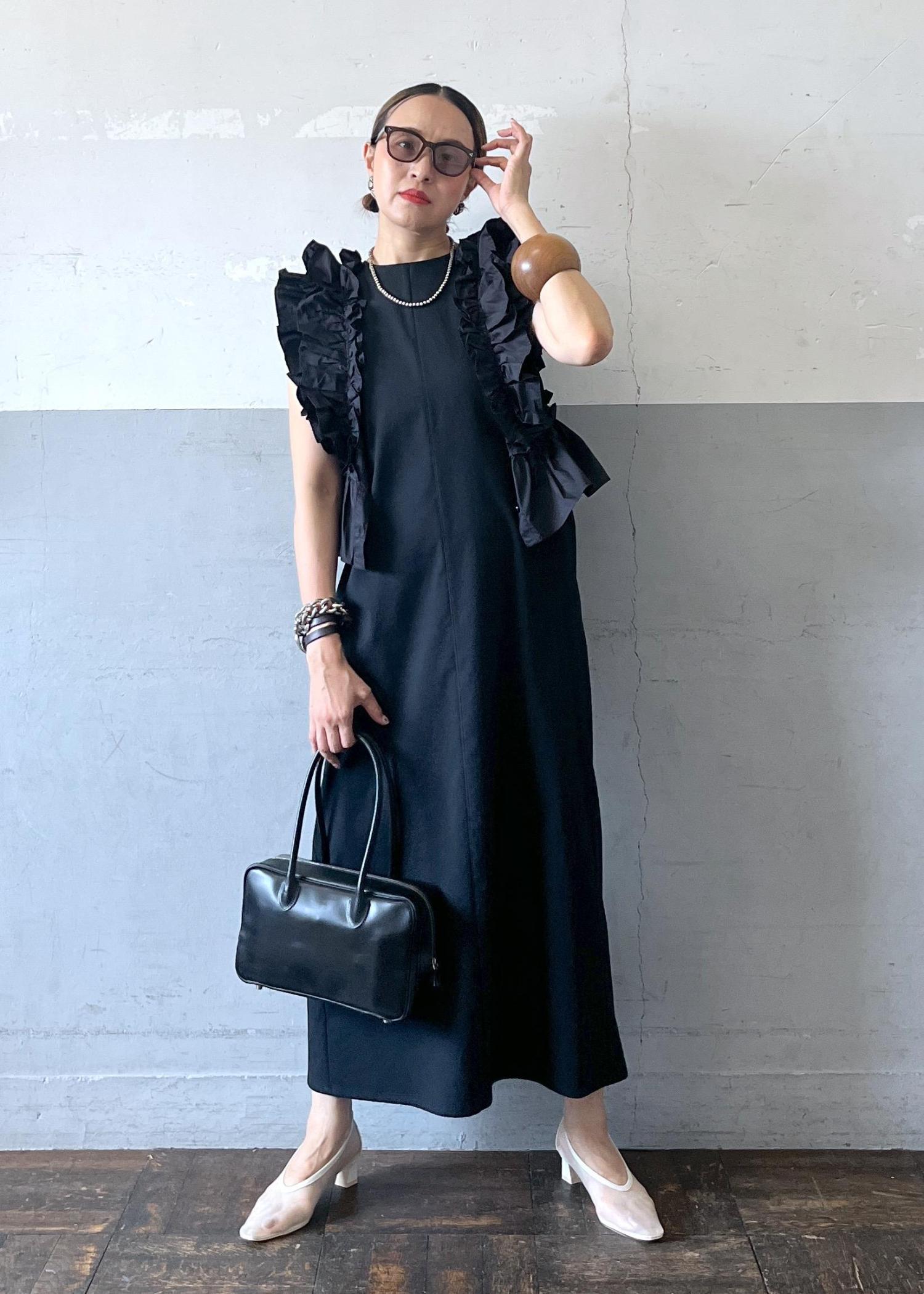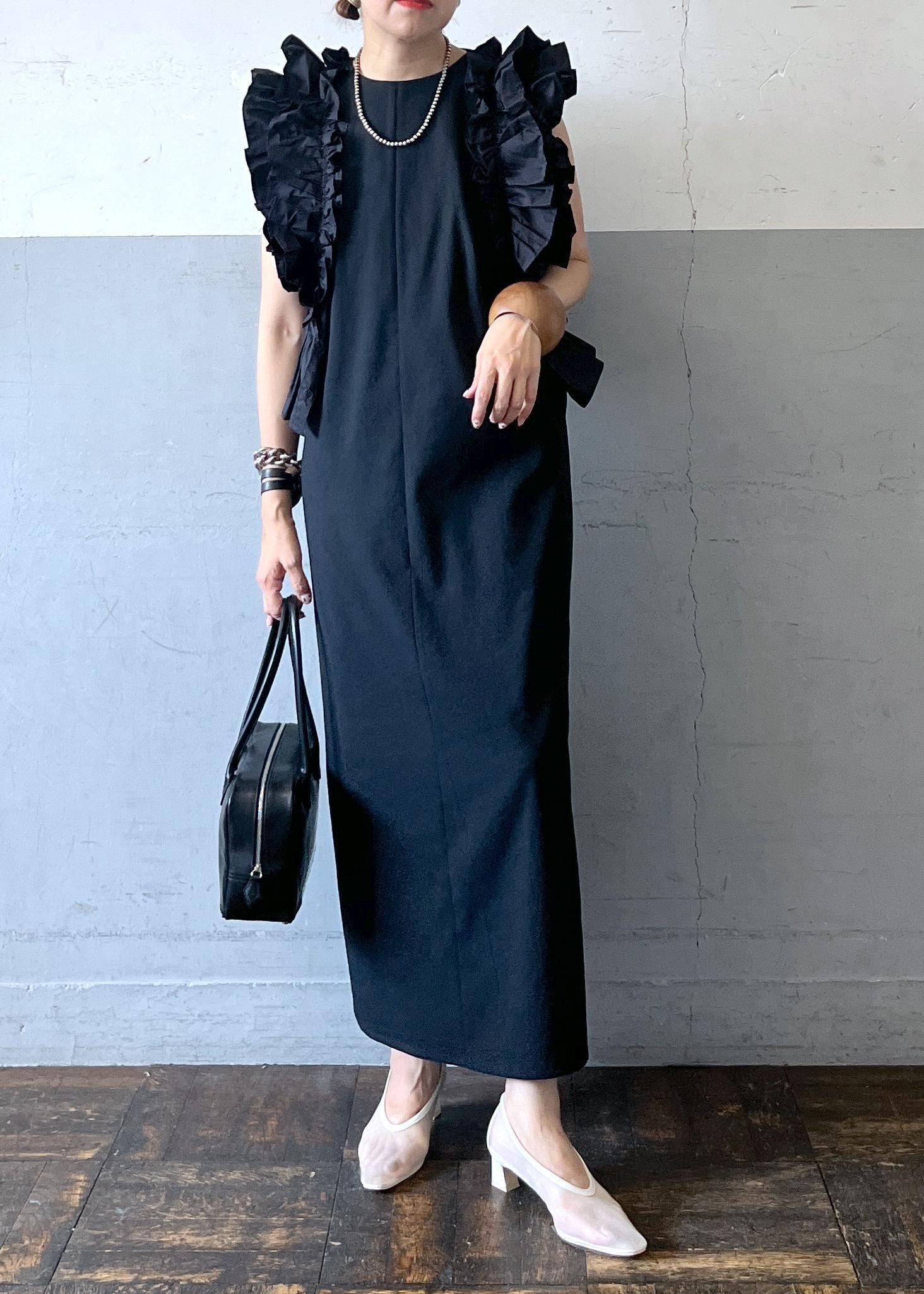 ADAM ET ROPÉ FEMMEバックオープンストレートワンピースブラック / F¥19,910レビュー身長166cmの私で足首が少し見えるくらいの長さです。身幅もゆったりですがすっきり見えしてくれるのが嬉しいです。バックスタイルもポイントになっているのでインナー使いも楽しめます♪