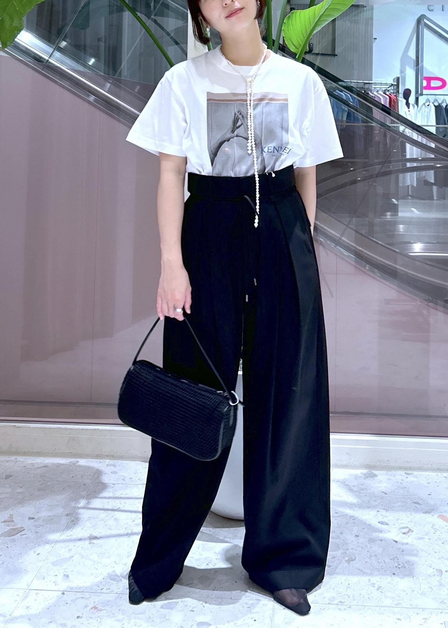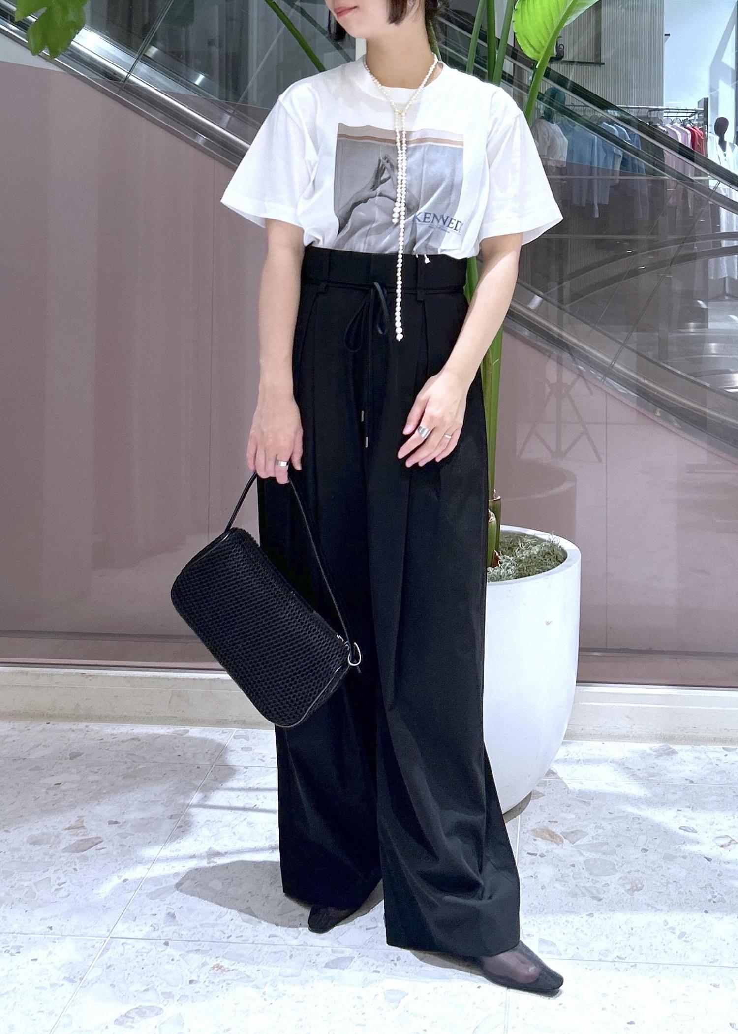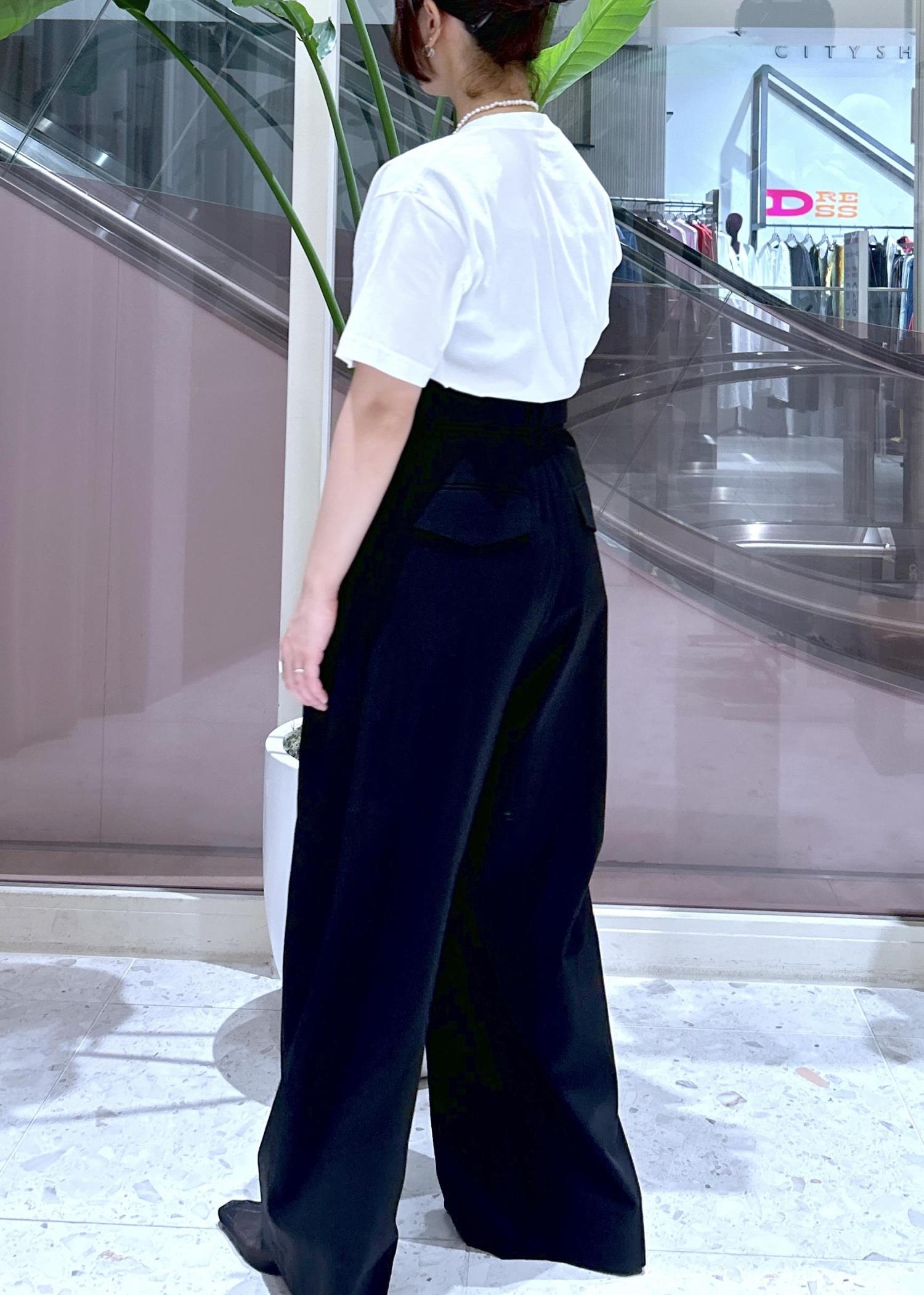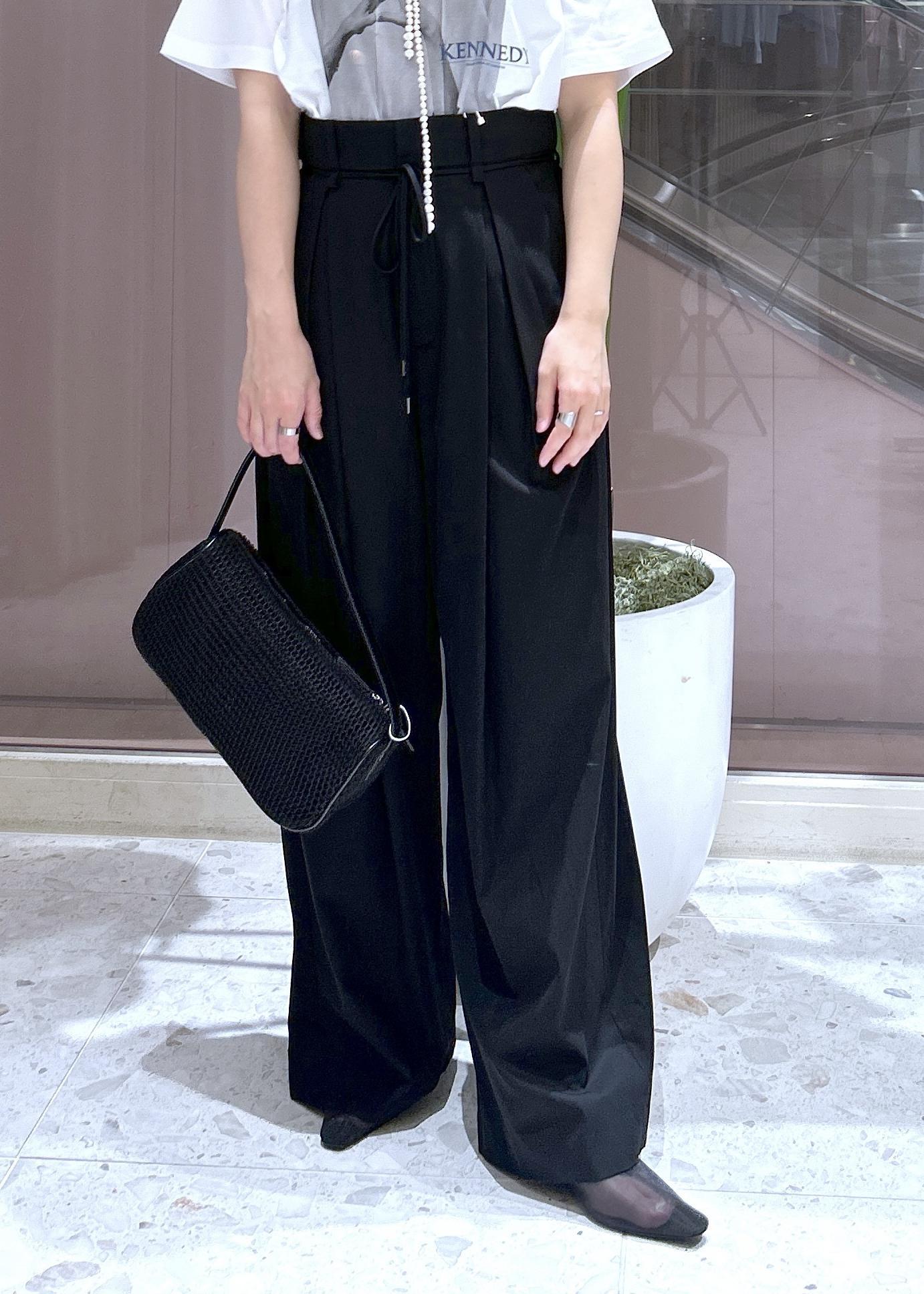 ADAM ET ROPÉ FEMMEドロストドカンパンツブラック / 36¥24,200レビュースタイリングではゆるっと履きたかったので36を着用しましたが34がジャストサイズです。ウエストに紐がついているのでぎゅっと絞ることもできます。すとんと落ちるシルエットで足が長く見えます!