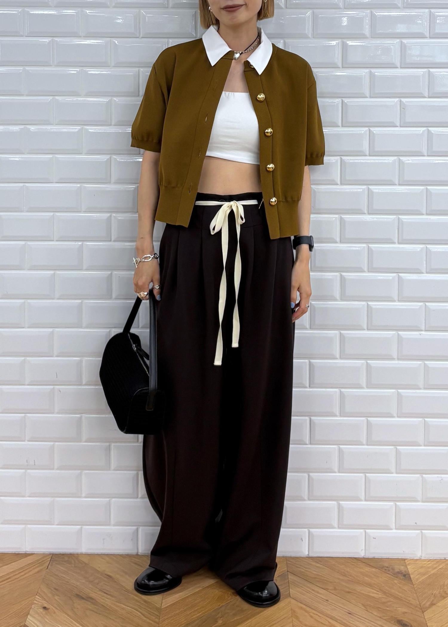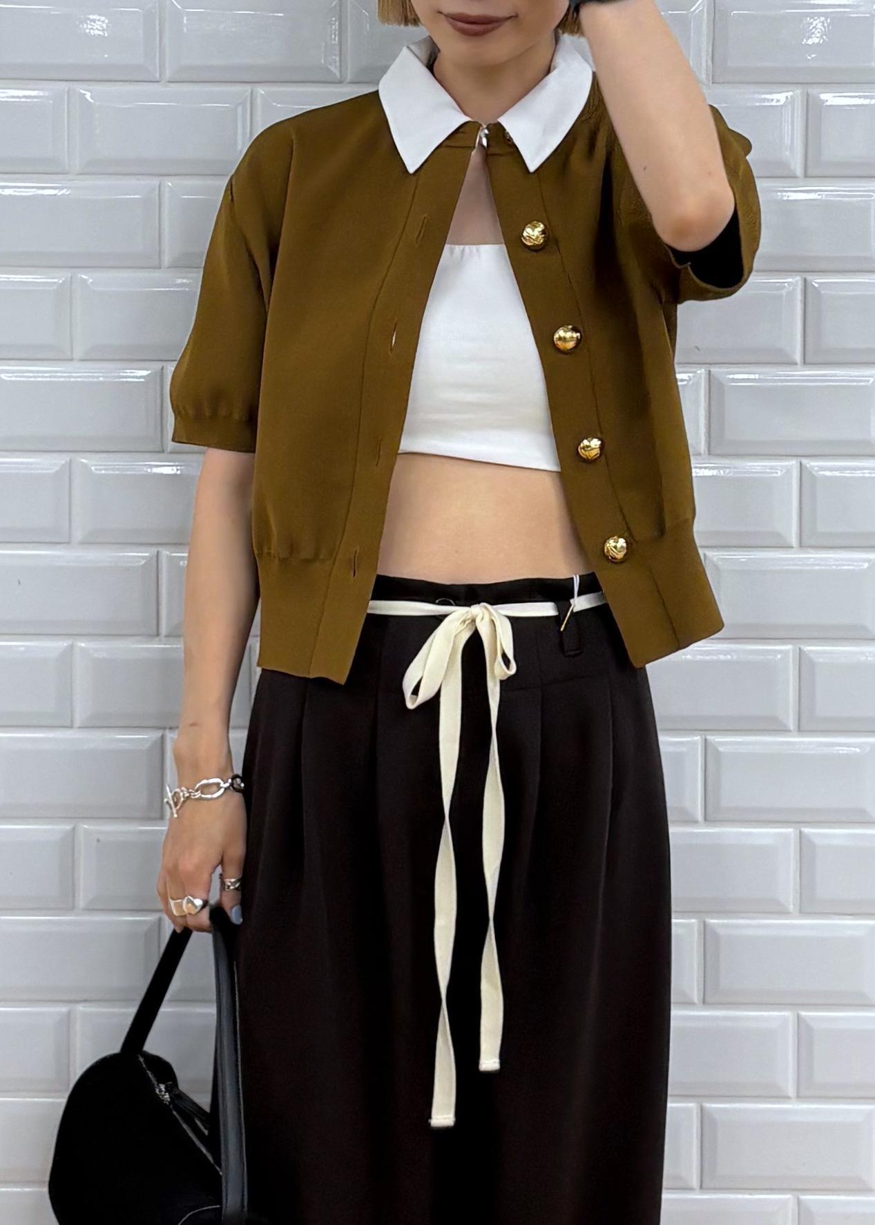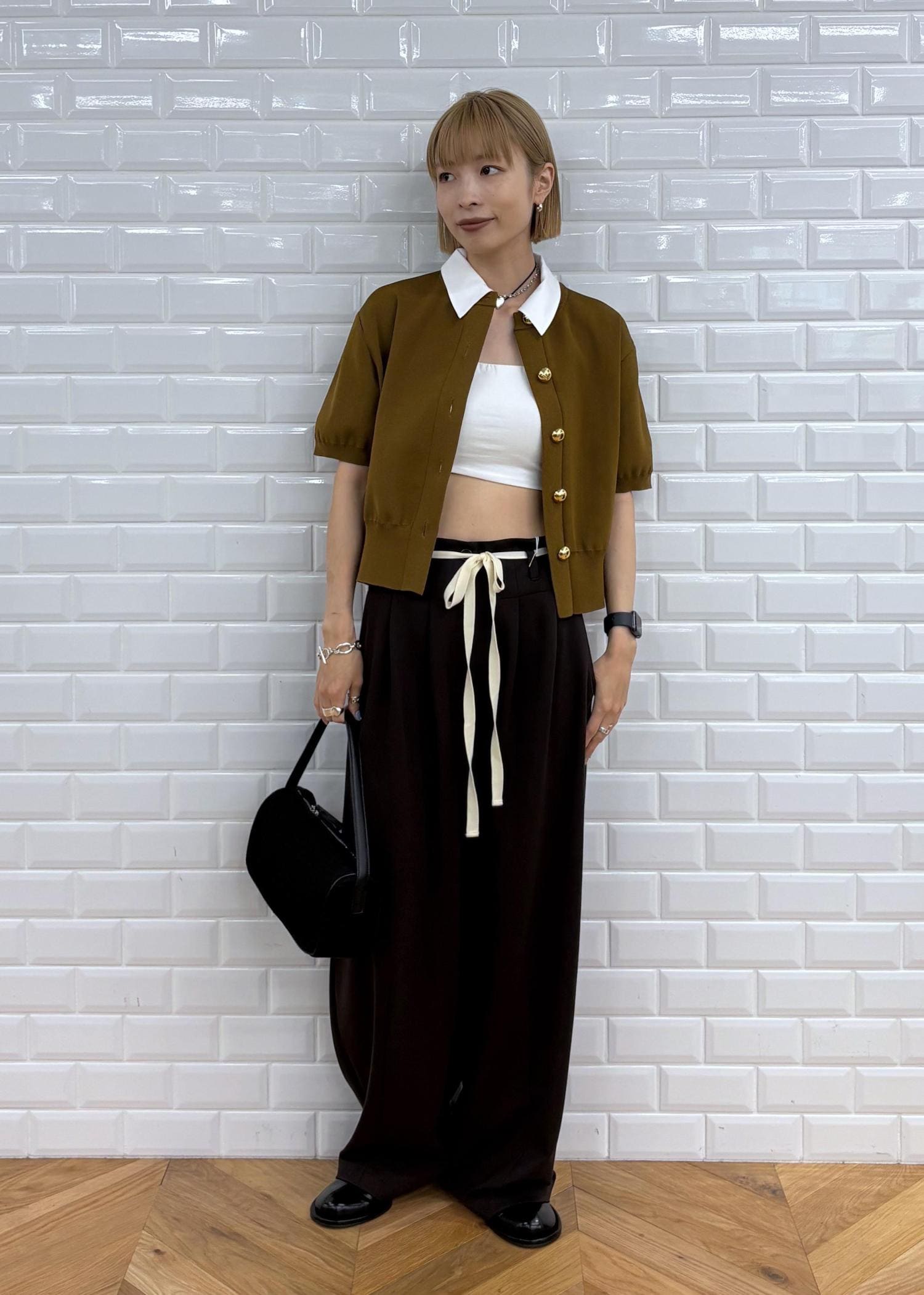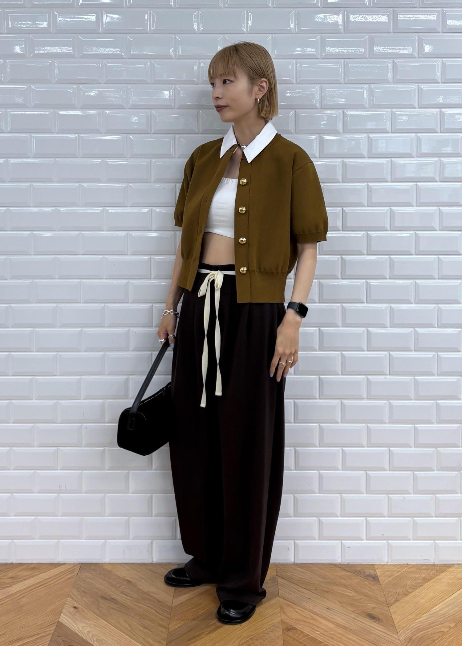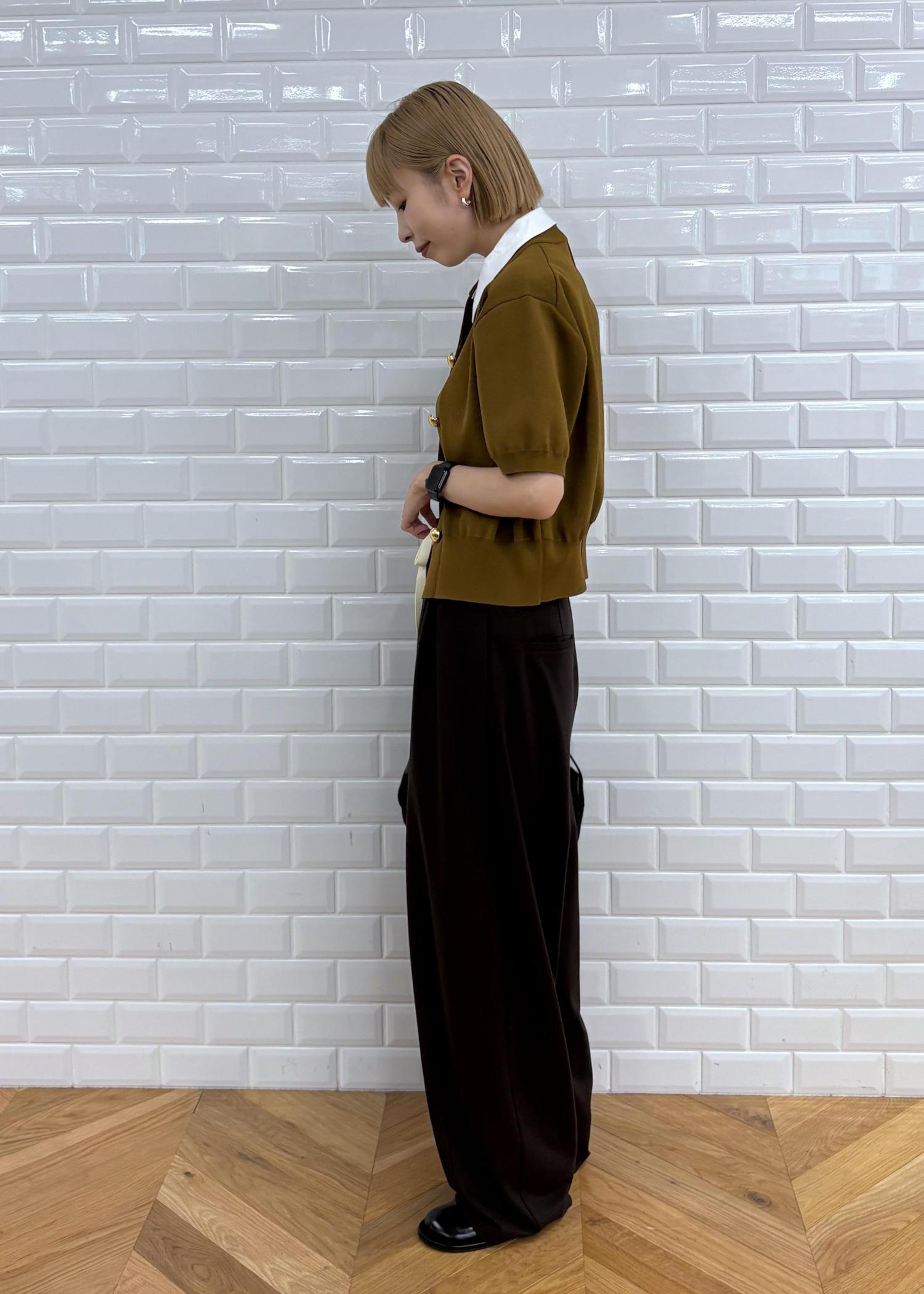 ADAM ET ROPÉ FEMME【サステナブル】カラー付きハーフスリーブカーディガンキャメル系 / F¥15,950レビュー162cm、フリーサイズ着用。