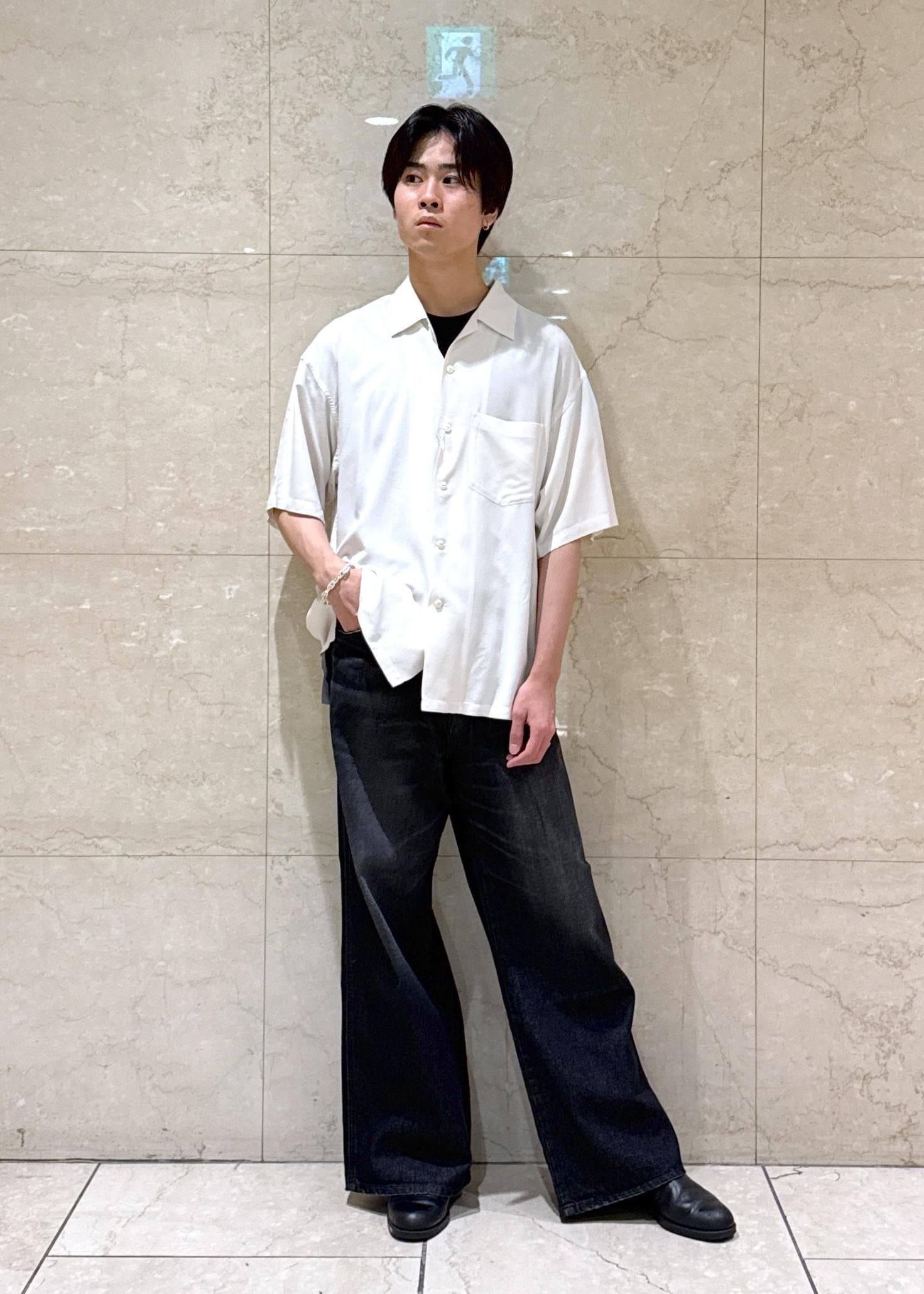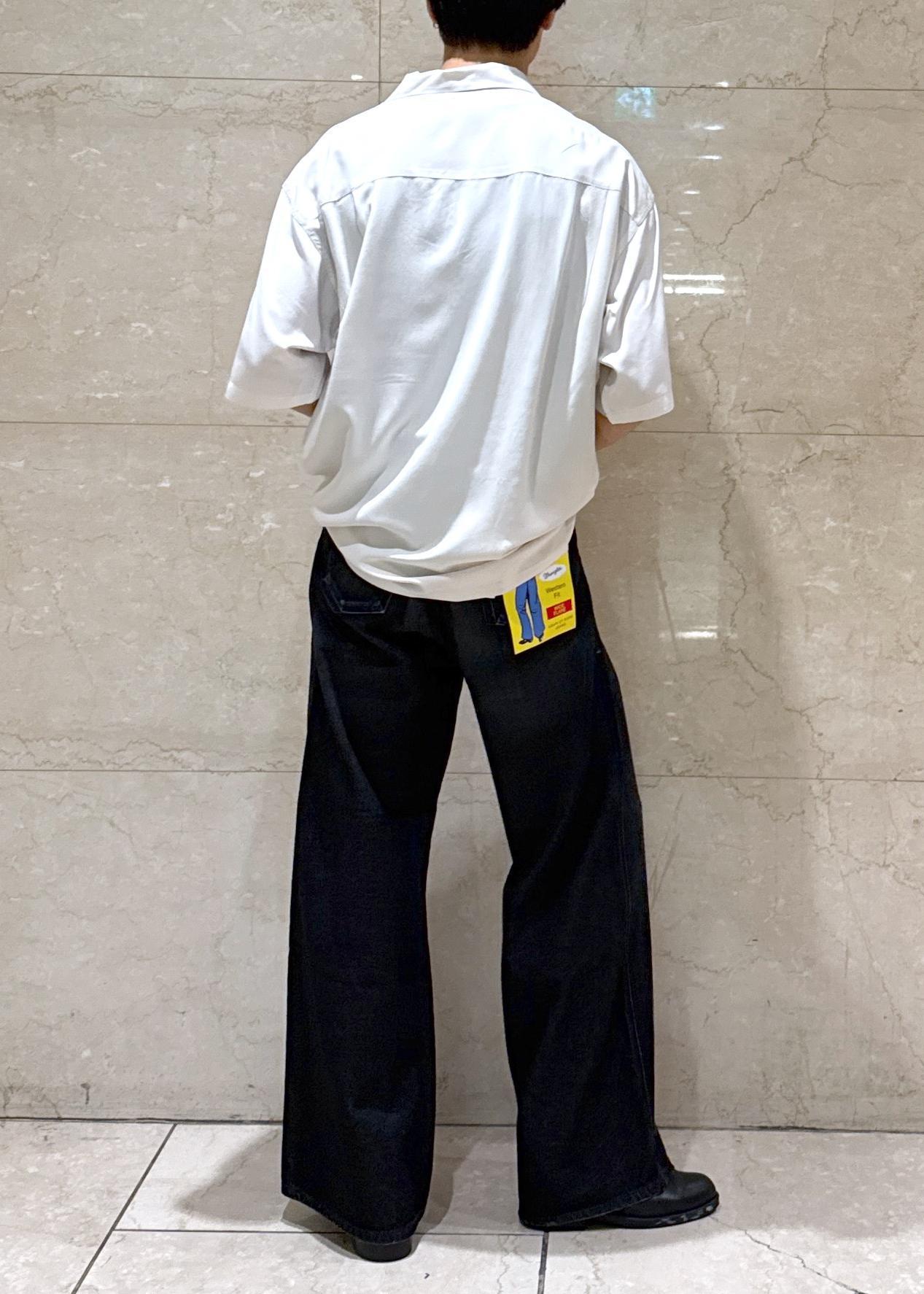 大人気別注ラングラーのデニムに、カジュアルになりすぎないように、トップスには光沢感のあるアロハシャツを合わせました。