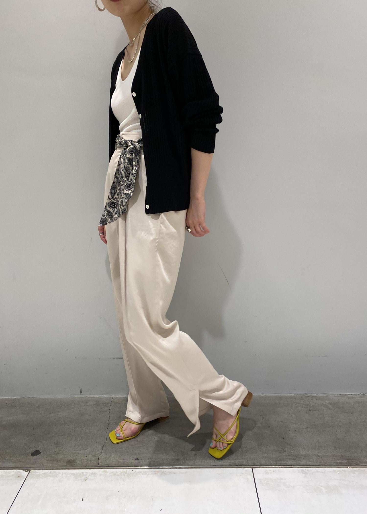 ホワイトワントーンのスタイリングにポイントでブラックカーディガンを。大人っぽいリラックススタイリングにしました。