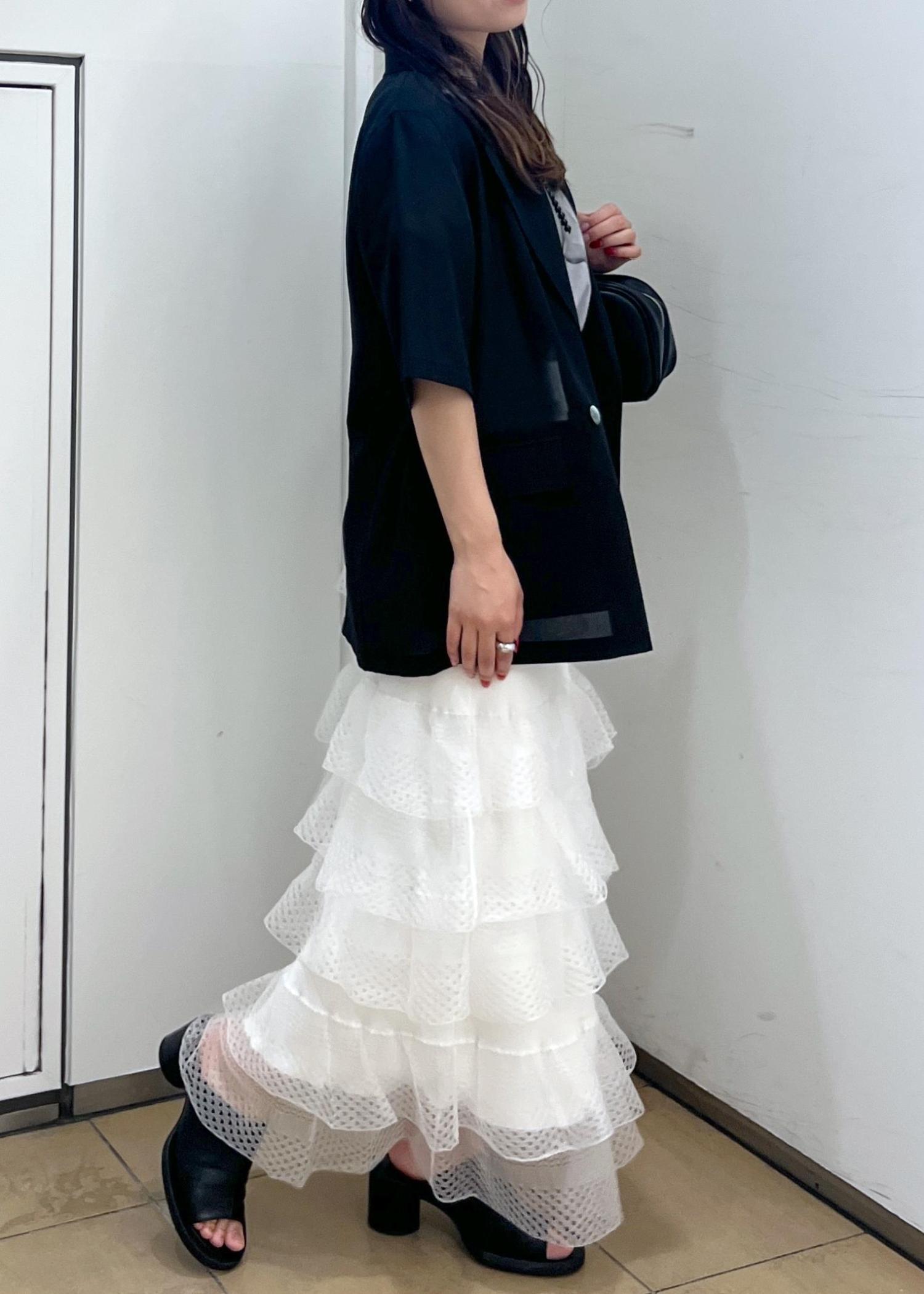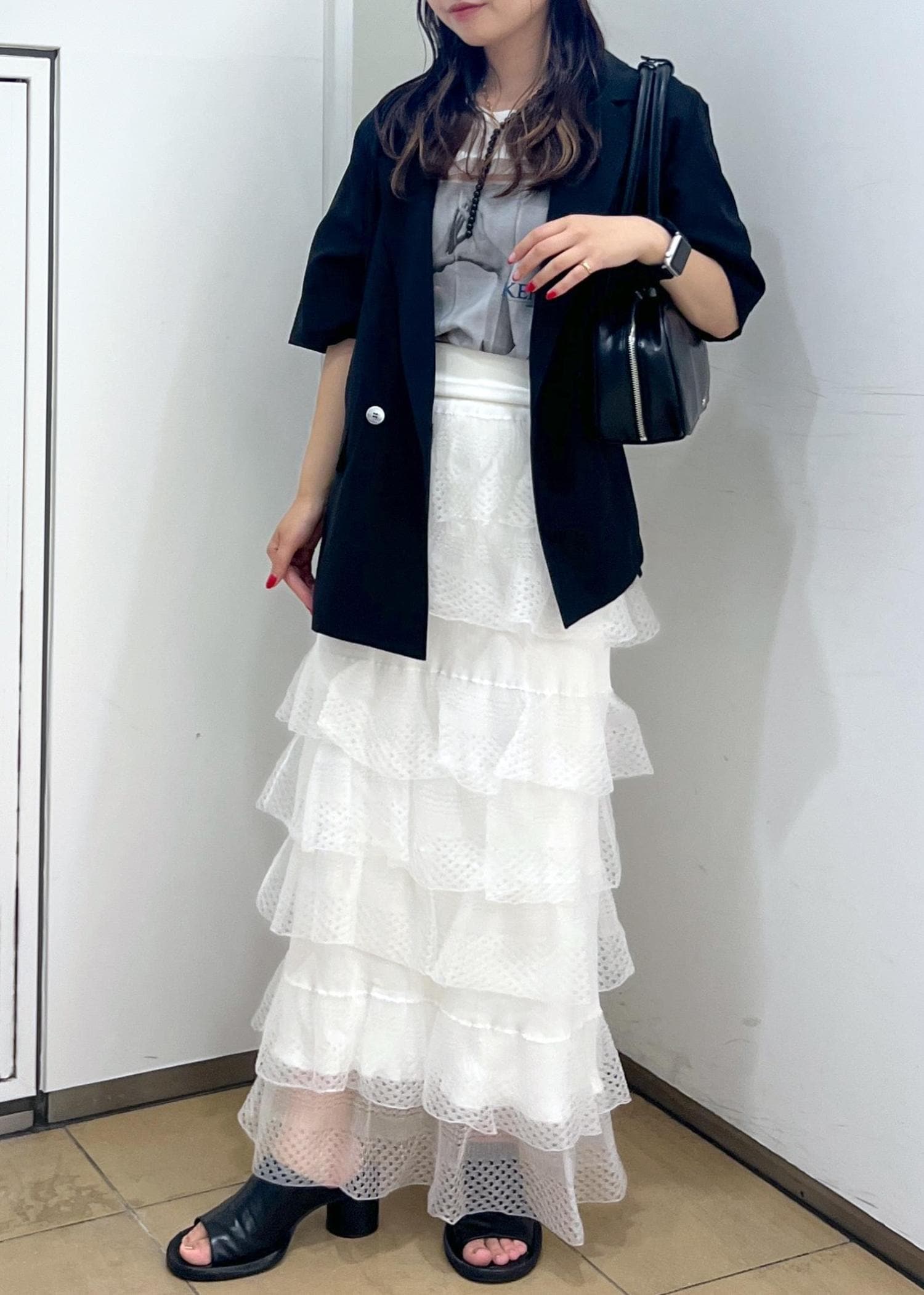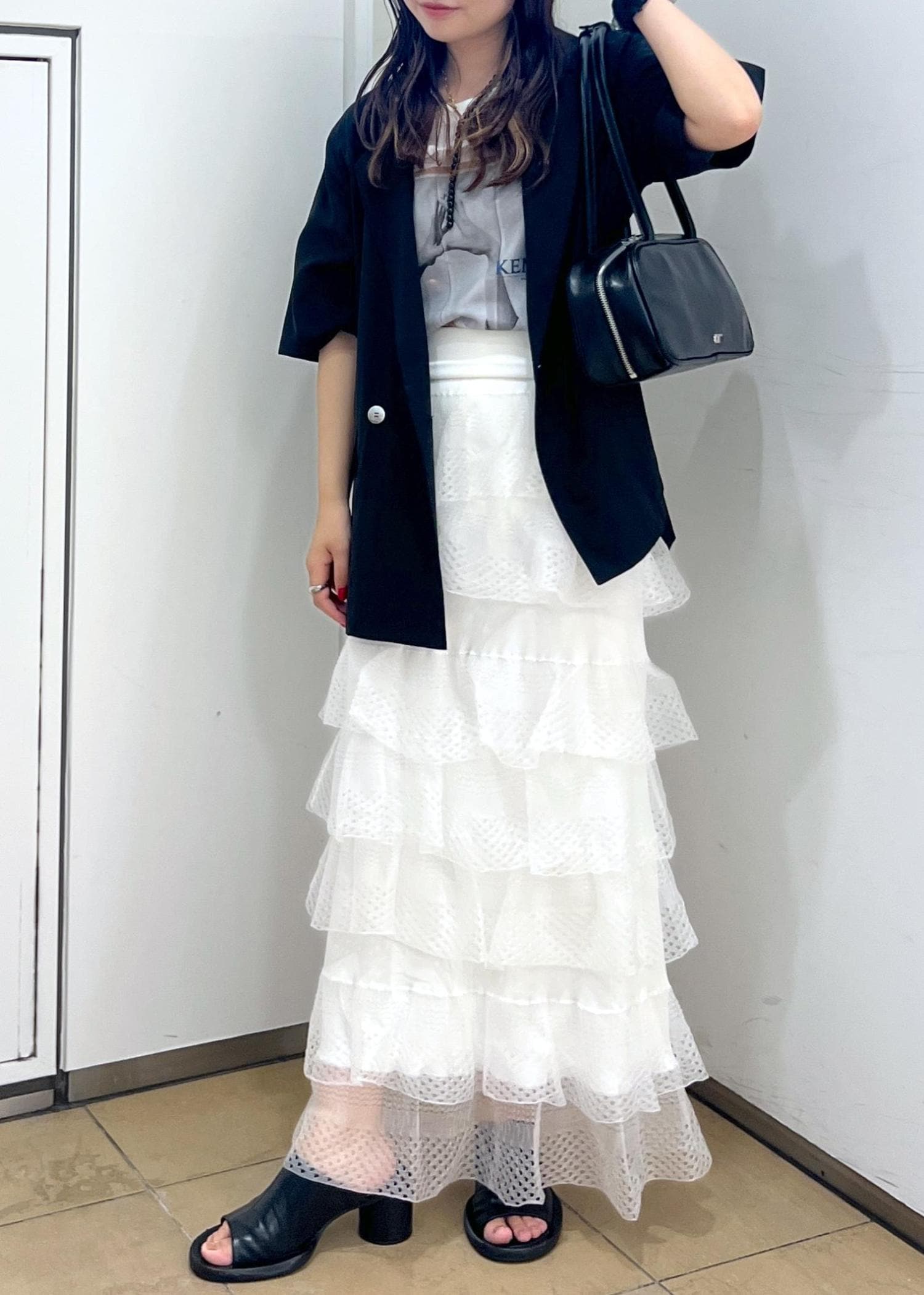 ADAM ET ROPÉ FEMMEシアーフリルスカートホワイト / F¥19,800レビュー下に向かうフリルのデザインと、少しハイウエストな腰位置なので脚の長さ盛れます◎