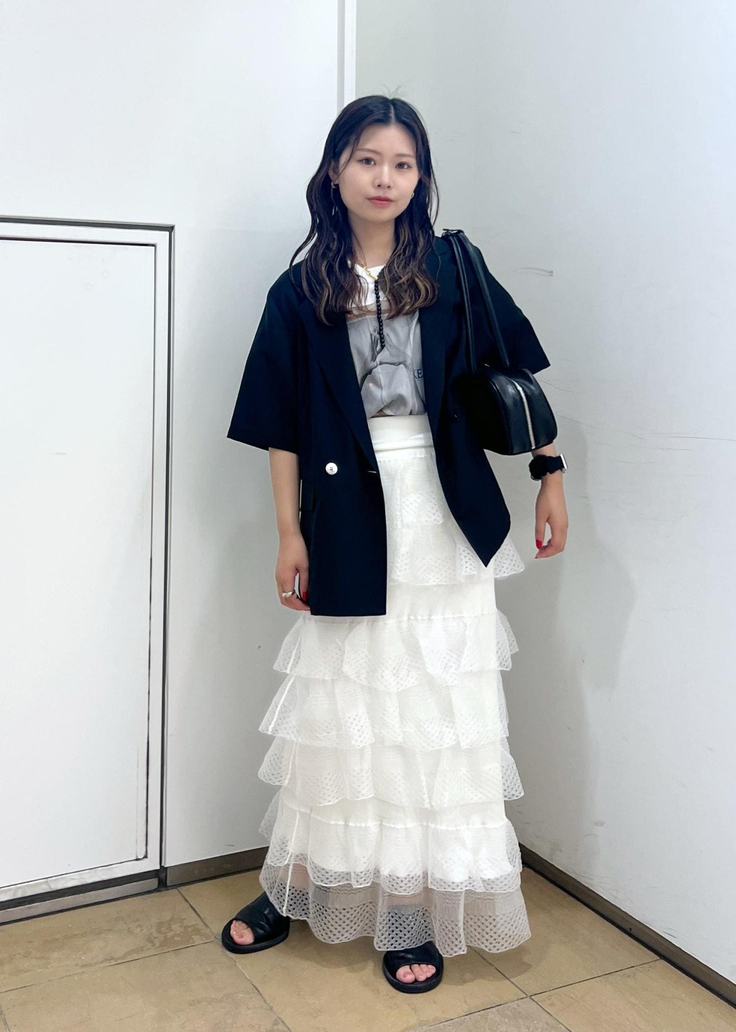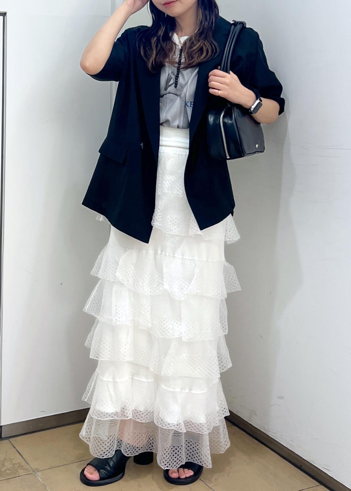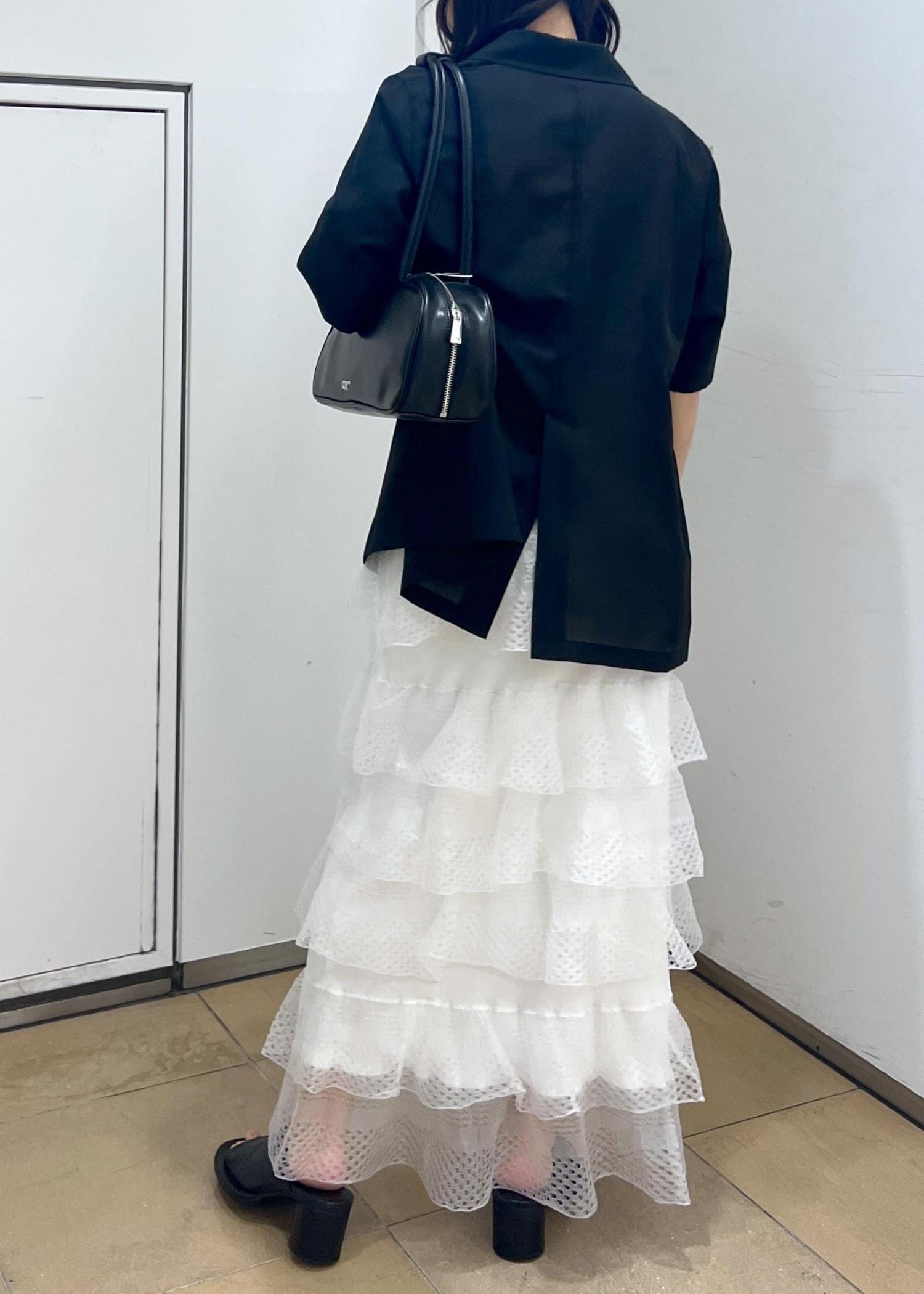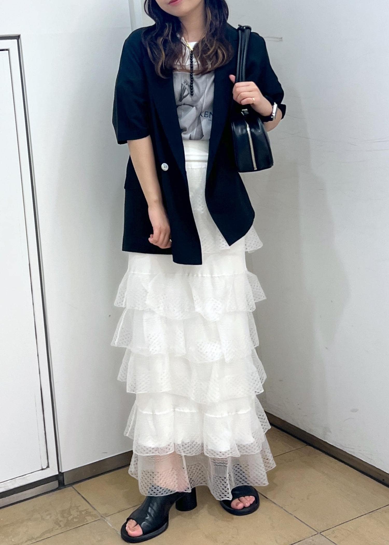ADAM ET ROPÉ FEMMEシアーフリルスカートホワイト / F¥19,800レビュー下に向かうフリルのデザインと、少しハイウエストな腰位置なので脚の長さ盛れます◎