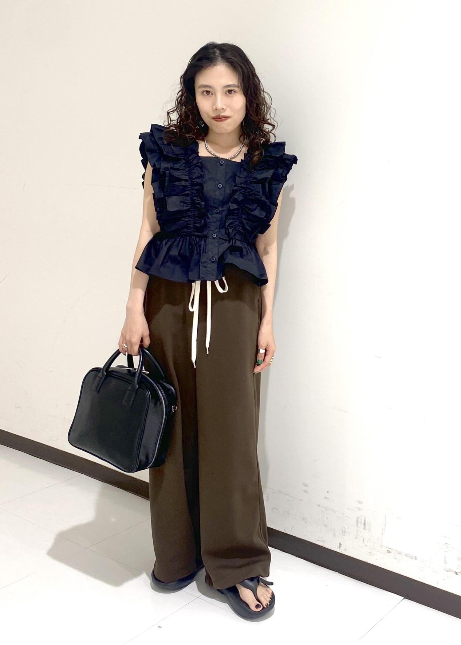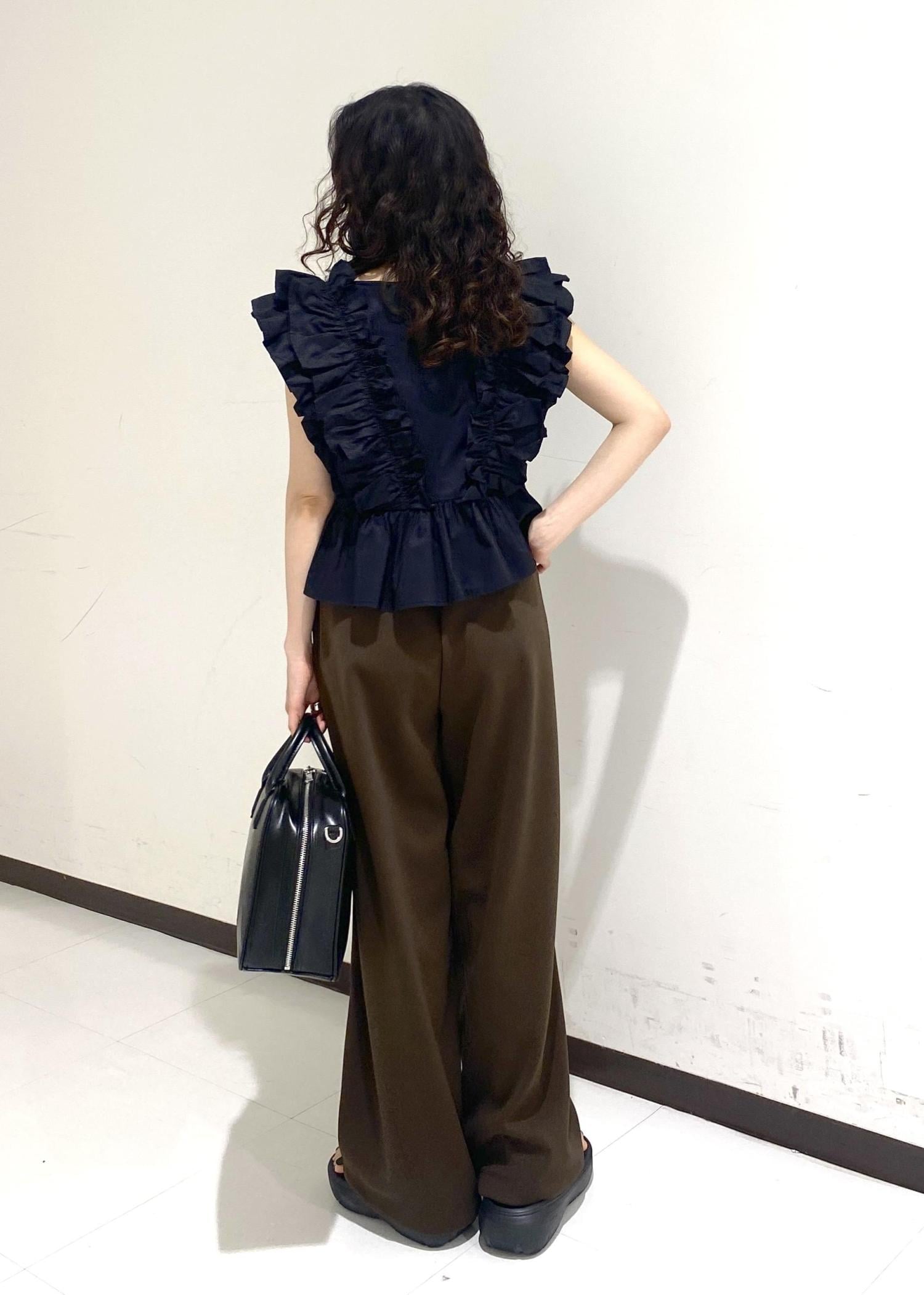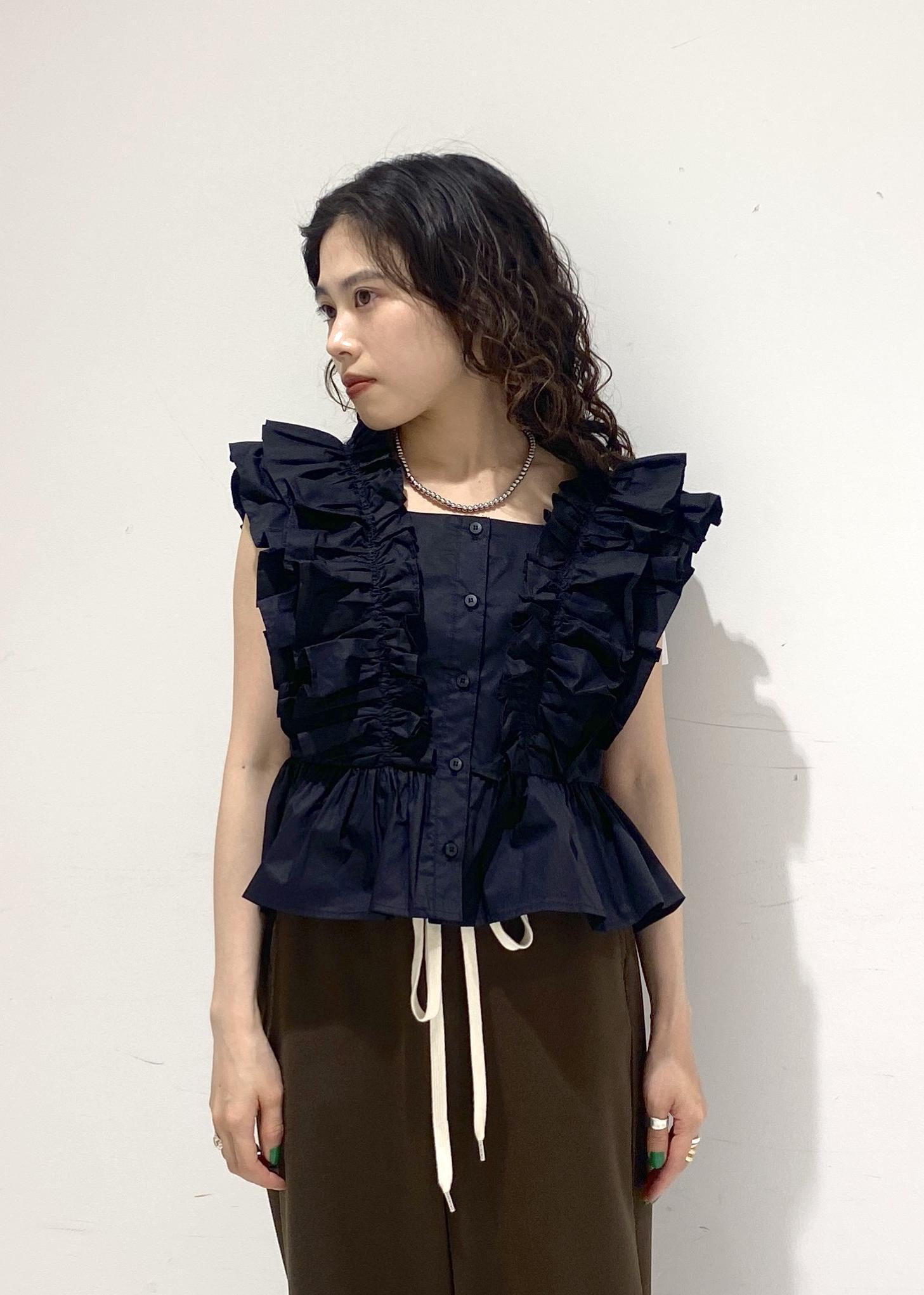 フリルのボリュームが目立つデザインですが、首元が開いておりスッキリ着用出来ます。 -