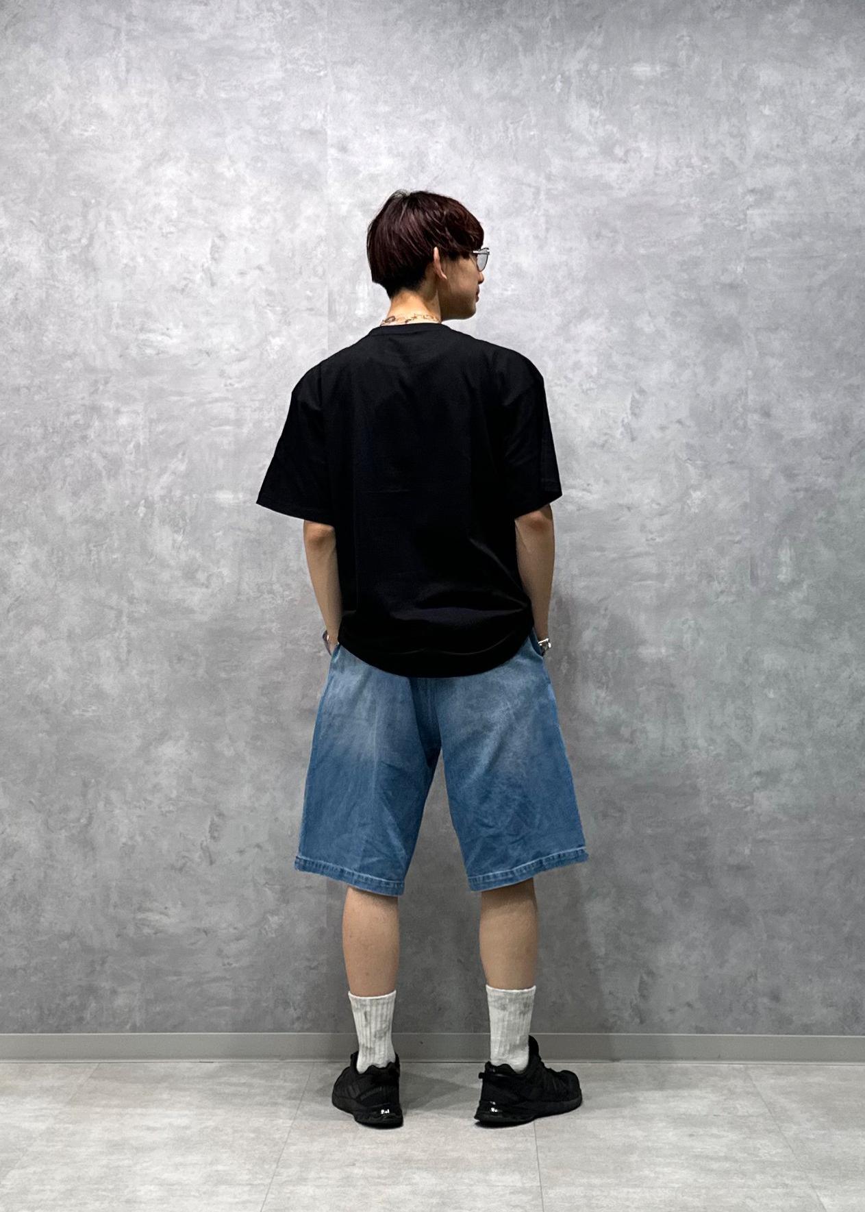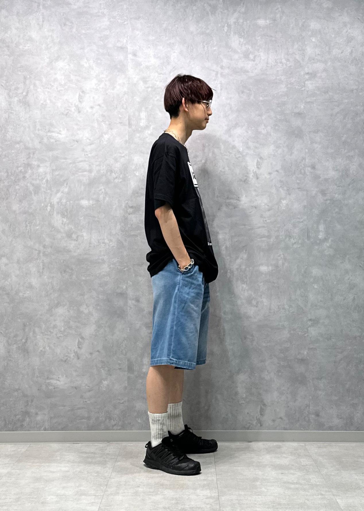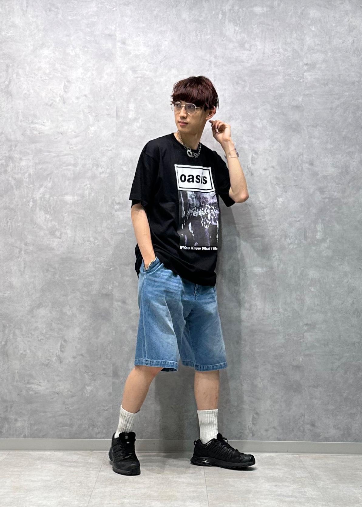 爽やかなブルーのデニムショーツが映える夏コーデです。靴とTシャツを黒にしてシックに、デニムの色が映えるようにしました。oasisのジャケ写のデザインも目立ち、ラフでカッコよくまとめました。