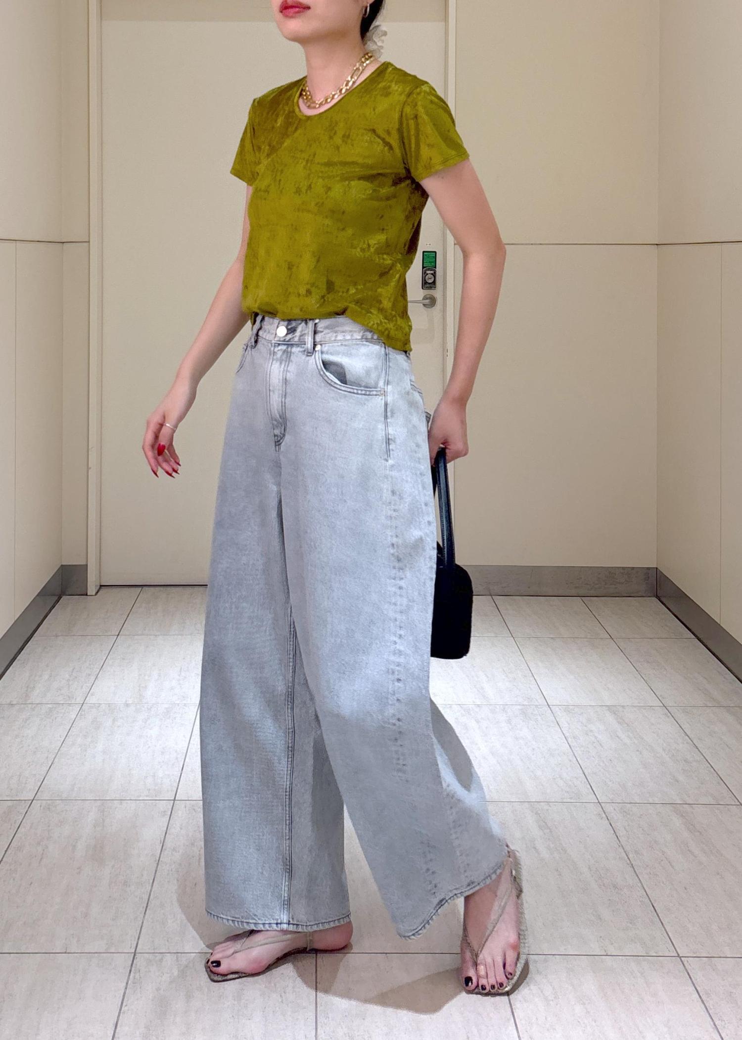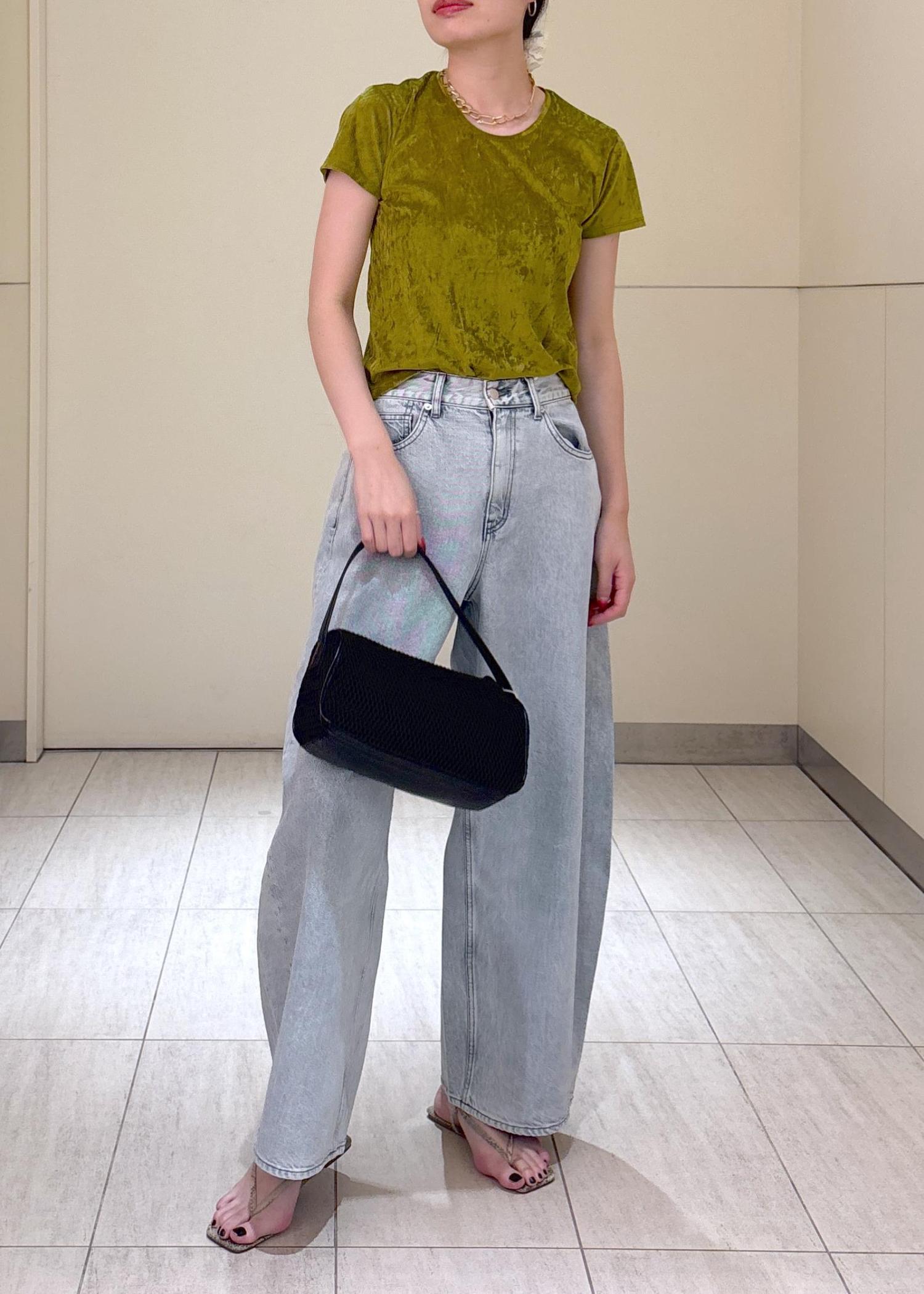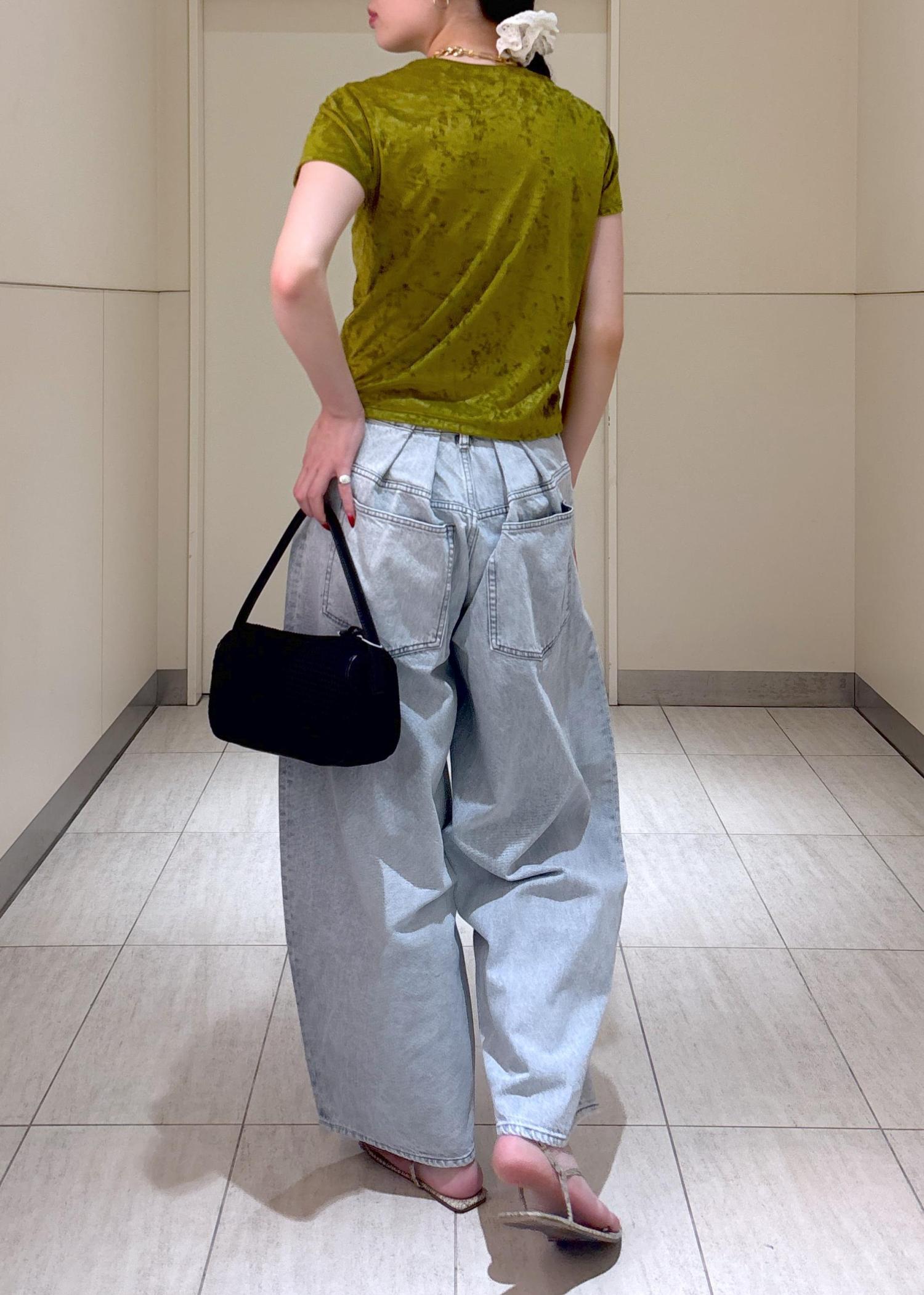 前回も着用したバックタックデニムを、ベロアTシャツと着回しスタイリングで着てみました!