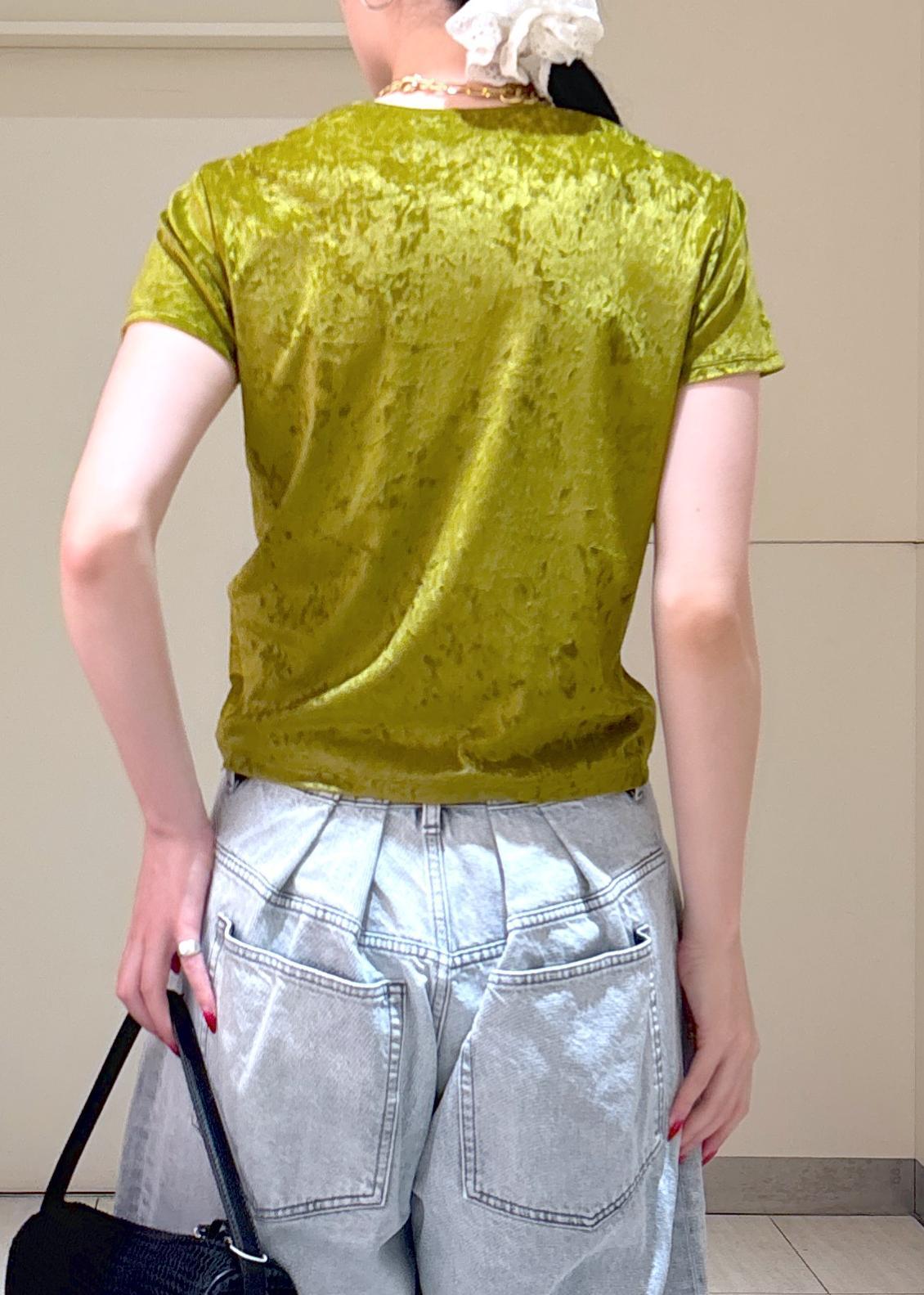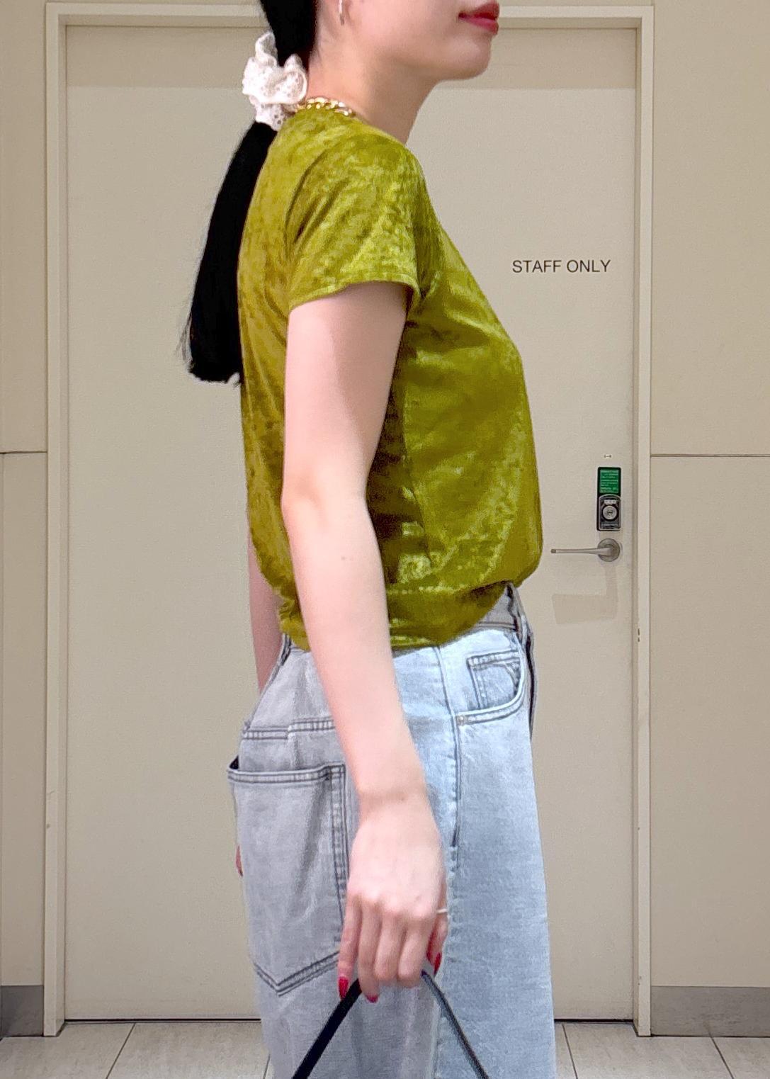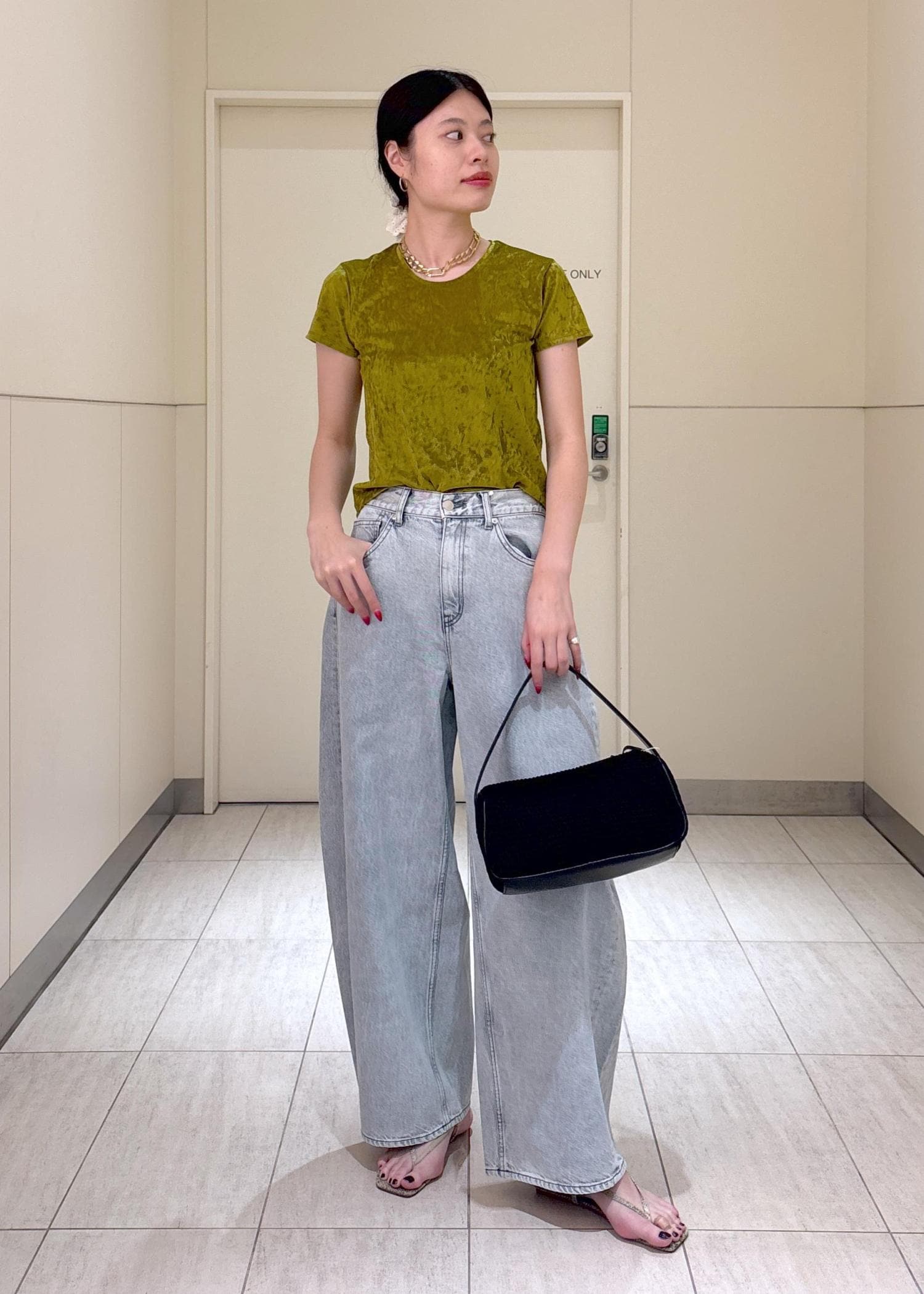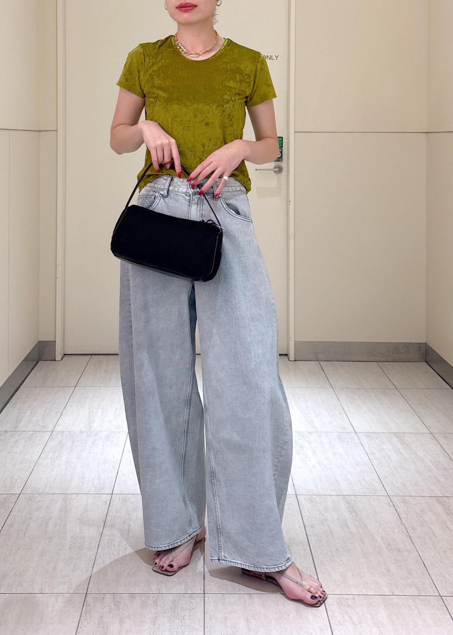前回も着用したバックタックデニムを、ベロアTシャツと着回しスタイリングで着てみました!