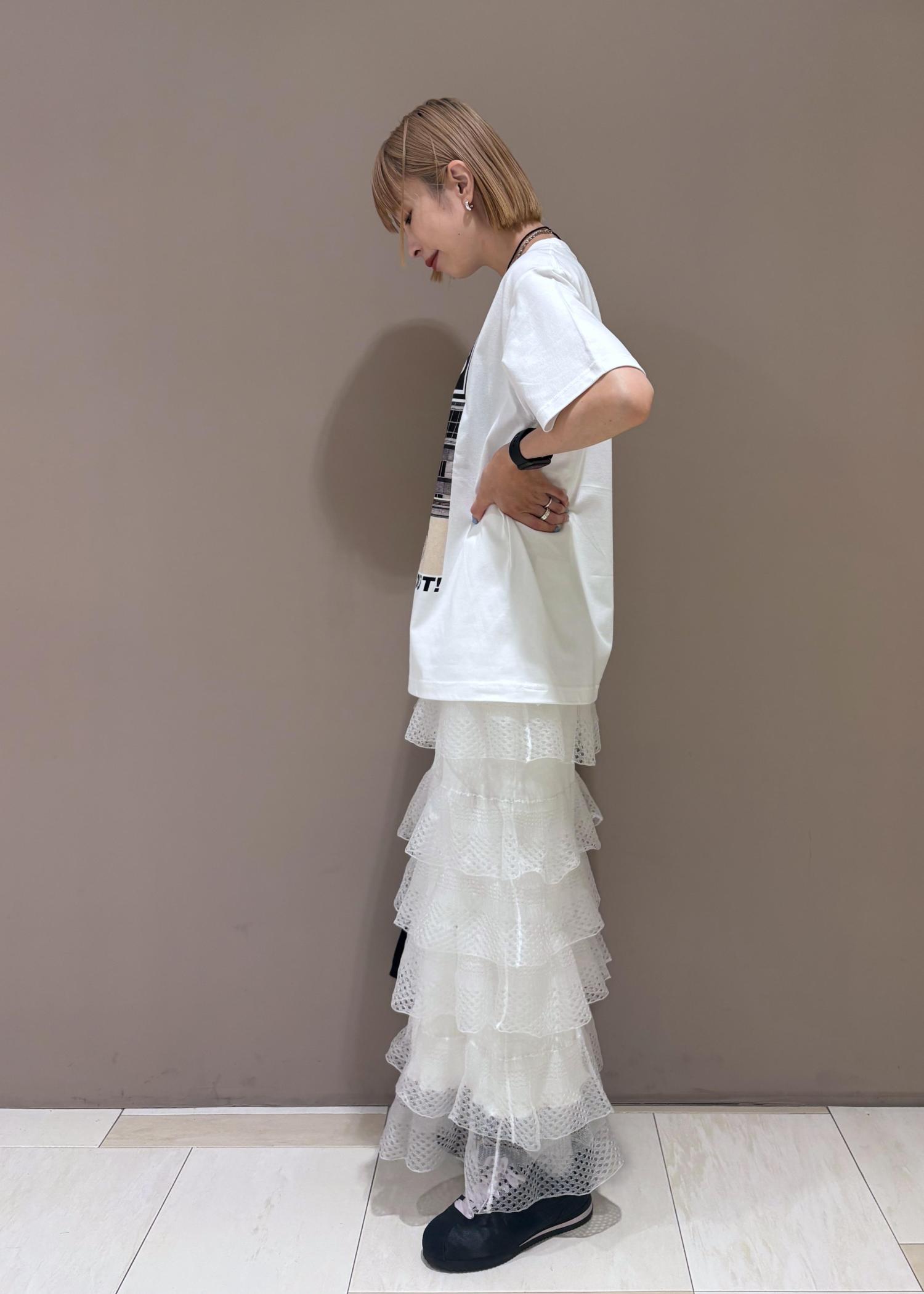 ADAM ET ROPÉ FEMMEシアーフリルスカートホワイト / F¥19,800レビュー162cm、フリーサイズ着用。