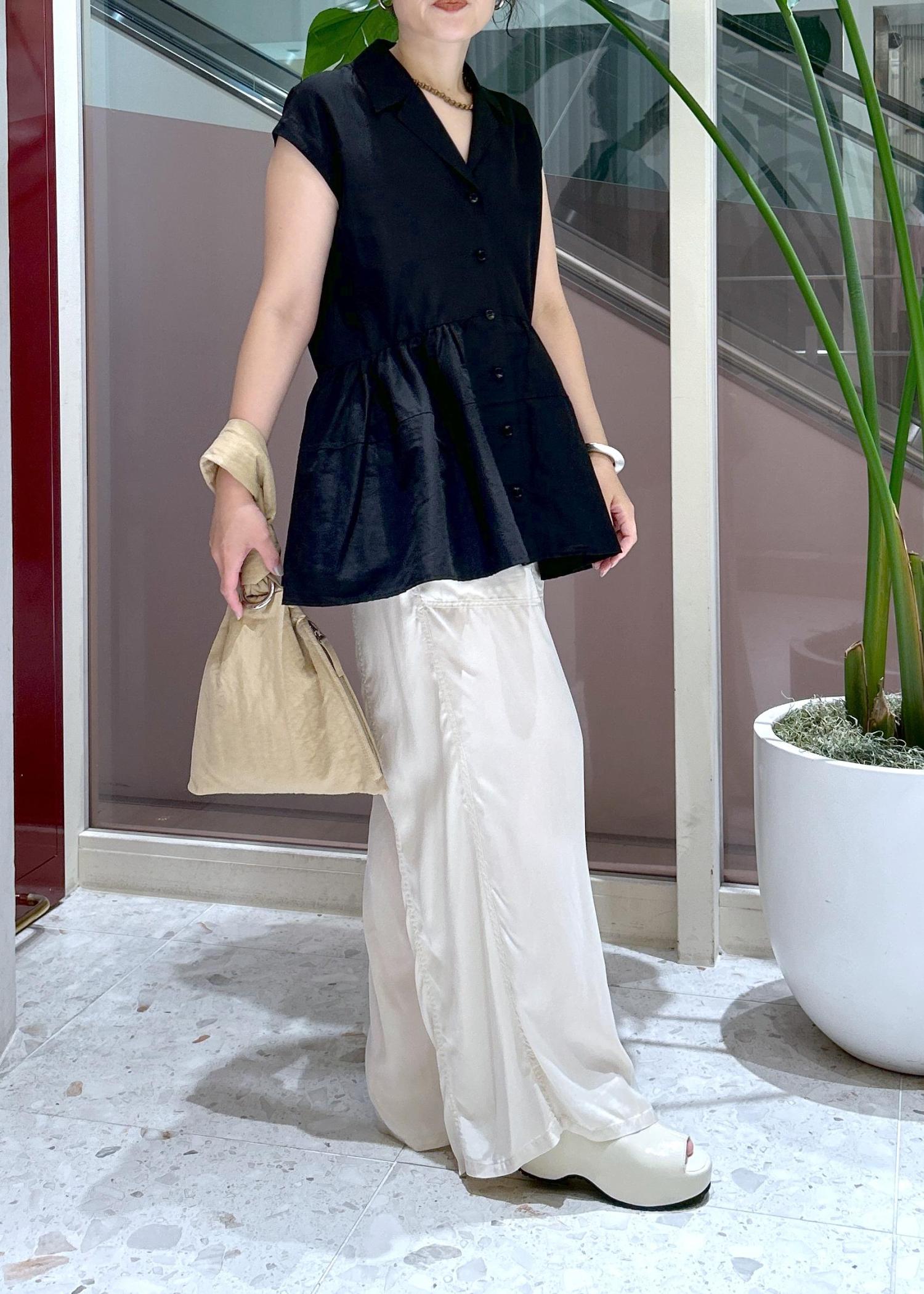 ややゆとりのあるサイズ感で、生地には張りがあります。肌離れもするので、体のラインを拾わずお腹周りもカバーできます。ノースリーブが苦手な方も、ドロップショルダーなので挑戦しやすいと思います♪