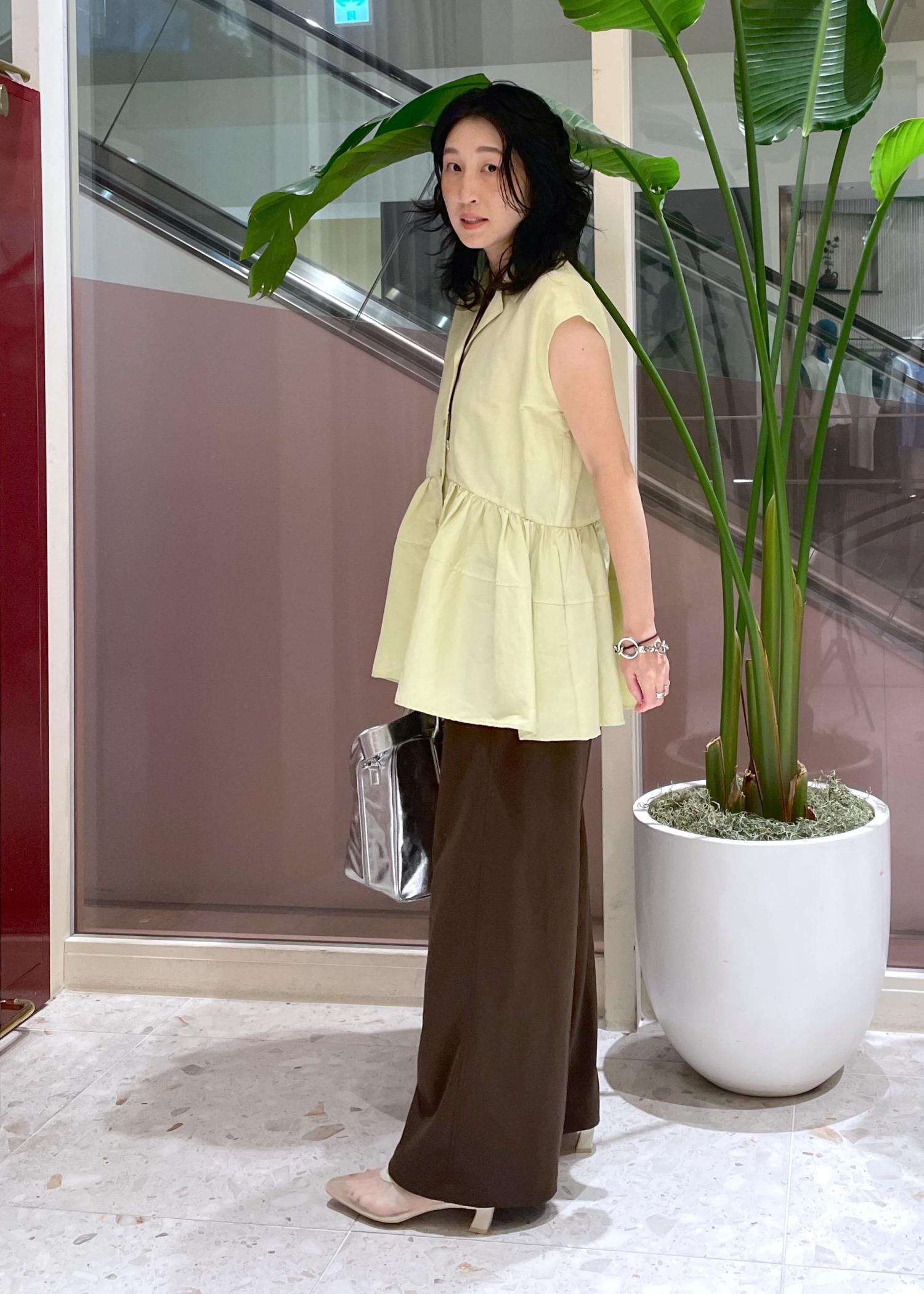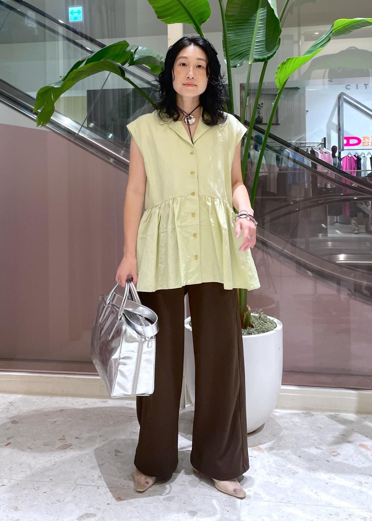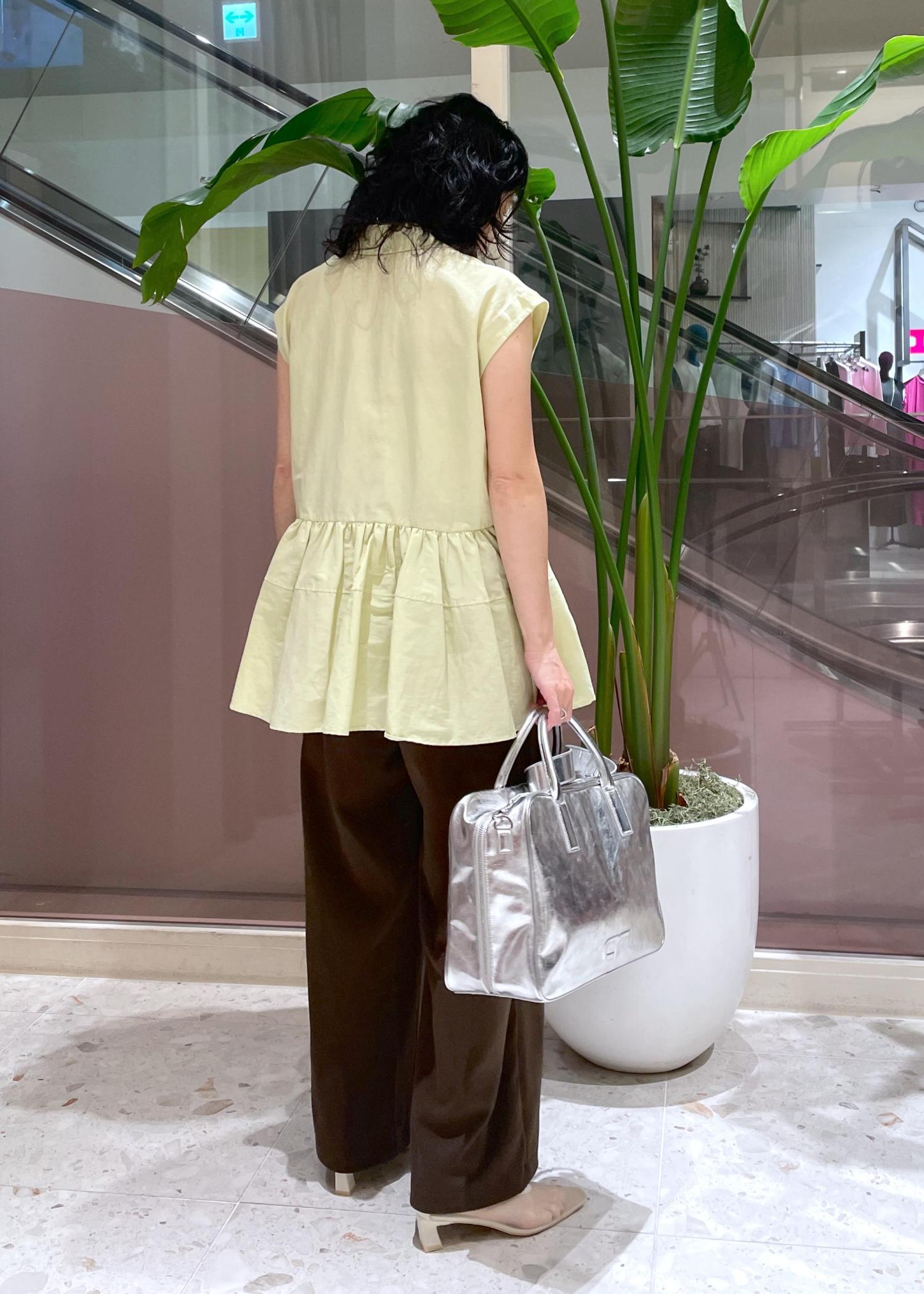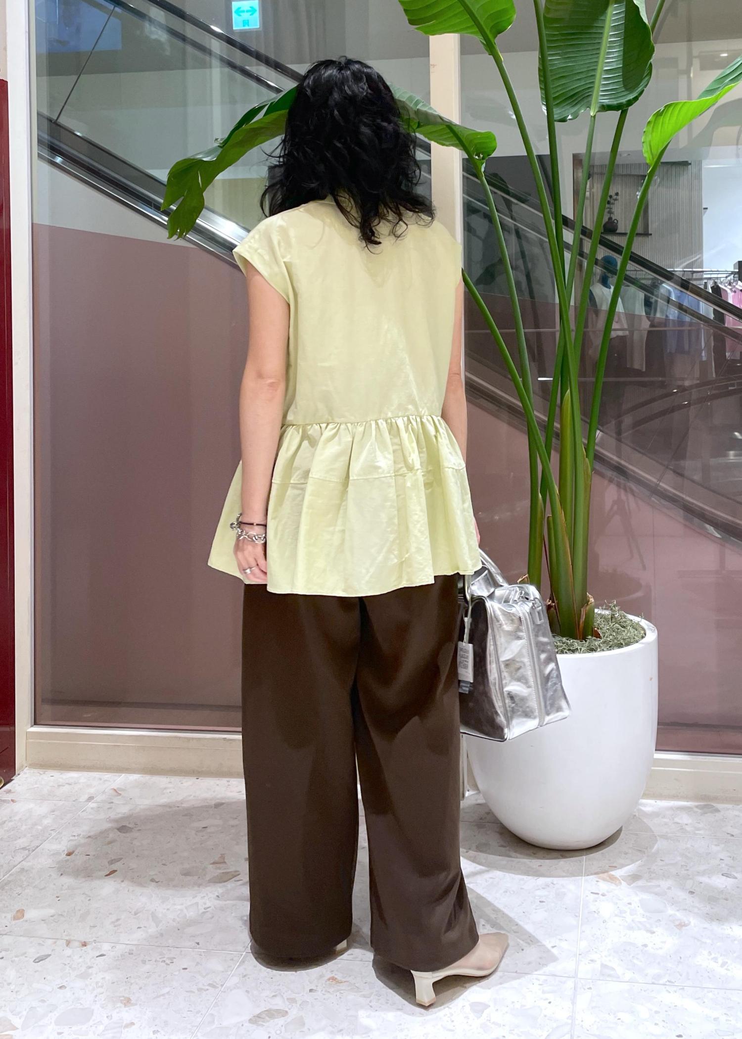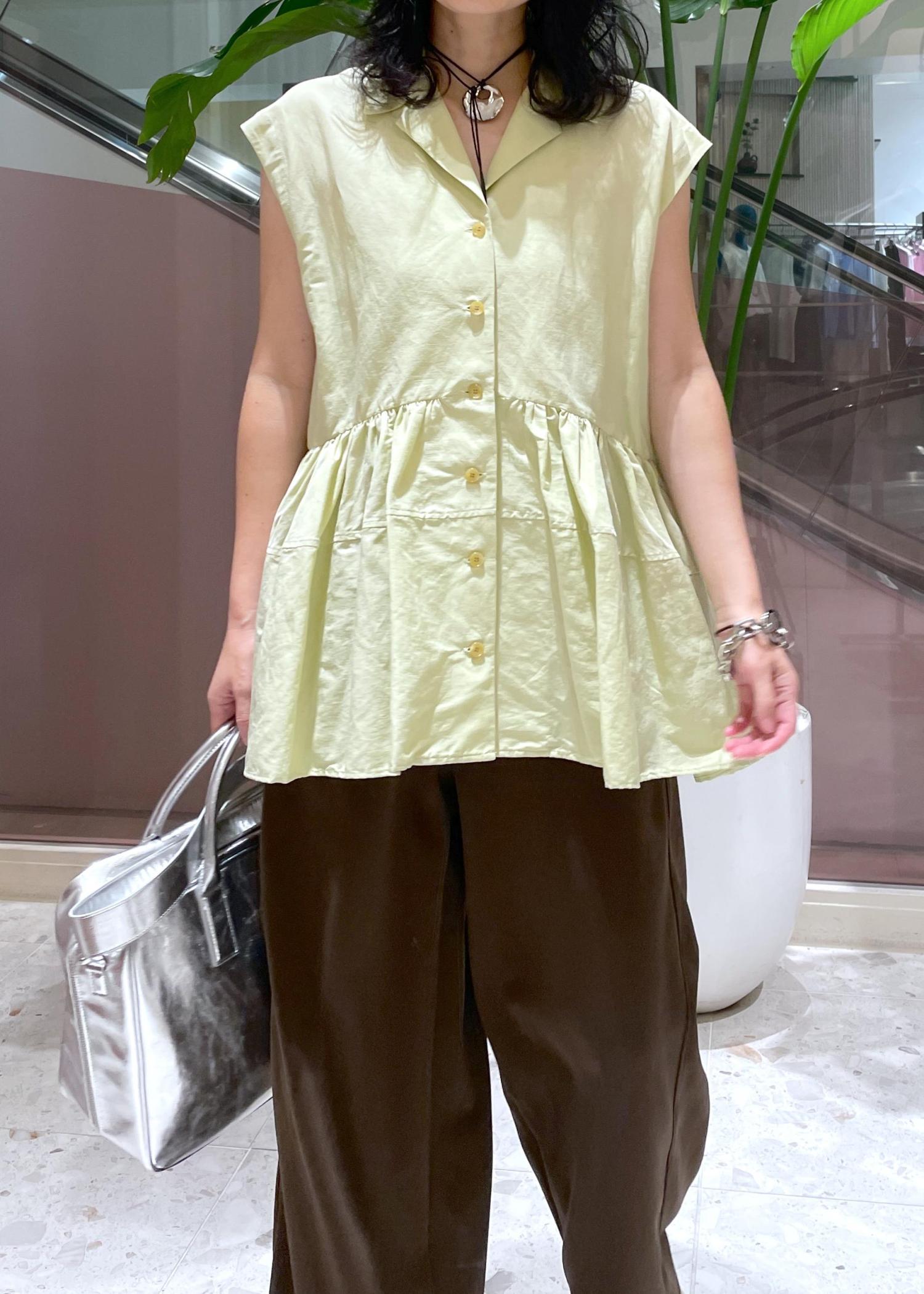 アウトレットADAM ET ROPÉ FEMME【サステナブル】オープンカラーペプラムシャツライトグリーン / F¥6,380レビューハリのある素材感で、ペプラムシルエットが綺麗に出ます。お尻にかかる着丈で腰回りのカバーも。