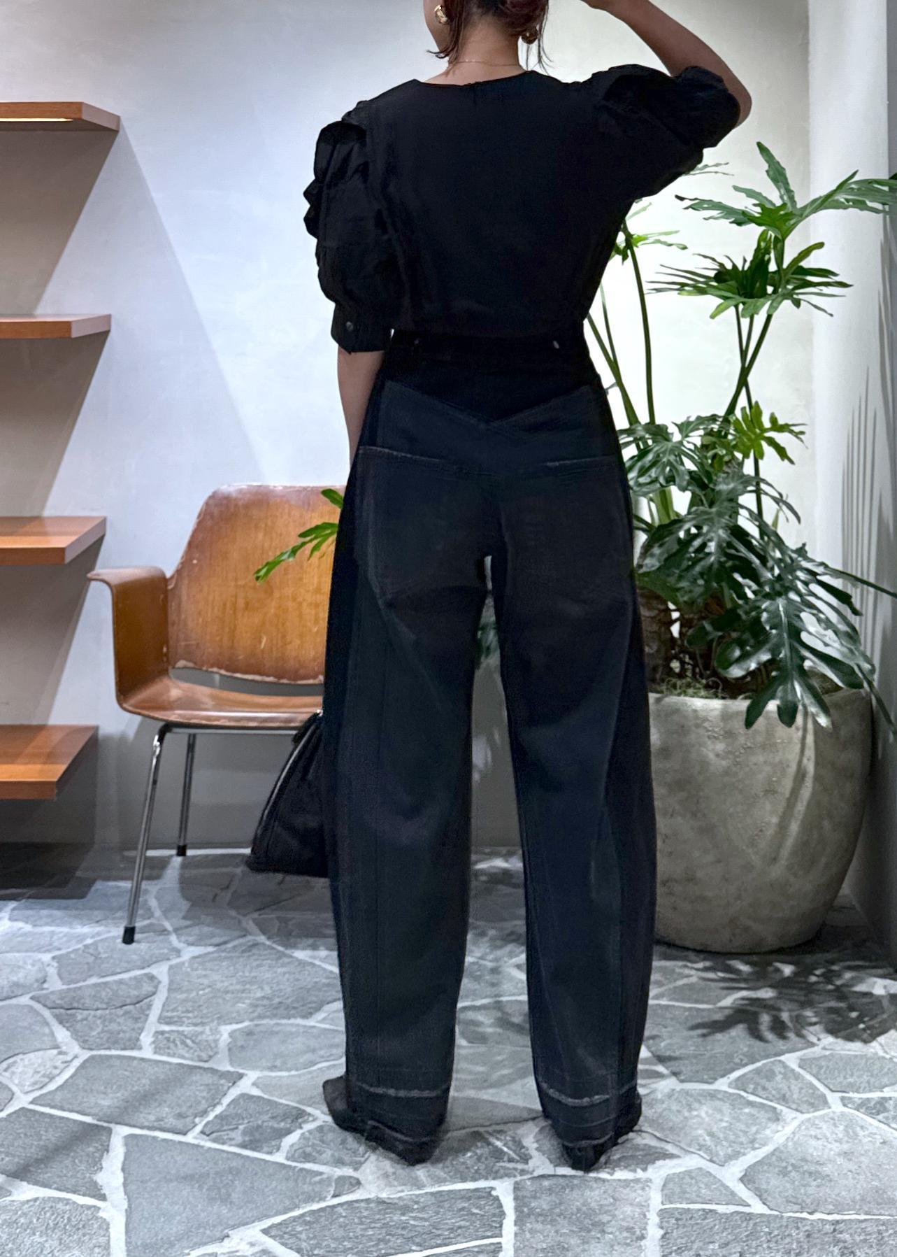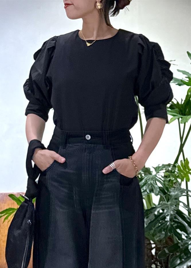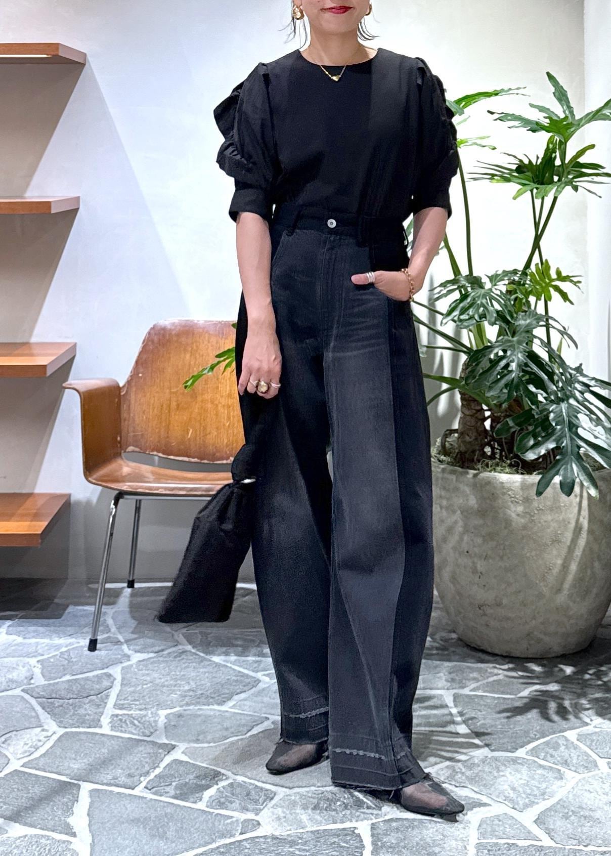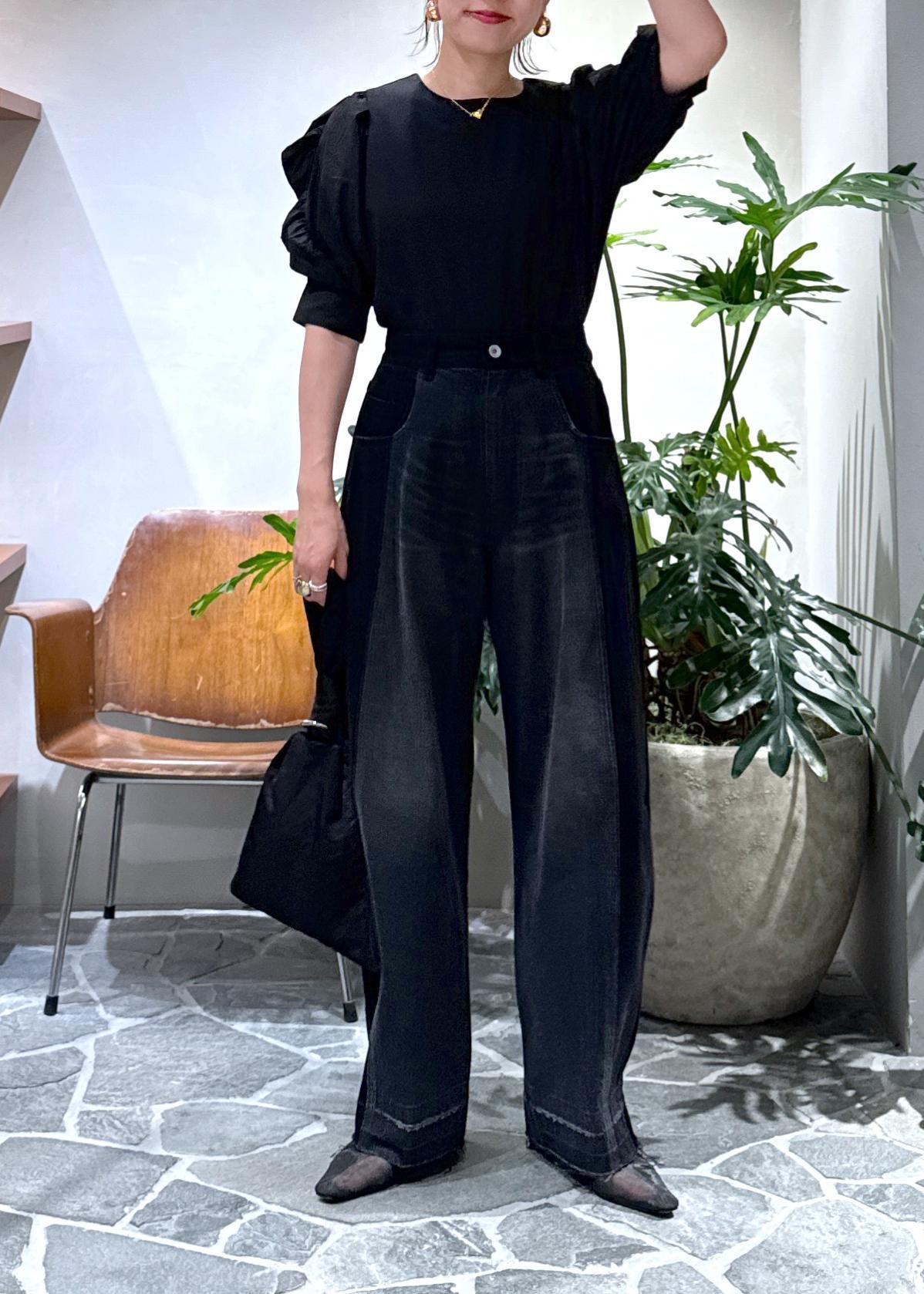 ブラックだからこそ挑戦しやすいフリルのついたお袖のトップスにブラックデニムを合わせて、ワントーンコーデに仕上げました!