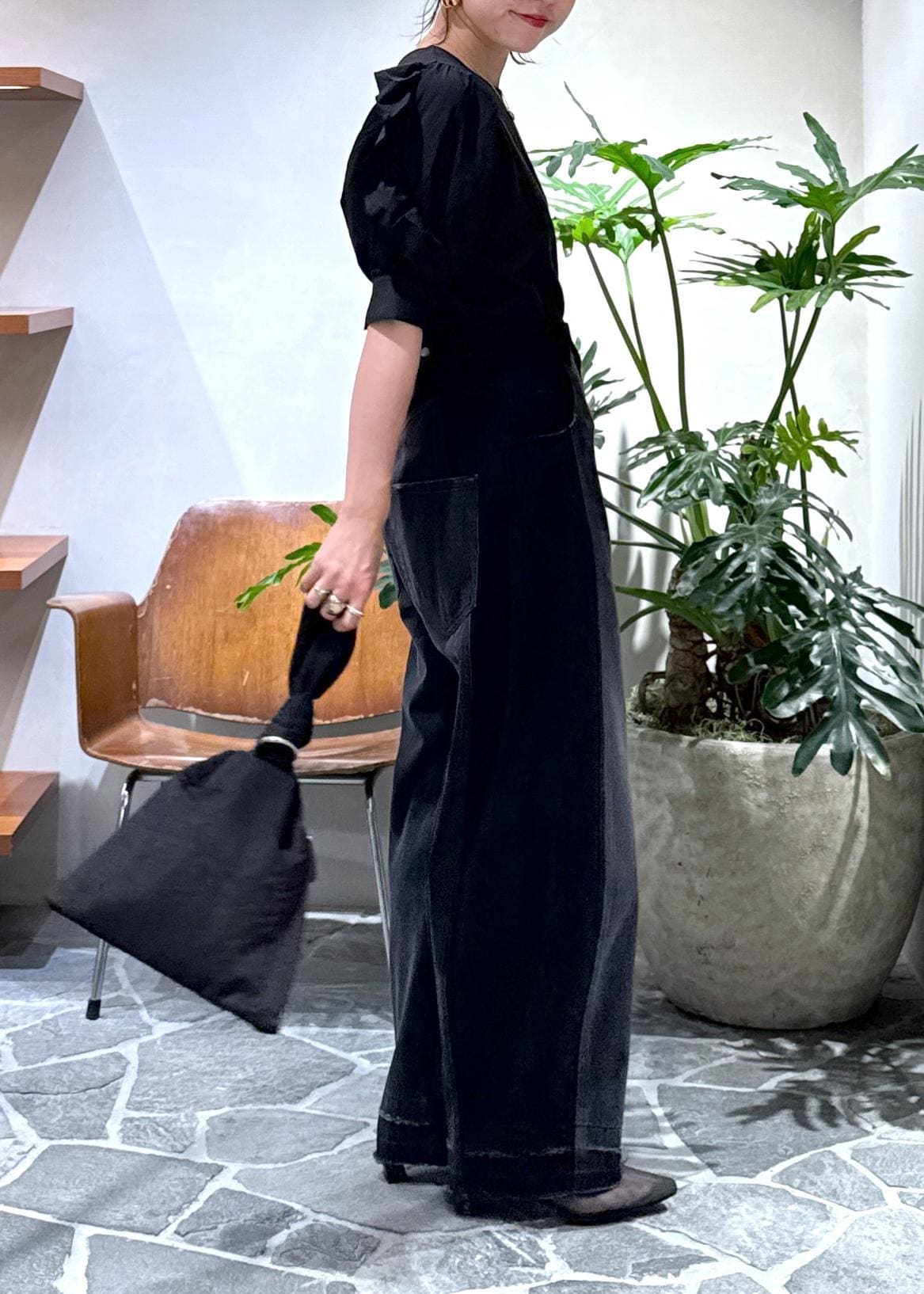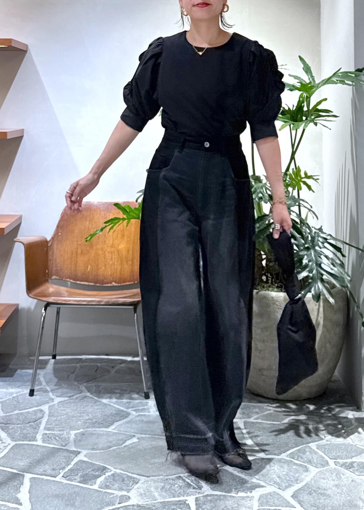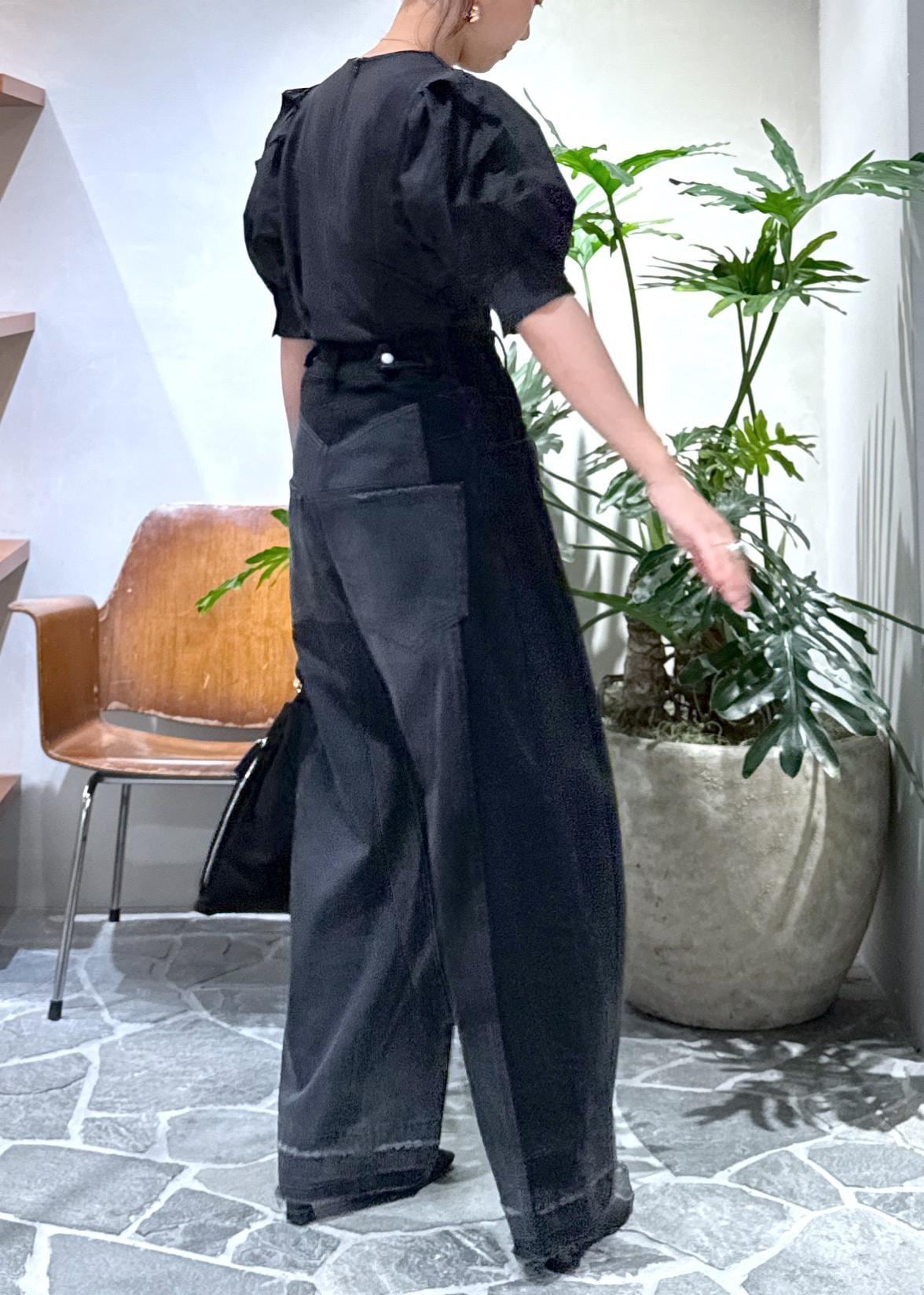 ブラックだからこそ挑戦しやすいフリルのついたお袖のトップスにブラックデニムを合わせて、ワントーンコーデに仕上げました!