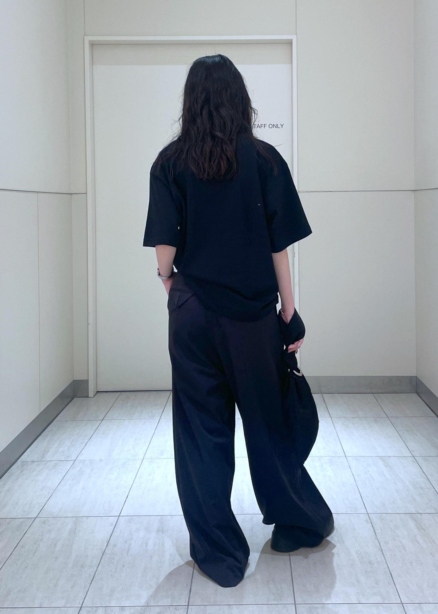 メンズライクに仕上げたかったので、トップスはLサイズを着用しています(^^)全体的にゆったりとしたサイズ感のものを着用しているのでブラックに統一してみました。