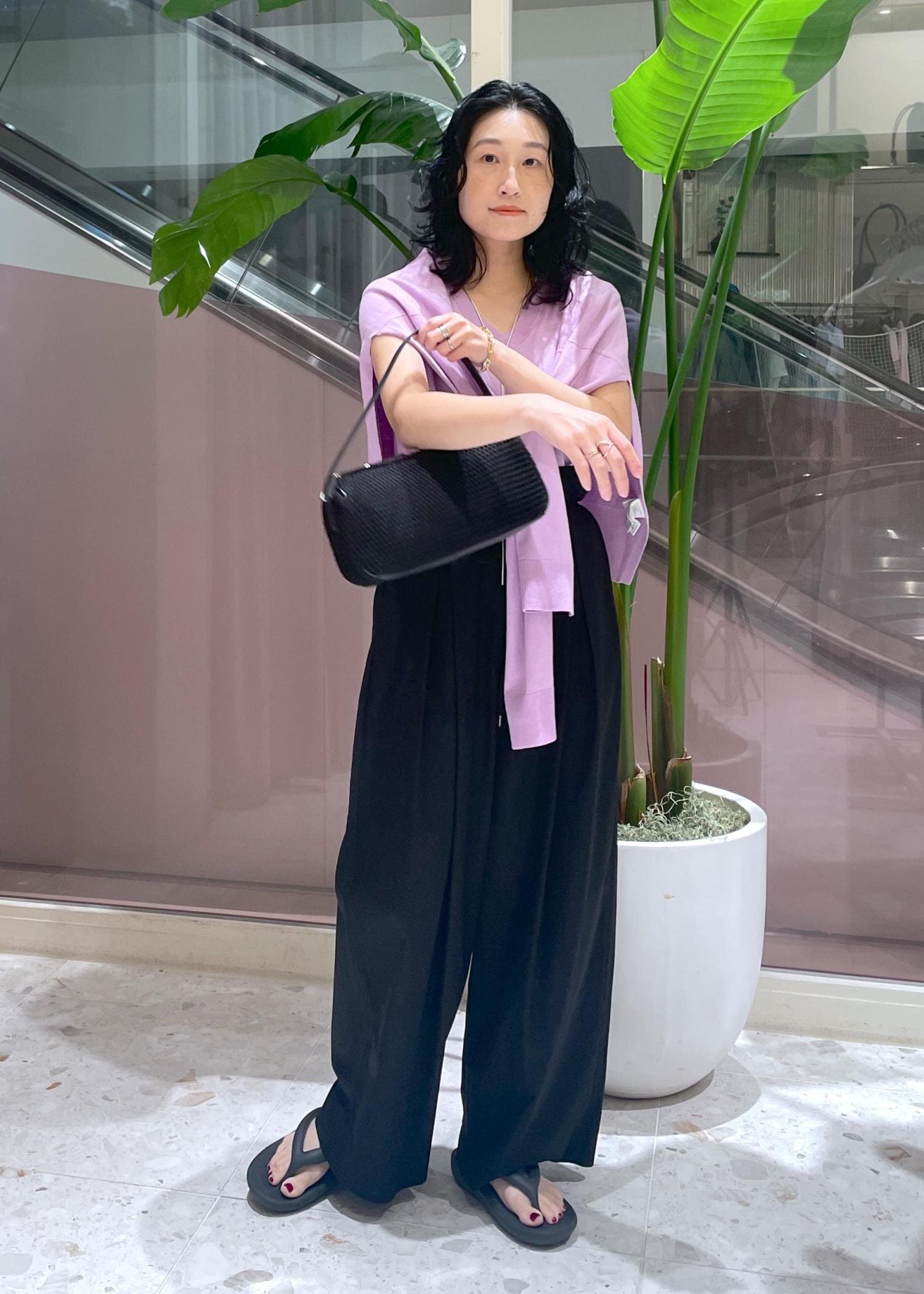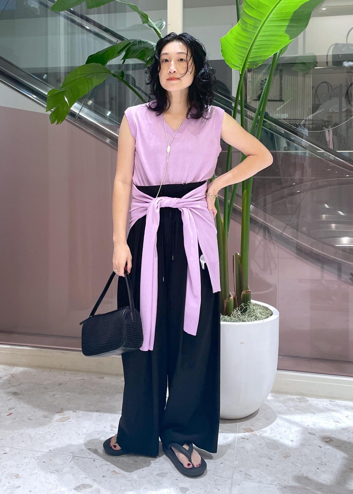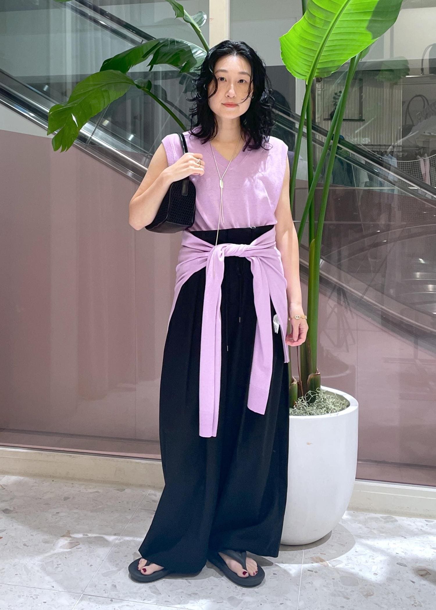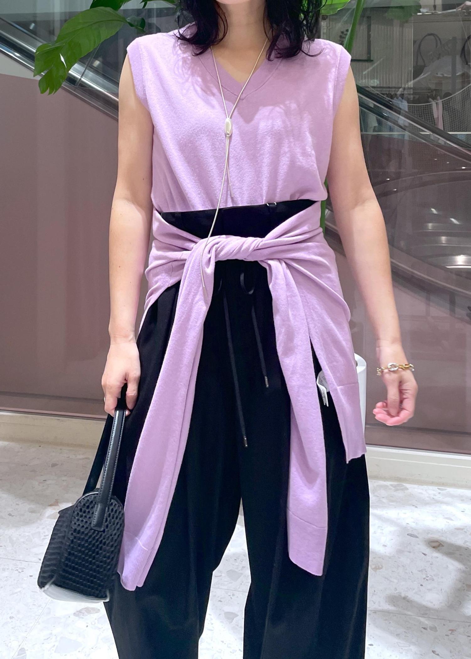 着用したラップストールがセットになったニットは、柔らかい素材感で厚手すぎず、ノースリーブなので早い時期から着用できそうです。