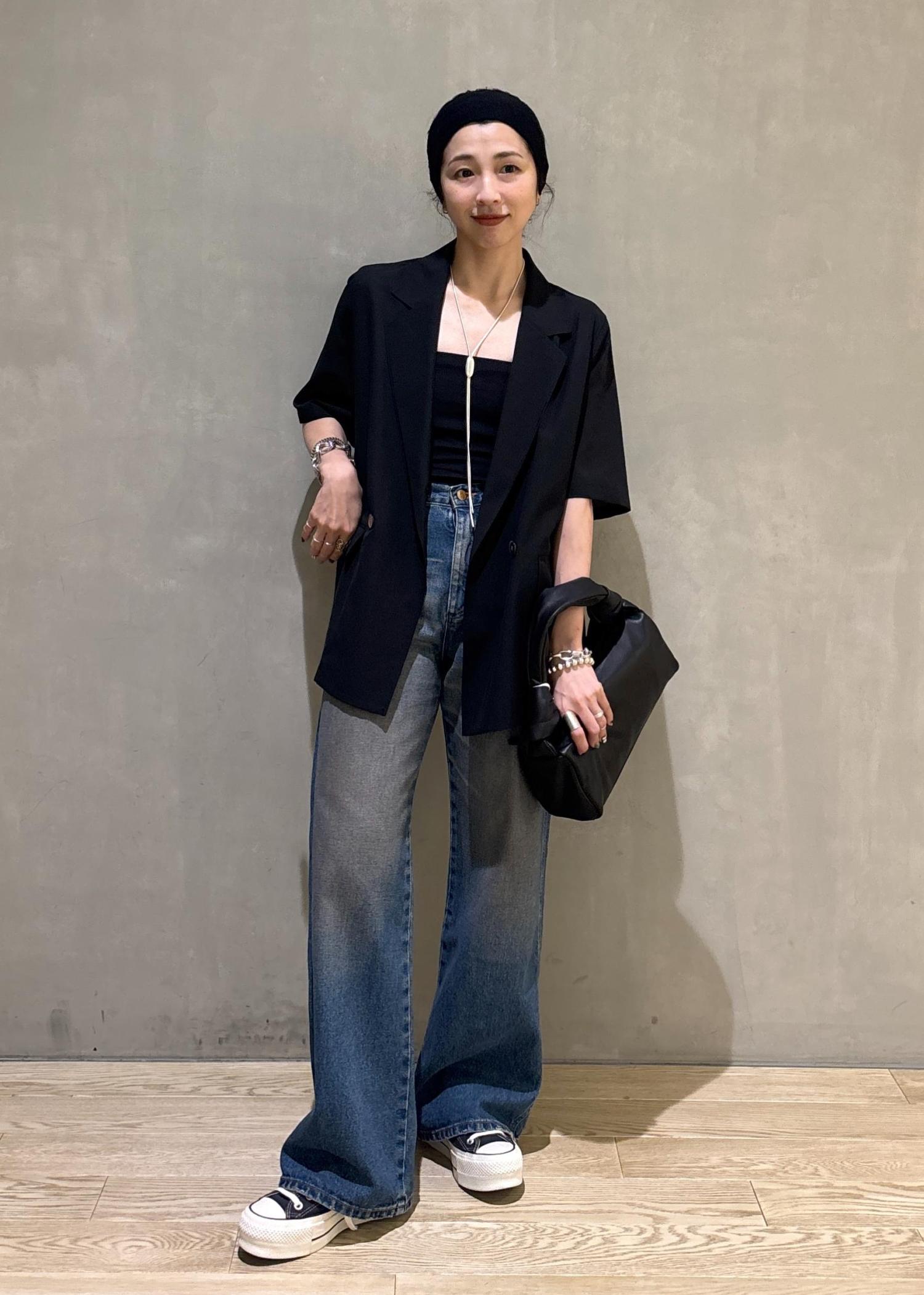 細身のすっきりしたデニムなので、少しだけの長めのシアージャケットで合わせてみました!