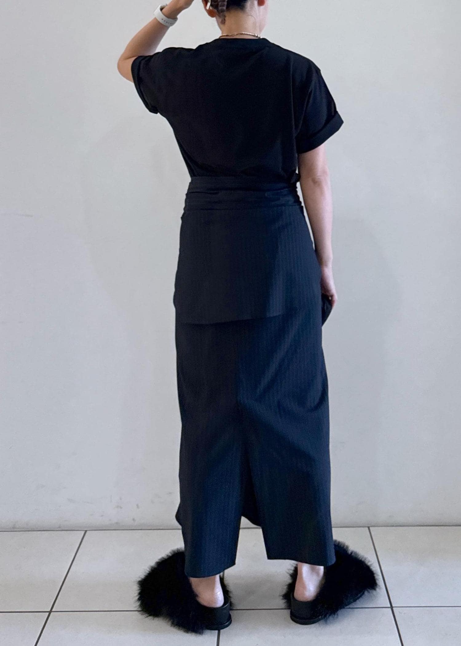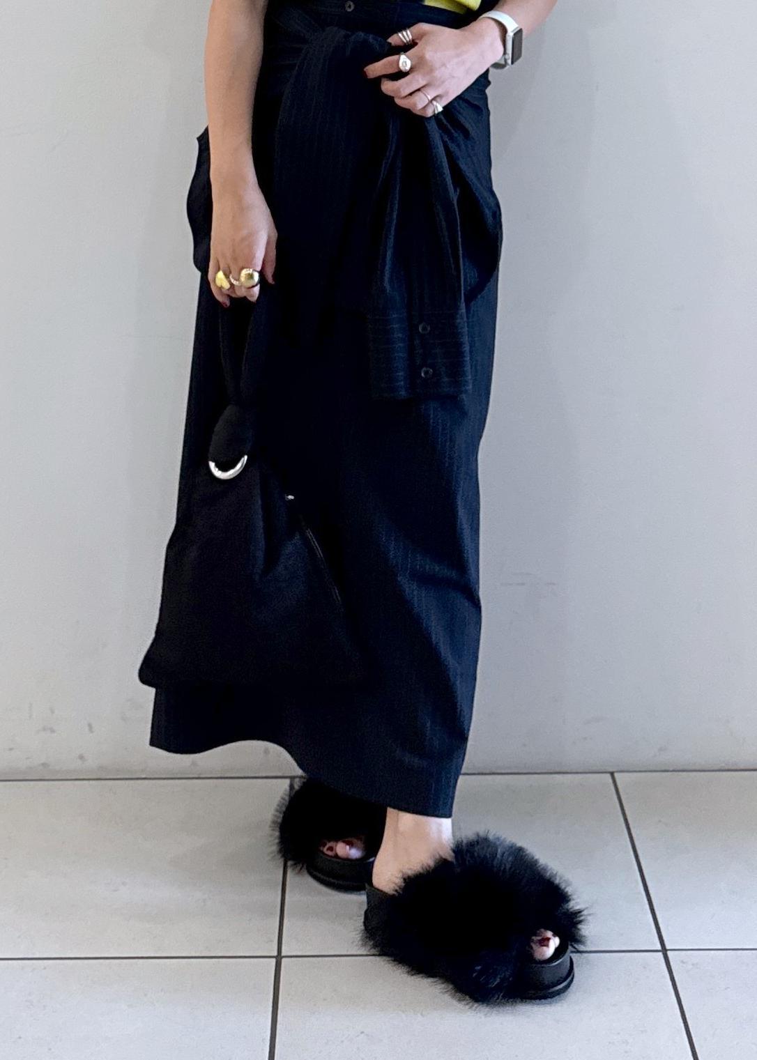 モードなスタイリングにしたかったので、タイトスカートとブラウスのセットアップを使ってスタイリング。シャツを腰巻にしています。