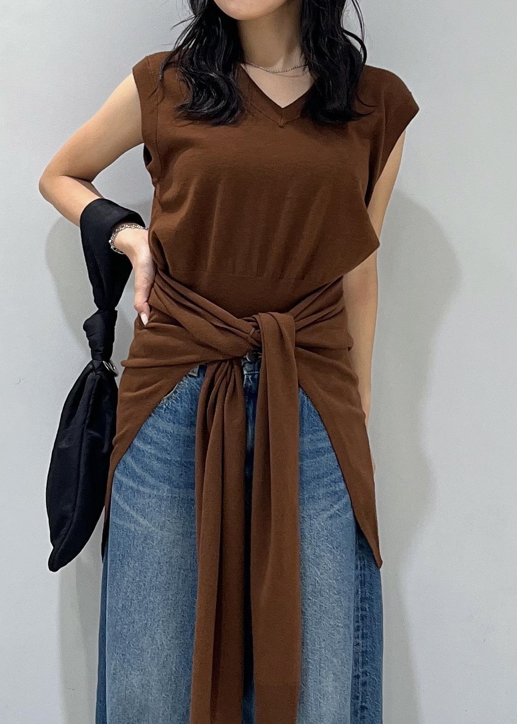 アウトレットADAM ET ROPÉ FEMMEラップストールコンビノースリーブプルオーバーブラウン / F¥12,551レビュー気分によって色んな着回しができるトップスです♩