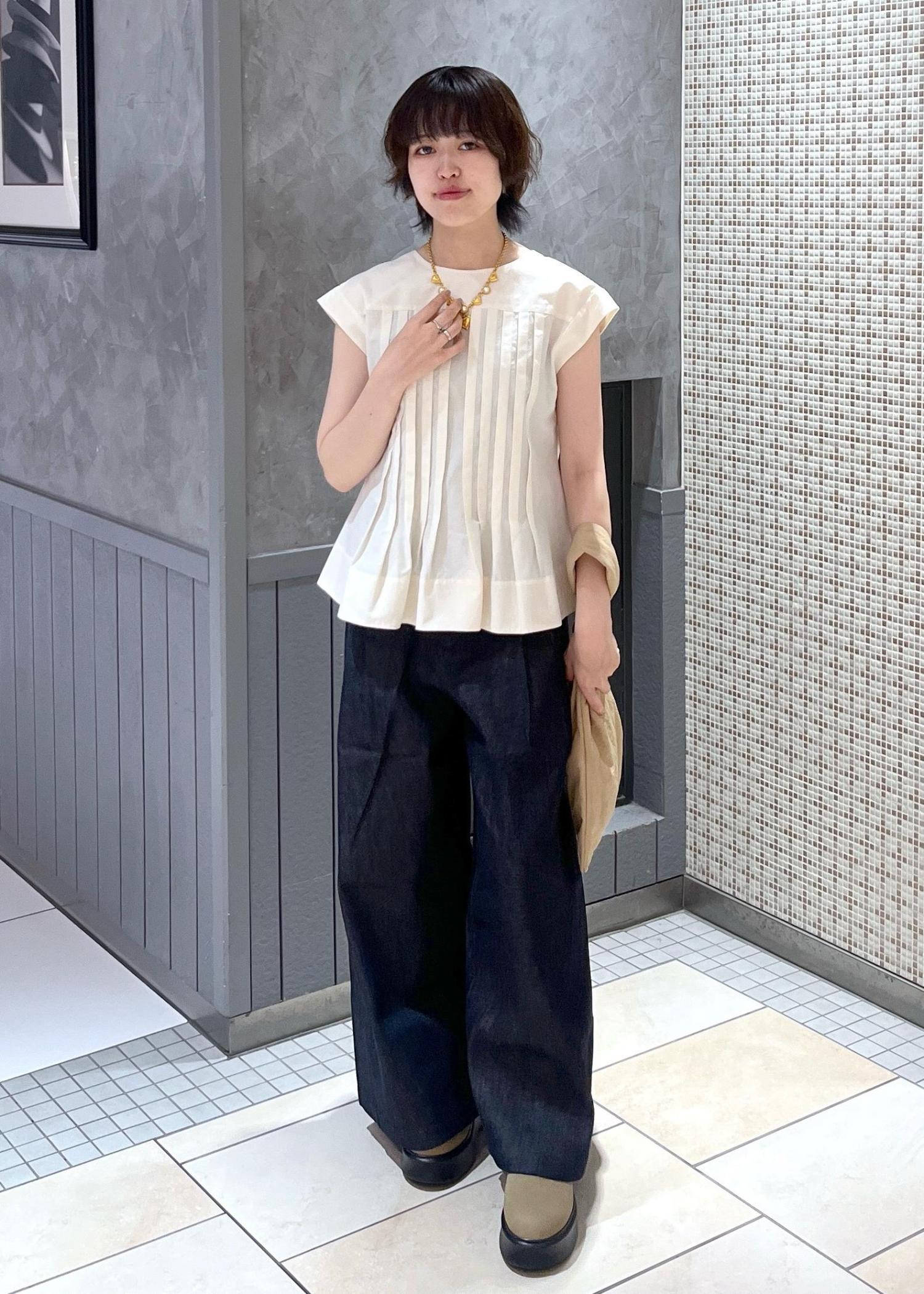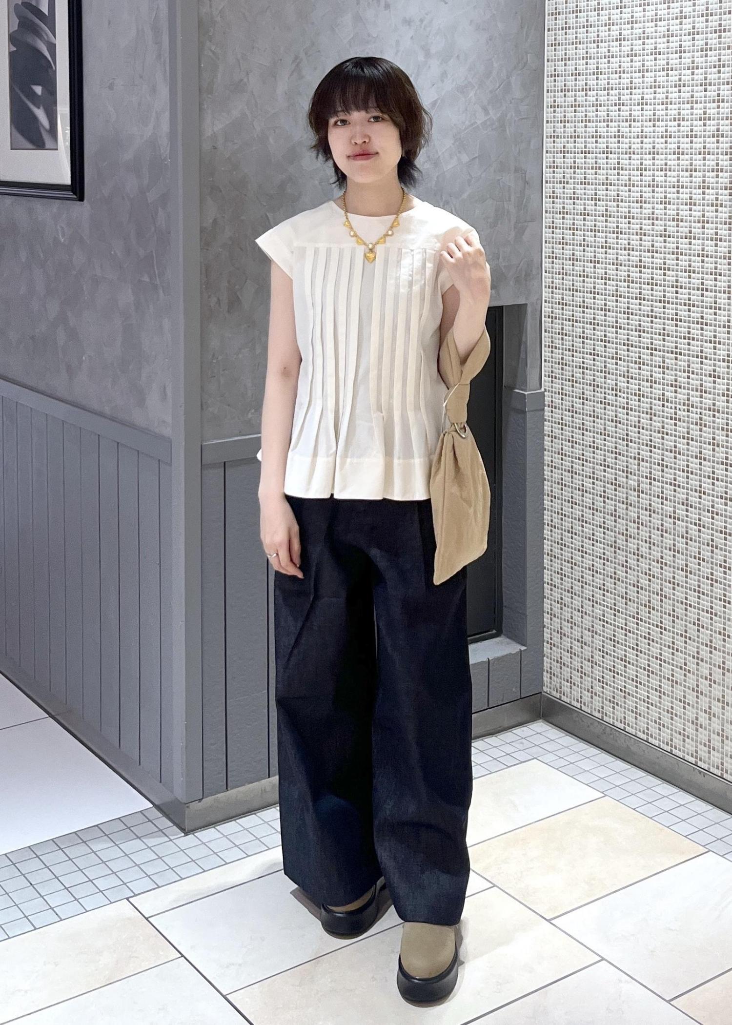 今回はツイストシームワイドデニムを使ったコーディネートを組んでみました。ワイドシルエットですが、タックが入っているのでトップス次第できれいめカジュアルにも◎