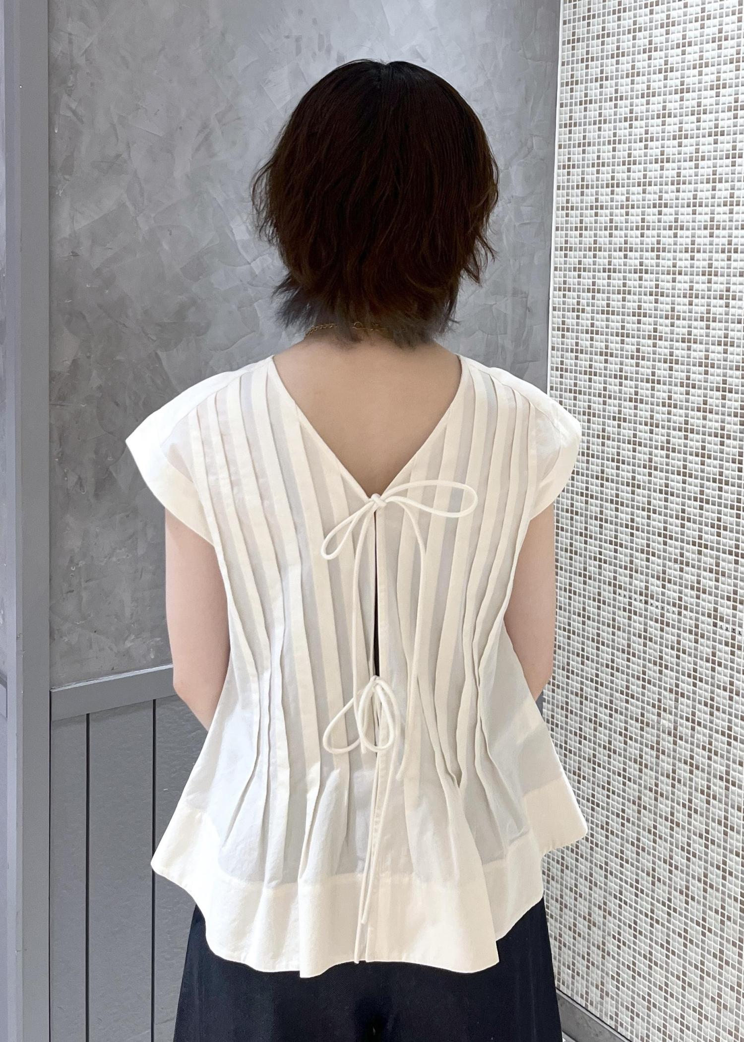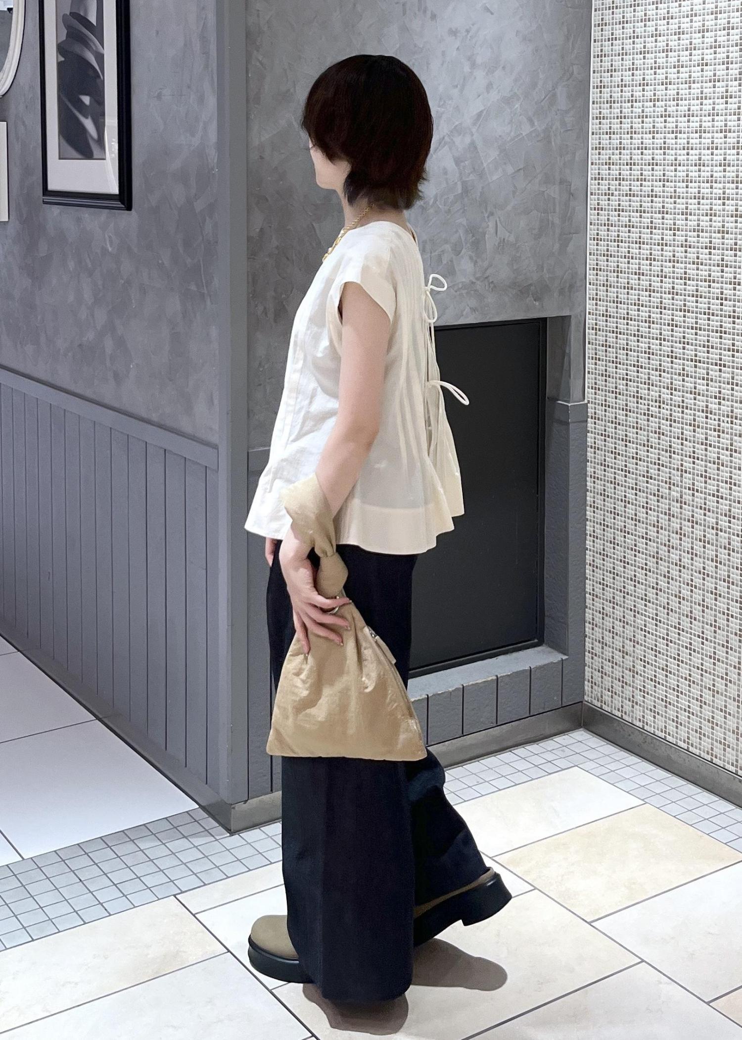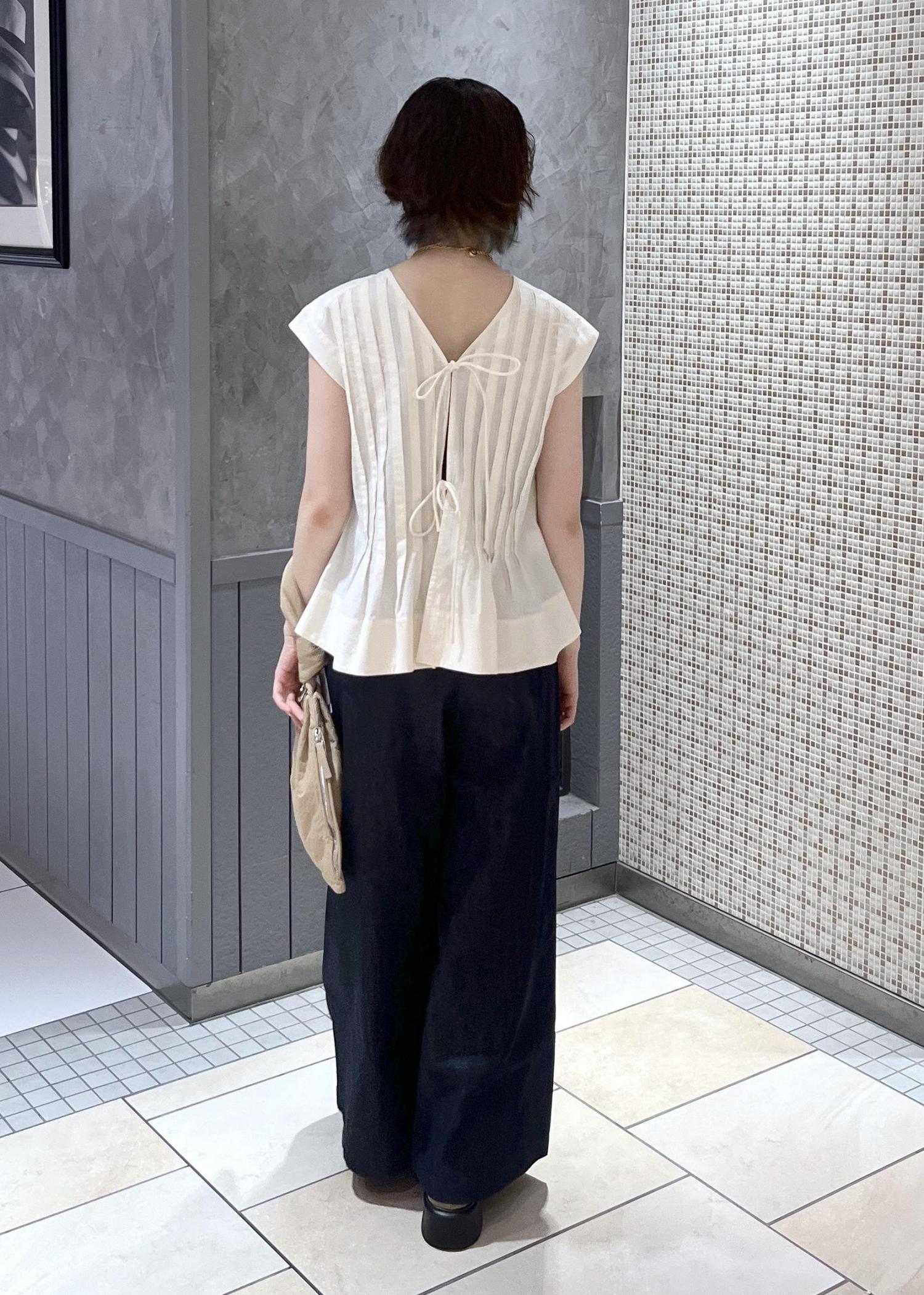 ADAM ET ROPÉ FEMME【サステナブル】タックフレアジレブラウスキナリ / F¥15,950レビュー今回はリボンをバックにブラウスとして着用しました。腰まわりもややカバーしてくれる長さあります。リボンを前にすると首元スッキリでチョーカーも映えますよ◎