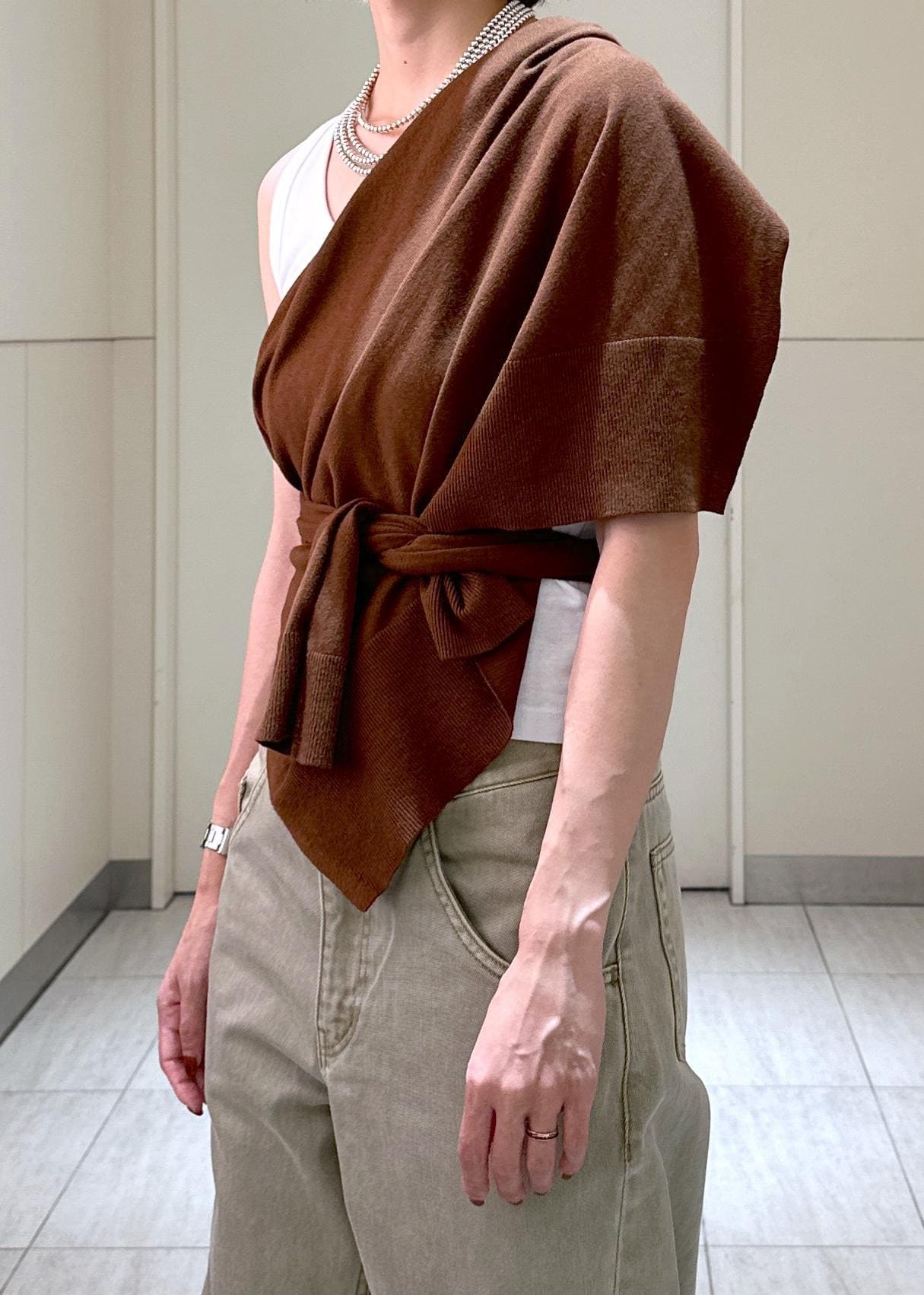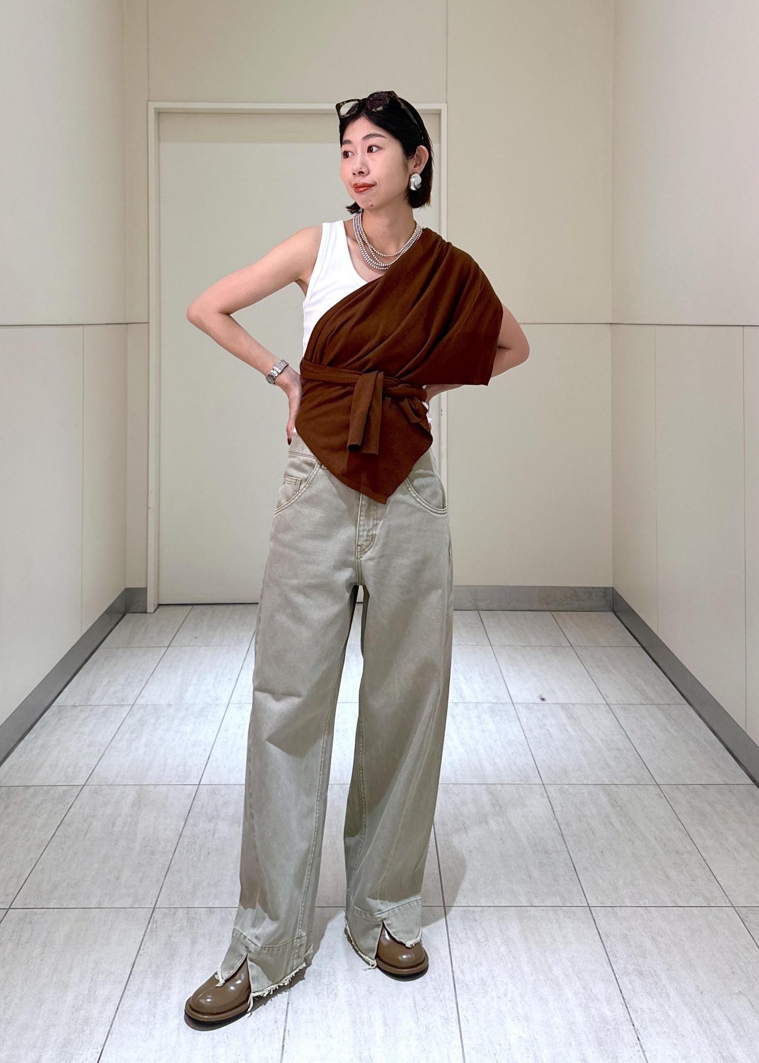 猛暑日続きでまだ着るには暑い。でも秋を先取り意識といった感じでこうやって巻いたりするのもいいかもしれないですね!