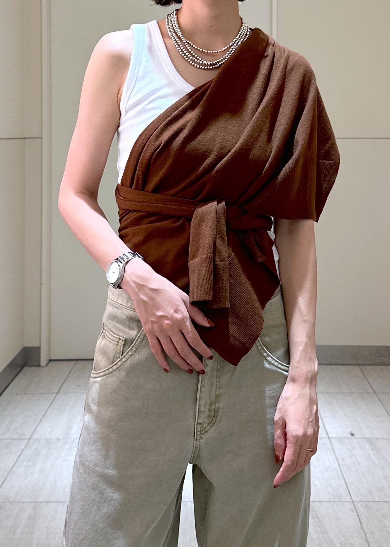 アウトレットADAM ET ROPÉ FEMMEラップストールコンビノースリーブプルオーバーブラウン / F¥12,551レビューニットベストとストールとがセットになっているアイテムです。別々で使ったりも出来てコーディネートが楽しめるアイテム。