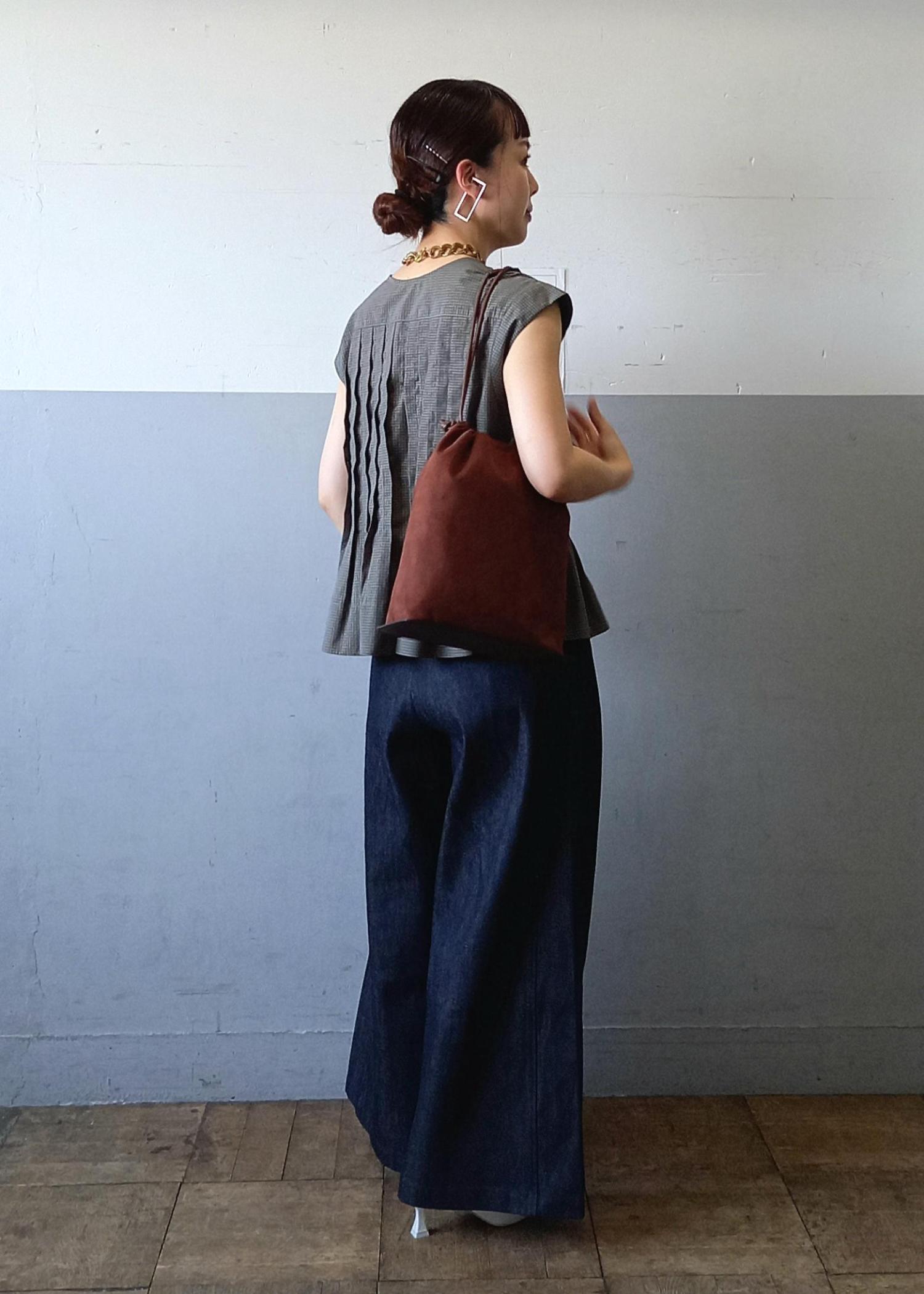巾着タイプですが底板が付いているので安定感があるのと、カジュアルすぎないモードな雰囲気に◎