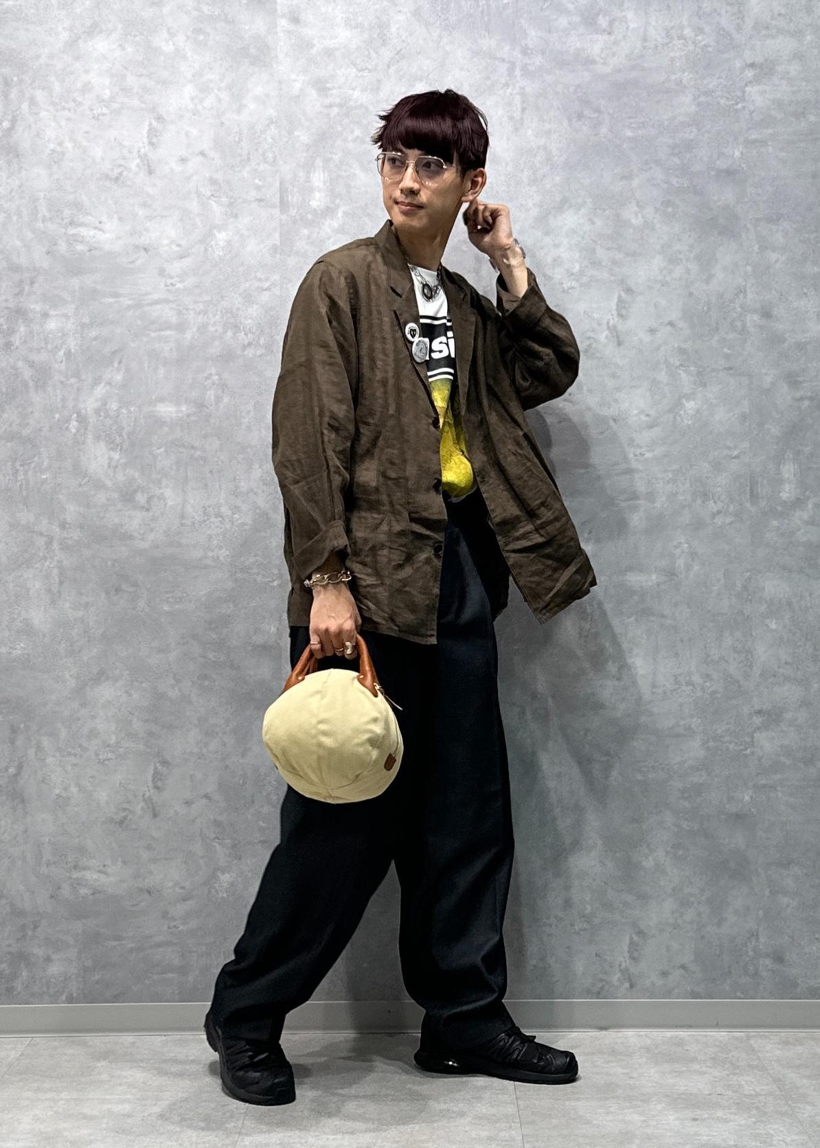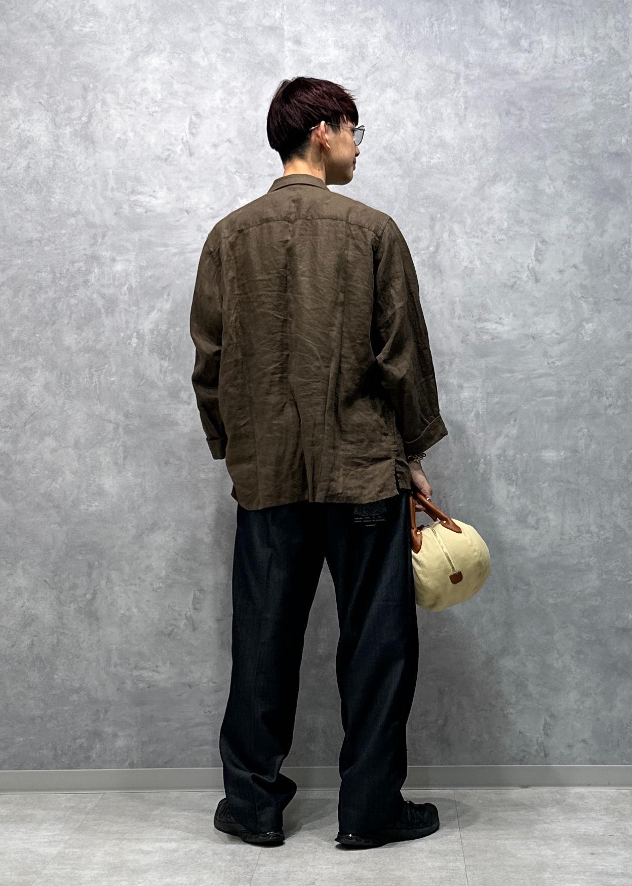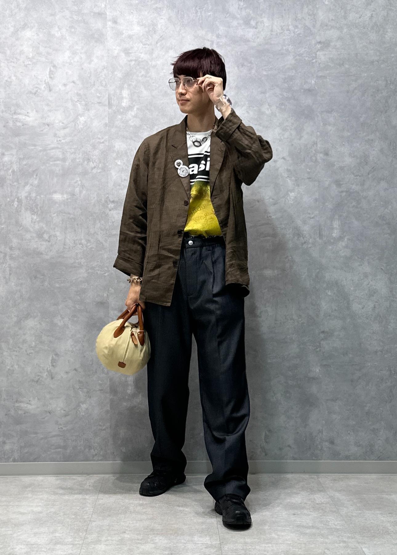 デニムスラックスにカーキのリネンシャツジャケットを合わせたカーキが際立つアースカラーコーデです。渋くなりすぎないようにインナーに明るい黄色を着ました。色味と素材感がかっこいい、大人っぽいコーデに仕上げました。