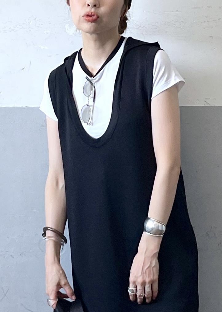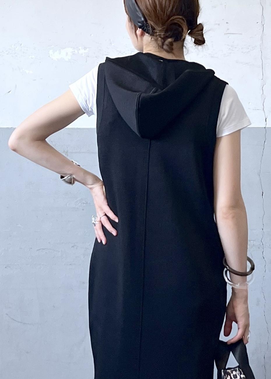 ストンとした美シルエットですが、フード付きでカジュアル感も。
